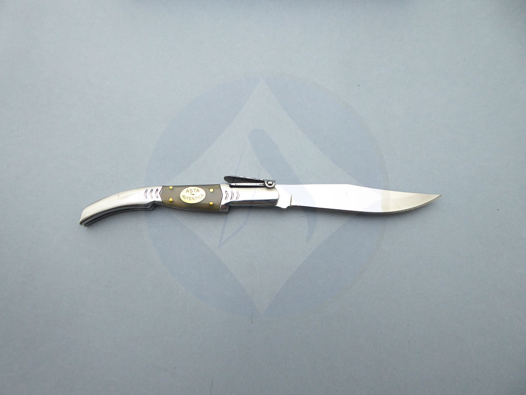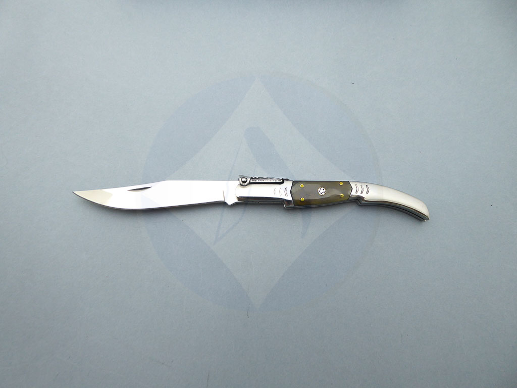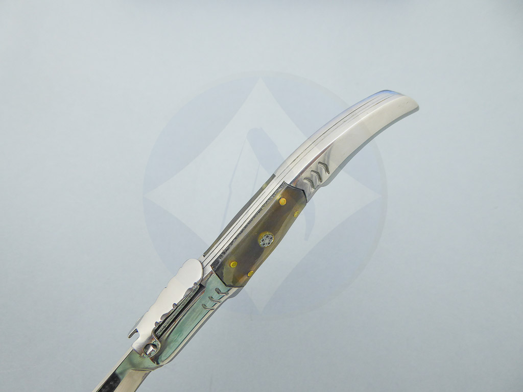 Descripción: Navaja árabe con mango de asta de toro y virola de acero. Hoja de acero inoxidable molibdeno vanadio con carraca. El muelle es de acero con palanquilla. Disponible en diferentes acabados.