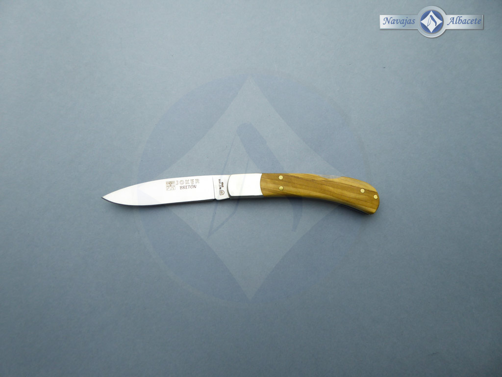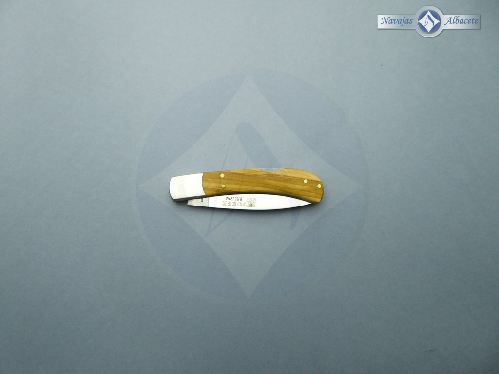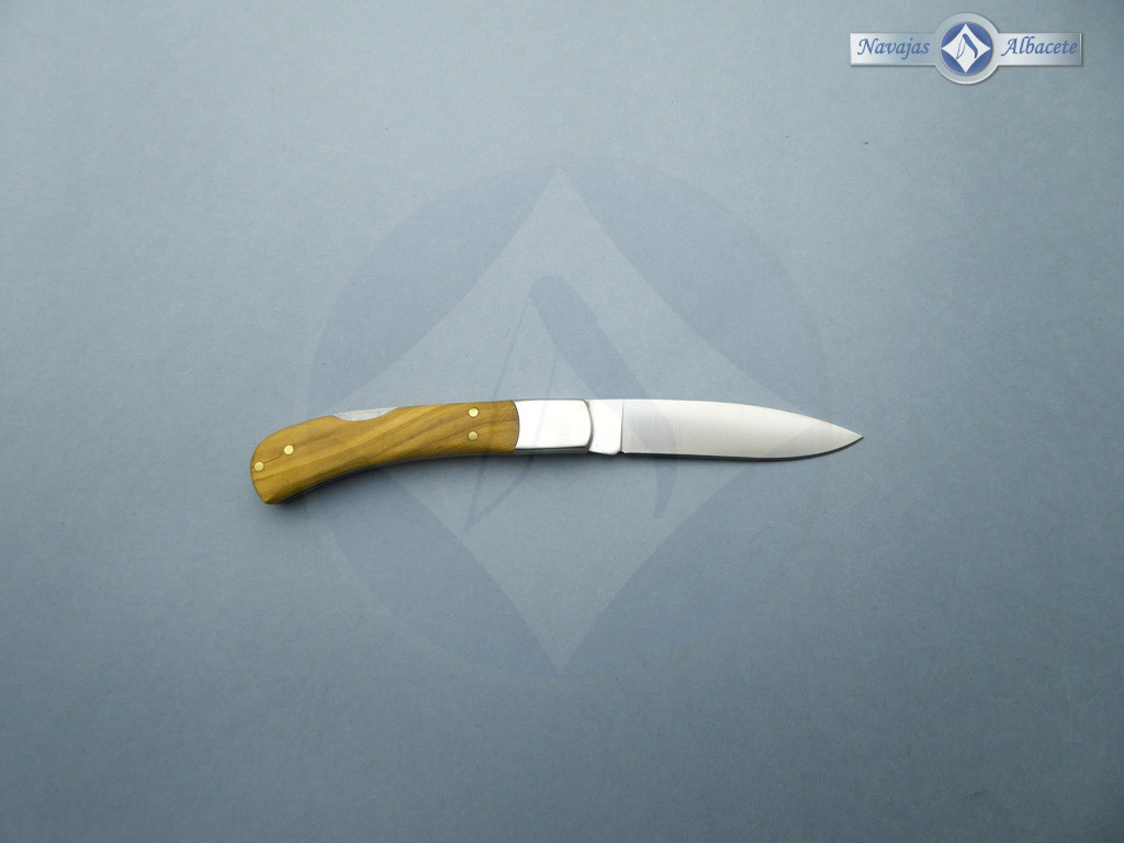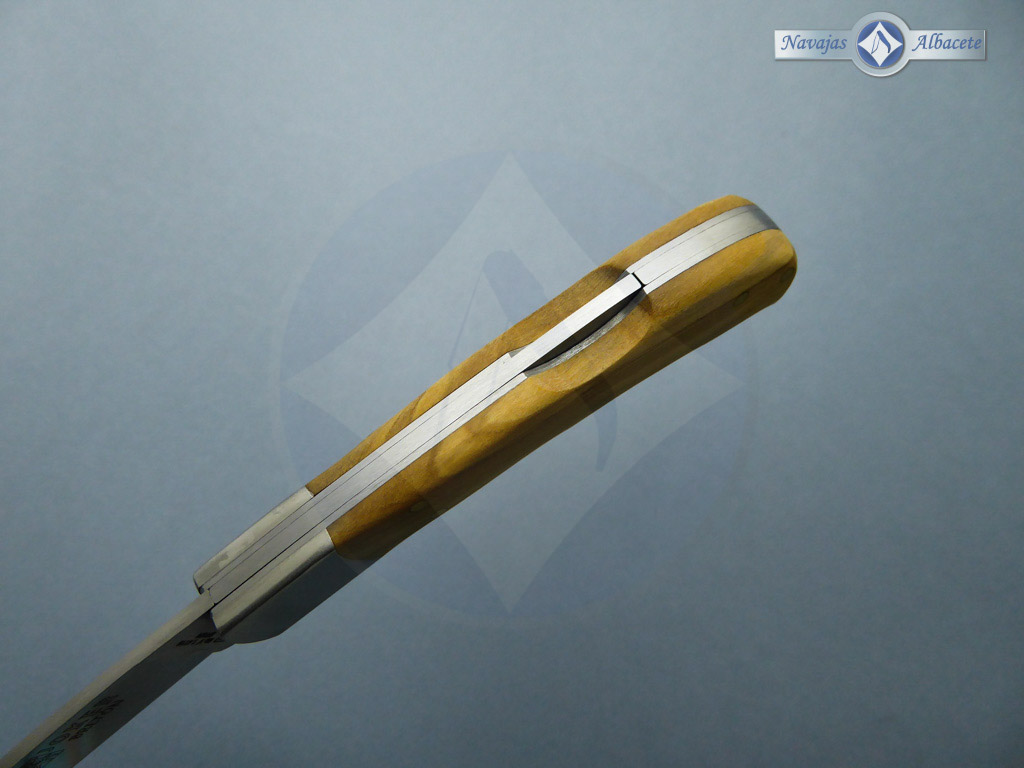 Descripción: Navaja artesana «Bretón» con mango en madera de olivo y virola de acero. Hoja de acero inoxidable molibdeno vanadio. Hecha a mano en Albacete. Bloqueo de seguridad Back Lock.
