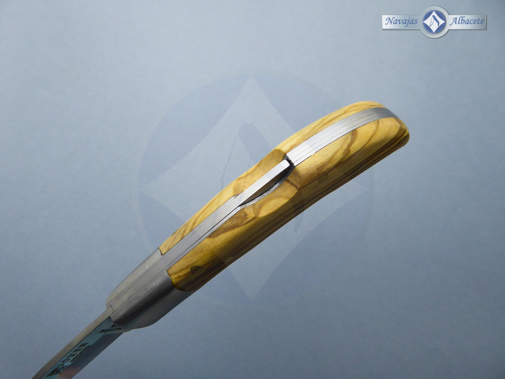 Descripción: Navaja artesana «Pointer» con mango en madera de olivo y virola de acero. Hoja de acero inoxidable molibdeno vanadio. Hecha a mano en Albacete. Bloqueo de seguridad Back Lock