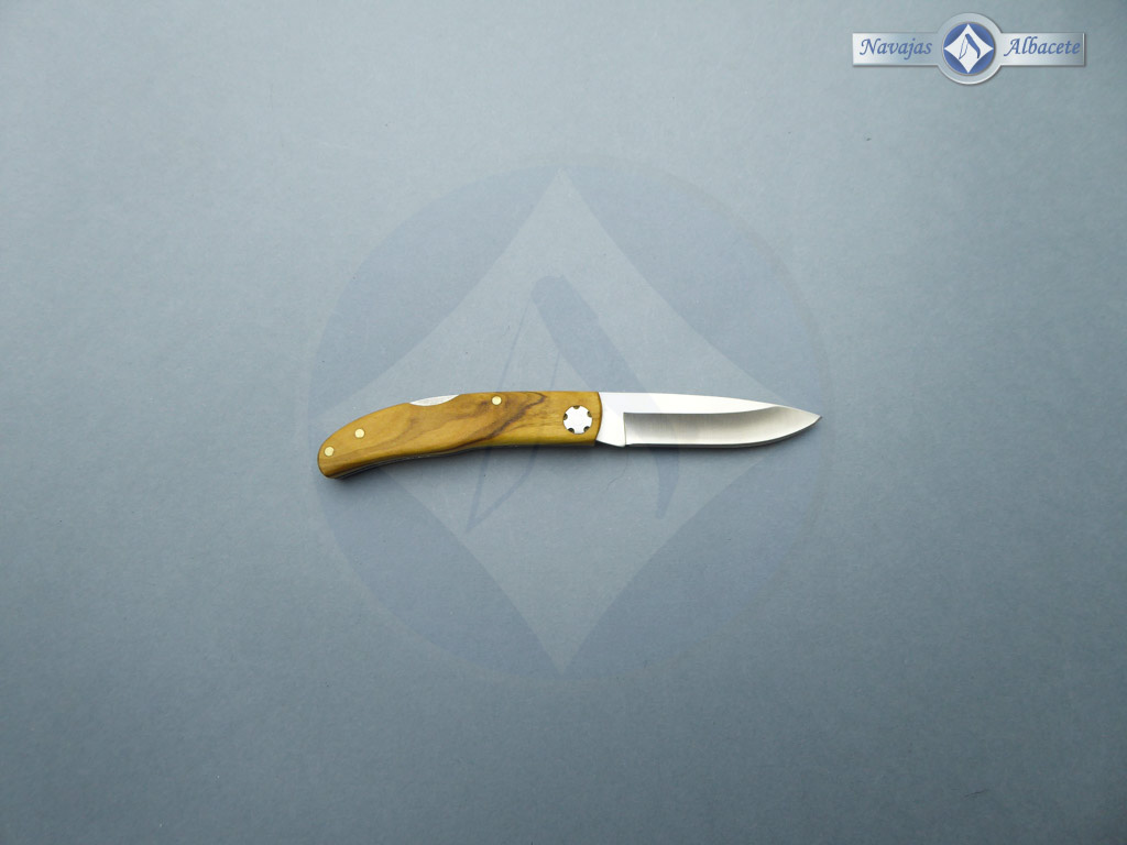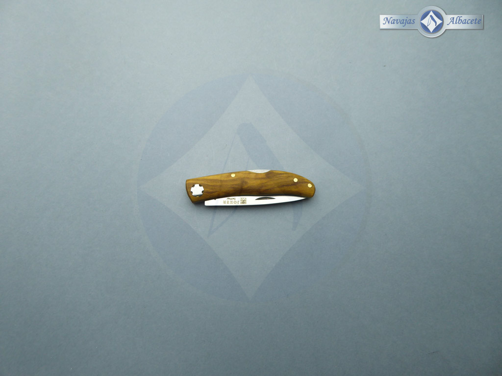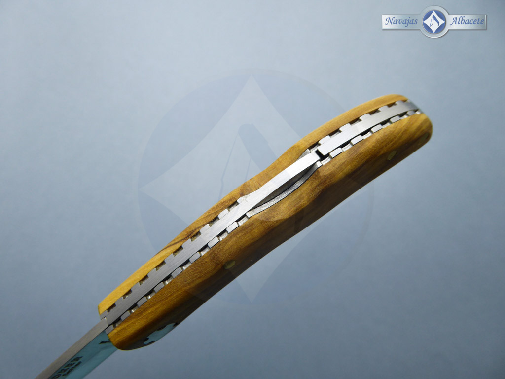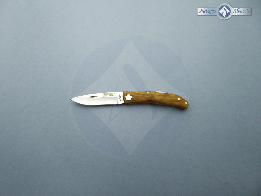 Descripción: Navaja artesana «Setter», tamaño bolsillo, con mango en madera de olivo. Hoja de acero inoxidable molibdeno vanadio con uña para su fácil extracción. Lomo dentado. Bloqueo de seguridad Back Lock.