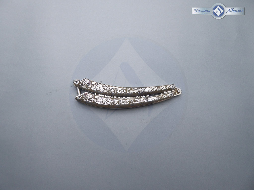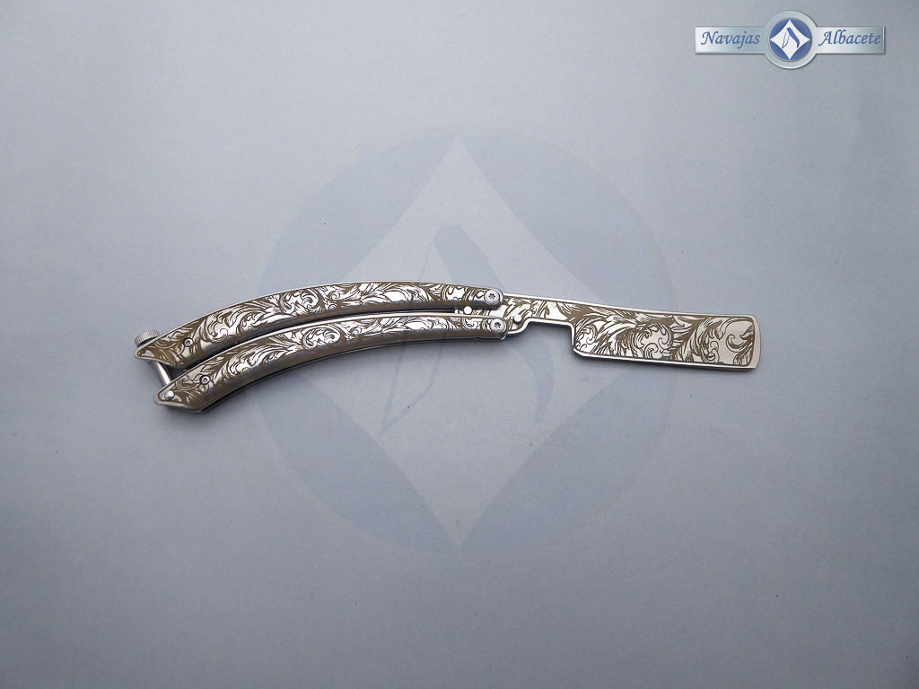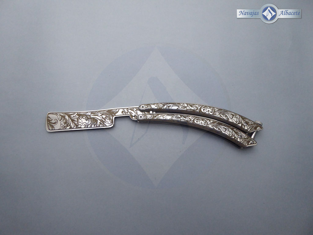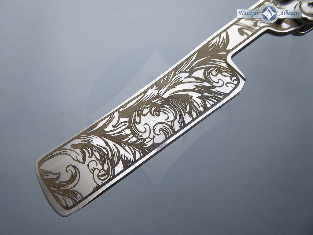 Descripción: Navaja barbera de abanico con mango de acero decorado y hoja de acero inoxidable también decorada. Bloqueo de seguridad en el pomo. Uso no profesional. Diseñada en España