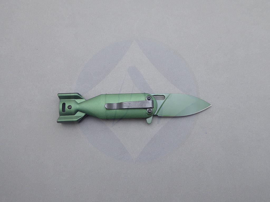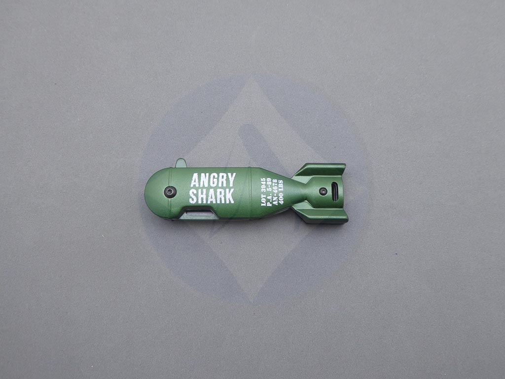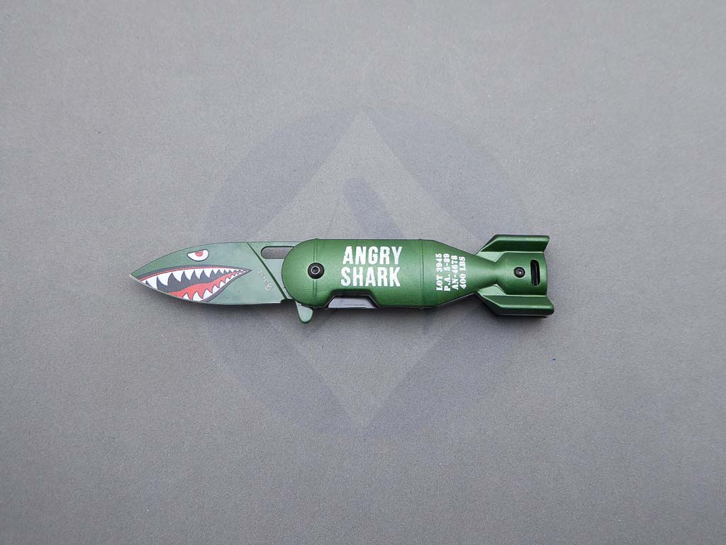 Descripción: Navaja «Angry Shark» con mango de aluminio con diseño en 3D y hoja de acero inoxidable molibdeno vanadio color verde con dibujo 3D . Sistema de bloqueo Liner lock. Incluye clip trasero.