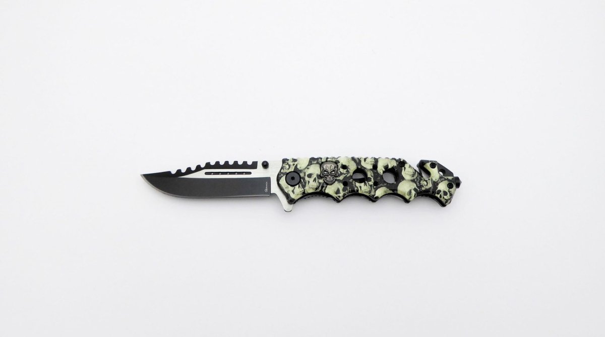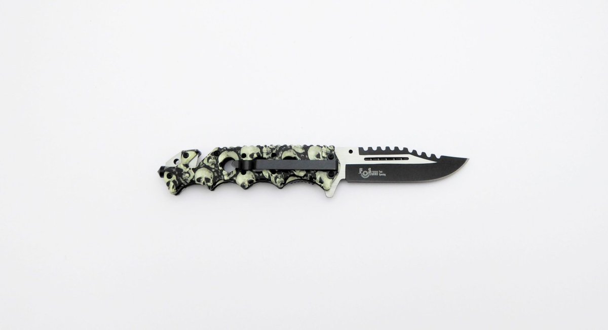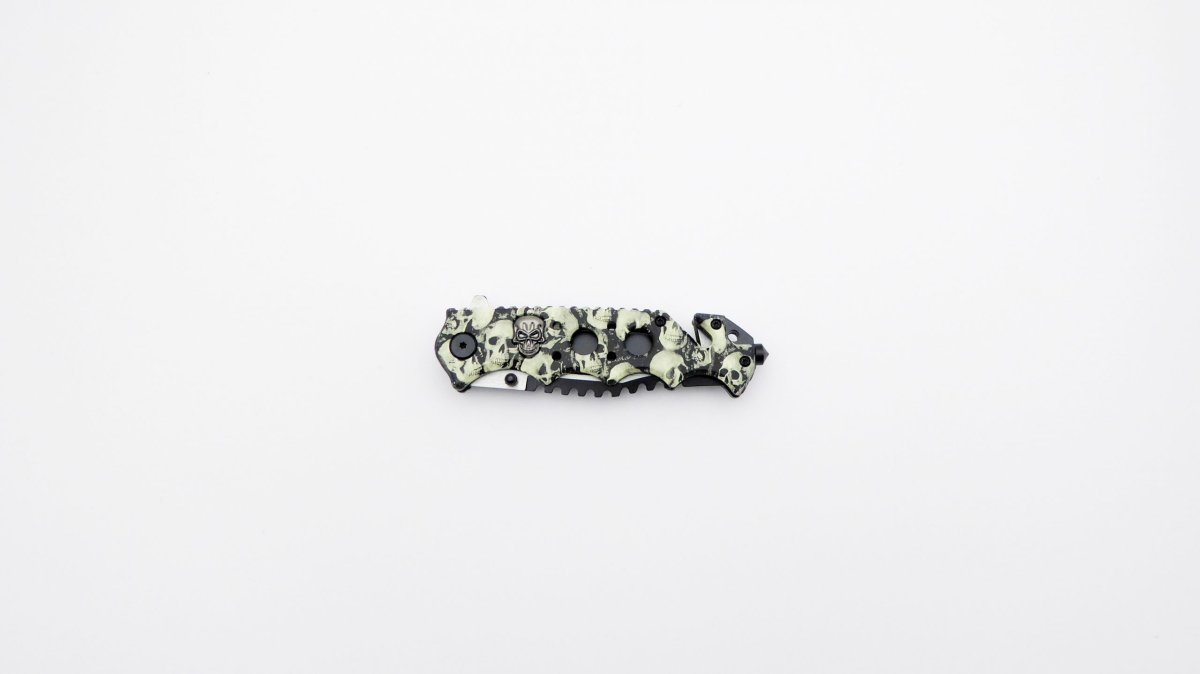 Descripción: «Calaveras» Navaja táctica con mango en aluminio impreso con calaveras. Hoja en acero molibdeno vanadio calada con acabado negro y satinado. Clip porta cinturón, punta rompe cristales, bloqueo de seguridad liner lock y cúter corta cinturón de una cuchilla. Sistema de apertura asistida rápida.