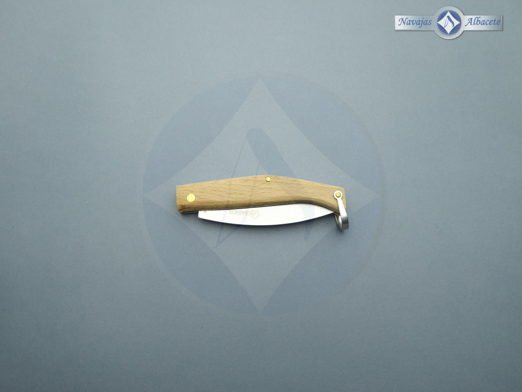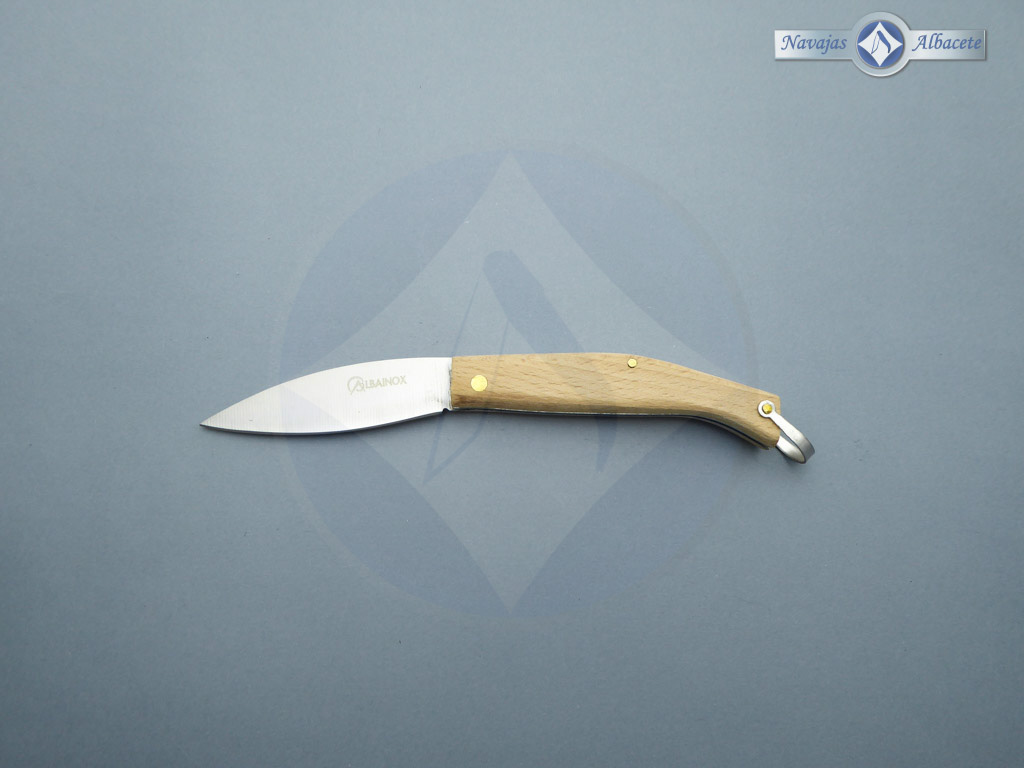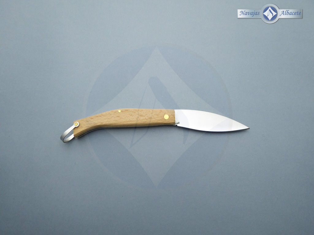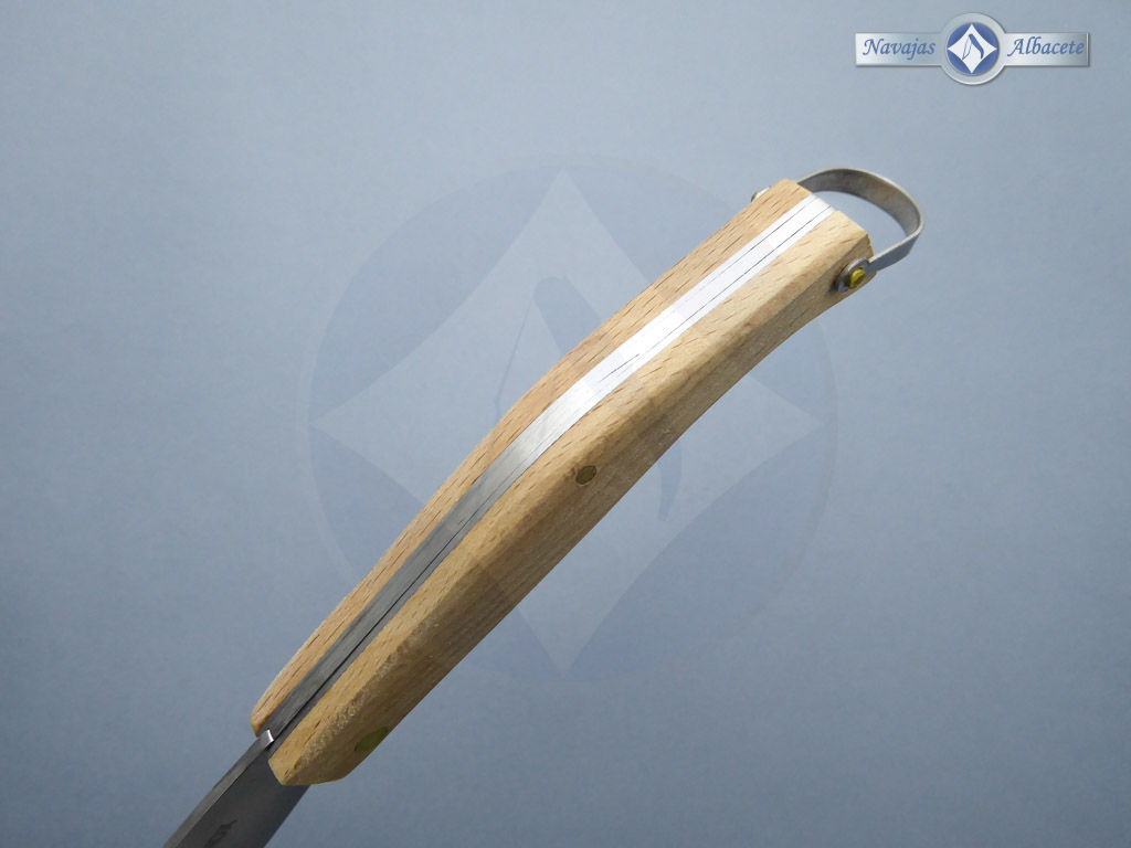 Descripción: Navaja con mango de madera natural. Hoja de acero inoxidable molibdeno vanadio acabado satinado. Cierre de pistón. Con anilla plegable. Disponible en dos tamaños de hoja, seleccione la opción que desee