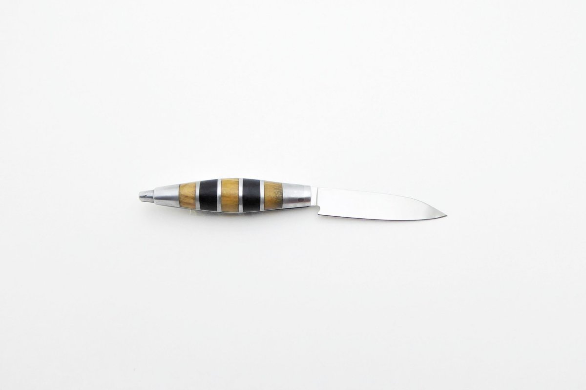 Descripción: Navaja canaria con mango en madera stamina natural y negra, combinada con aluminio, virola y rebajo en aluminio. Hoja de acero inoxidable cromado, con uña para su fácil extracción. El muelle es de pistón en acero.