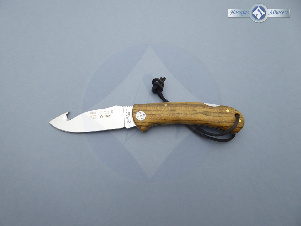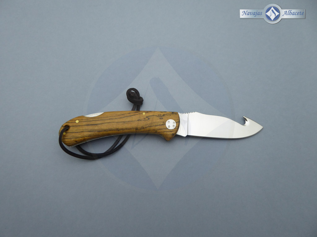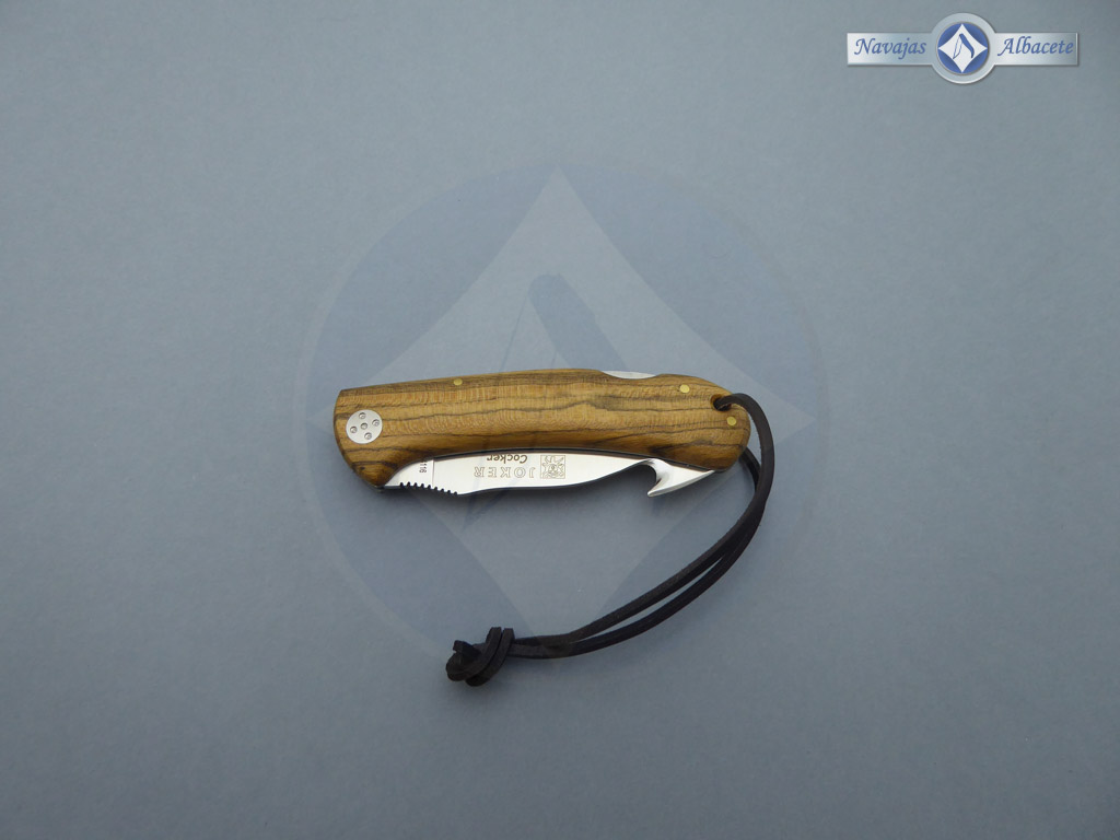 Descripción: Navaja de caza «Cocker» artesana de gran calidad, muy robusta, con mango de bocote y cordón de cuero en el pomo. Hoja de acero inoxidable mova de gran resistencia, con desollador. Bloqueo de seguridad Back lock. Hecha a mano en Albacete.
