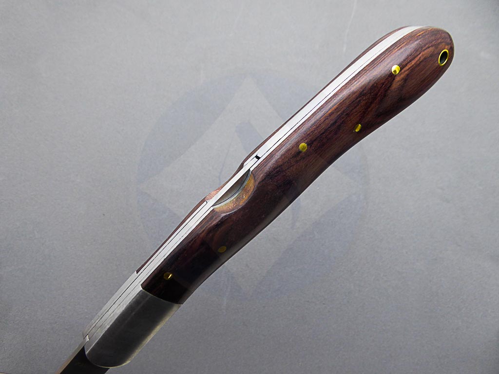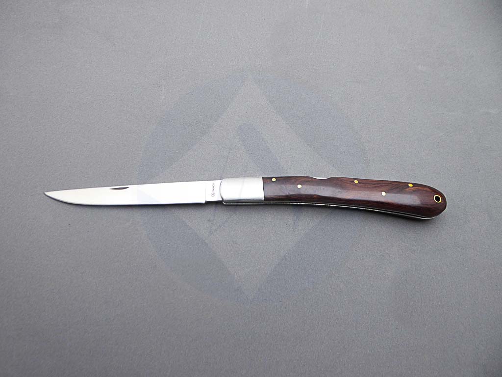 Descripción: Navaja clásica con mango de madera stamina y virola de acero. Hoja de acero inoxidable molibdeno vanadio, con uña para su fácil extracción. Sistema de bloqueo back lock.