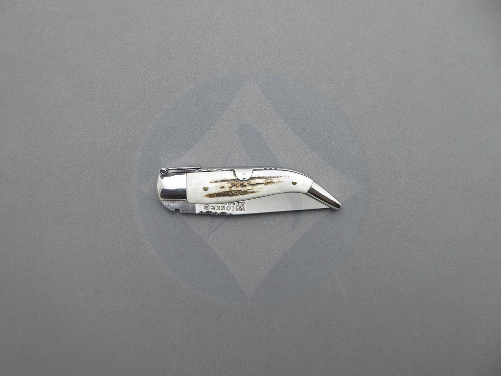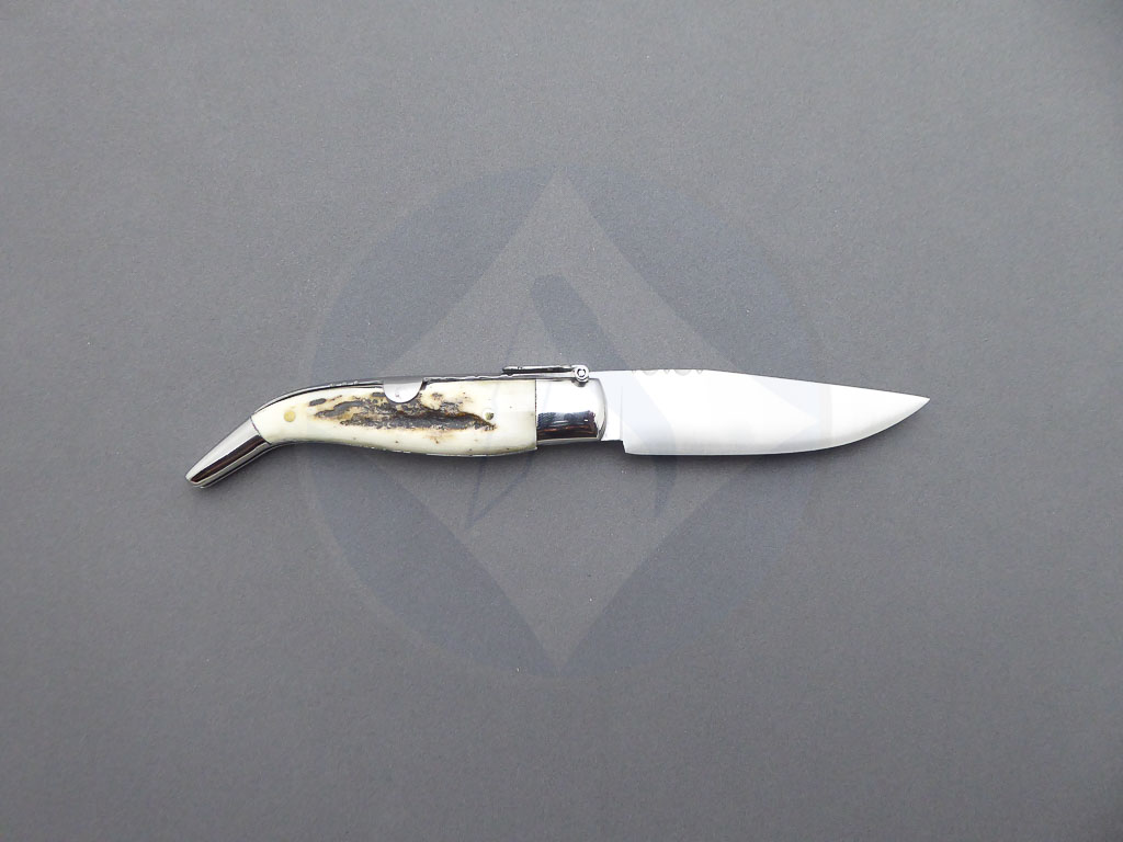 Descripción: Navaja clásica «Bandolera» albaceteña artesana con puño en auténtica asta de ciervo, virola y rebajo en acero inoxidable. Hecha a mano en Albacete. Hoja de acero inoxidable molibdeno vanadio. El muelle es de acero con palanquilla. Incluye estuche.