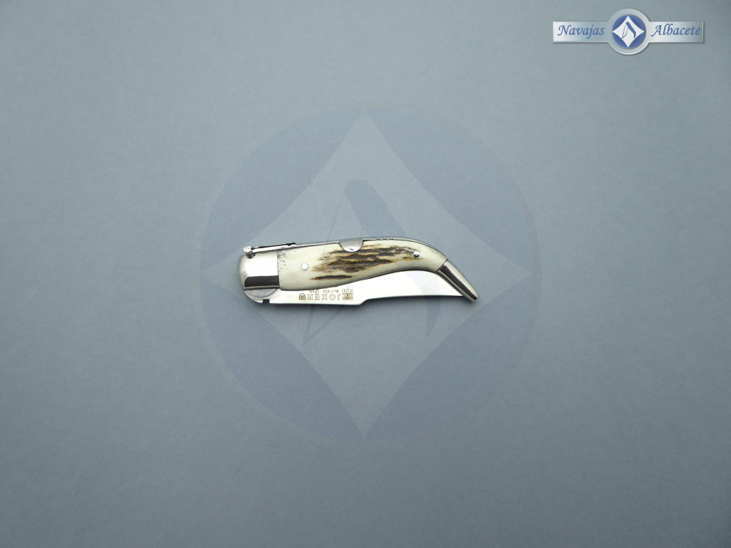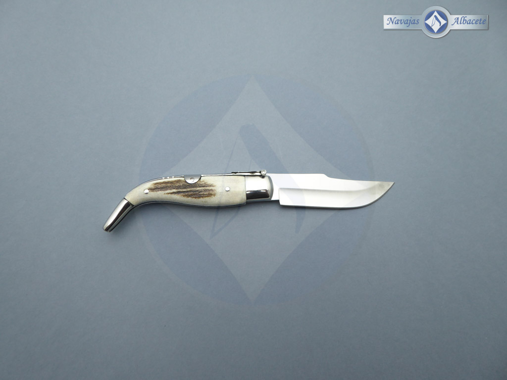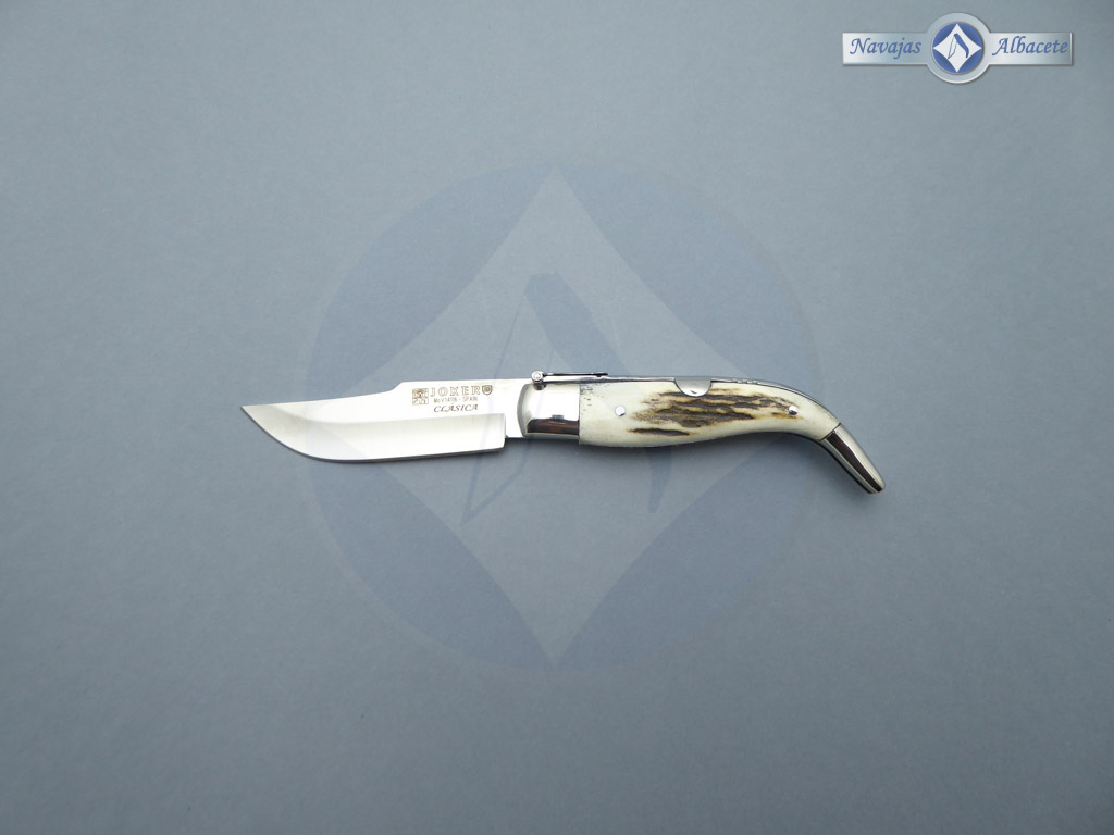 Descripción: Navaja albaceteña artesana con puño en auténtica asta de ciervo, virola y rebajo en acero inoxidable. Hecha a mano en Albacete. Hoja de acero inoxidable molibdeno vanadio. El muelle es de acero con palanquilla. Incluye caja-estuche color negro Joker.