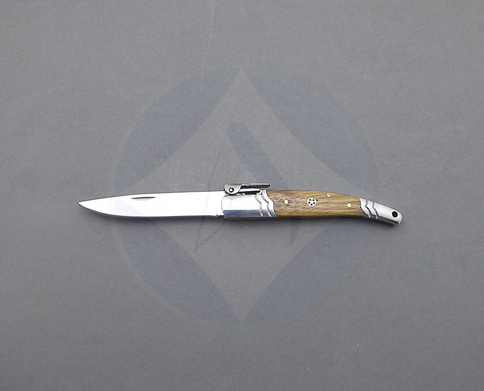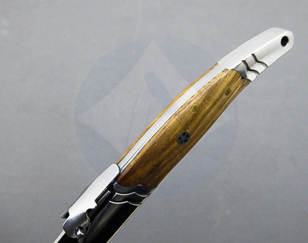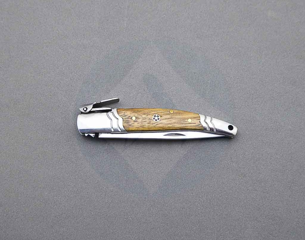 Descubre la combinación perfecta entre tradición y utilidad con esta navaja clásica con palanquilla. Diseñada como una herramienta de corte versátil, destaca por su exquisito mango elaborado en madera de cebra, adornado con un delicado mosaico y reforzado con una resistente virola de acero. Es la compañera ideal para tus excursiones de senderismo, días de camping o como una preciada pieza de coleccionismo.
