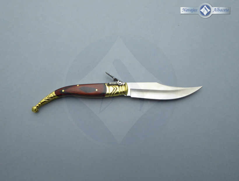 Descripción: Navaja clásica «Sevillana» artesanal, con puño de madera stamina prensada, virola y rebajo decorados en latón. Hecha a mano en Albacete. Hoja de acero inoxidable molibdeno vanadio. El muelle es de acero con palanquilla. Disponible en 3 tamaños de hoja, seleccione la opción que desee.
