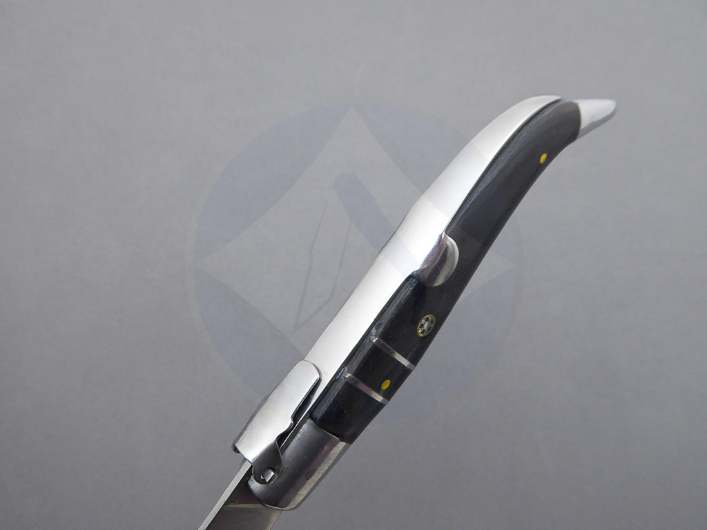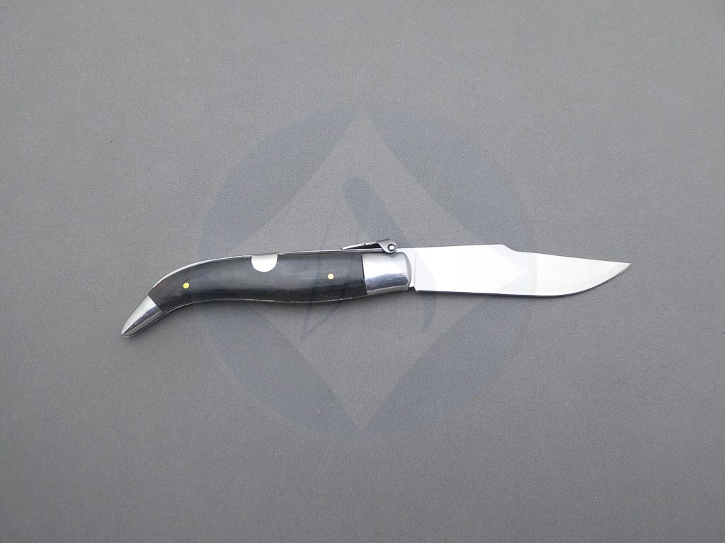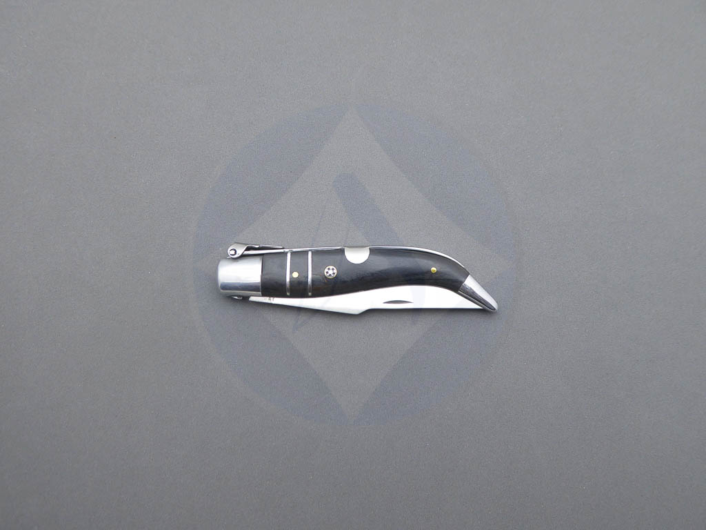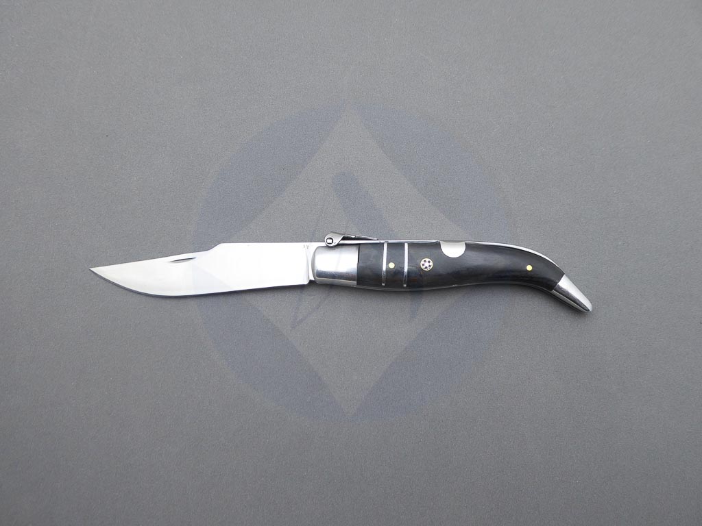 Descripción: Navaja clásica Teja con mango de madera stamina negra con mosaico, virola y rebajo en aluminio. Hoja de acero carbono. El muelle es de acero con palanquilla. Disponible en 2 tamaños de hoja, seleccione la opción que desee.