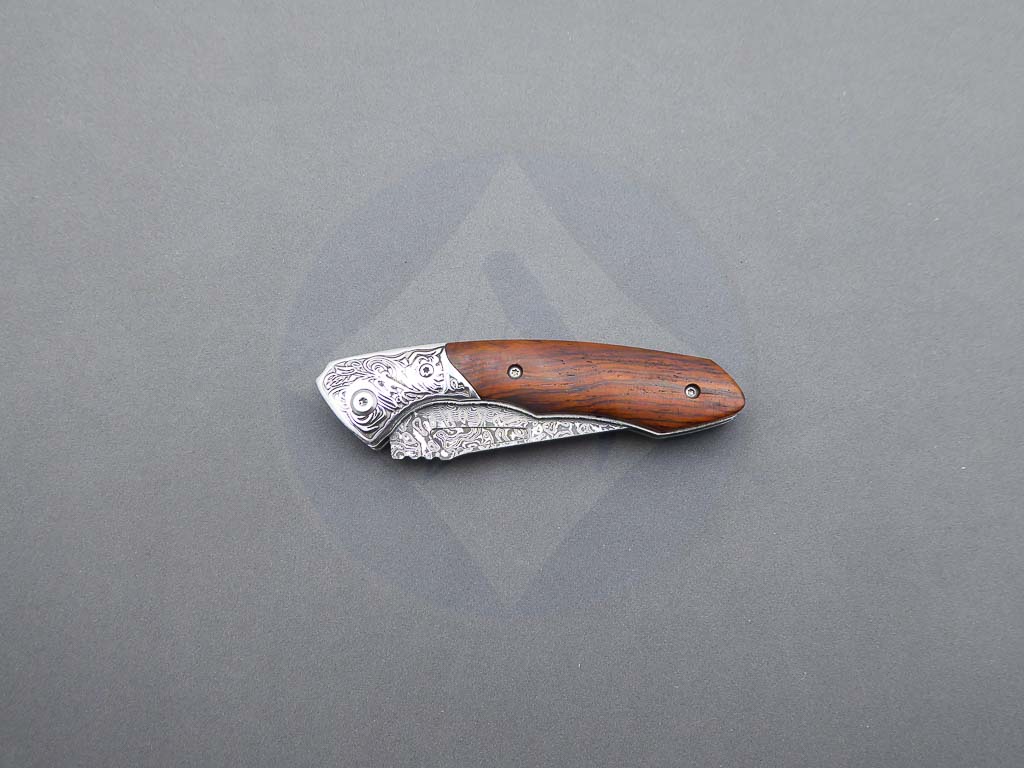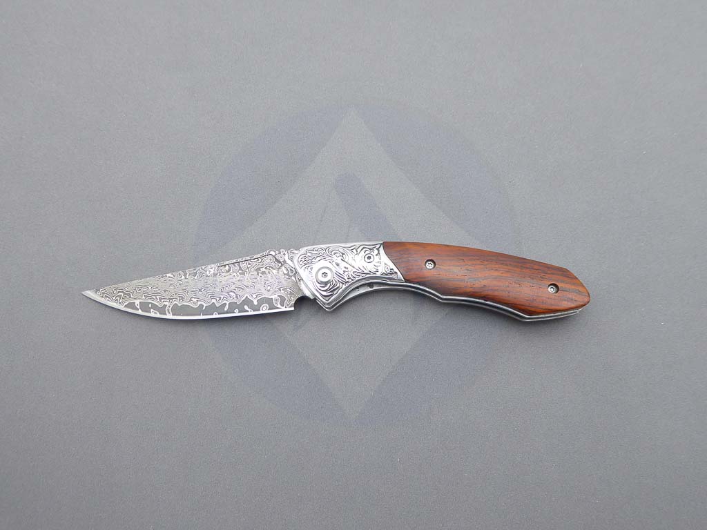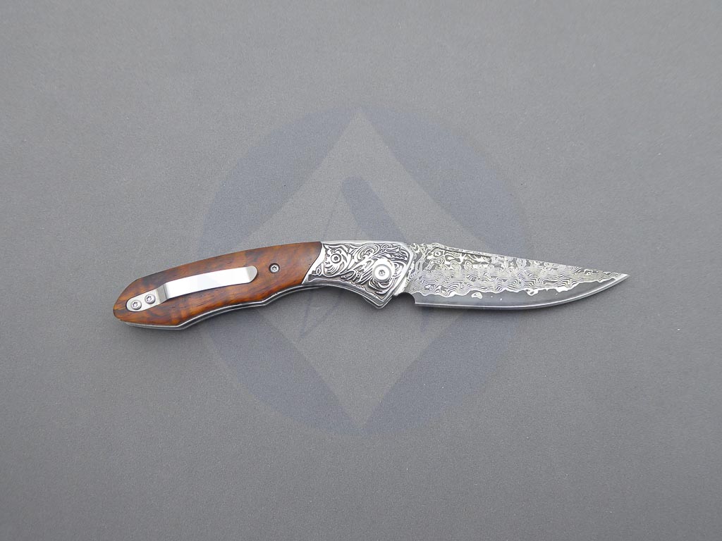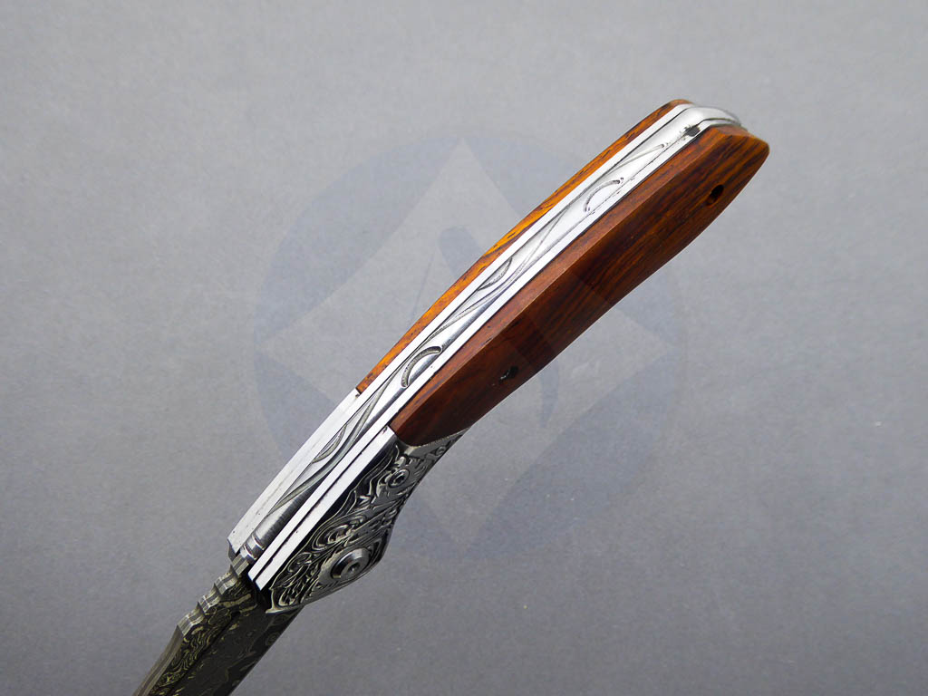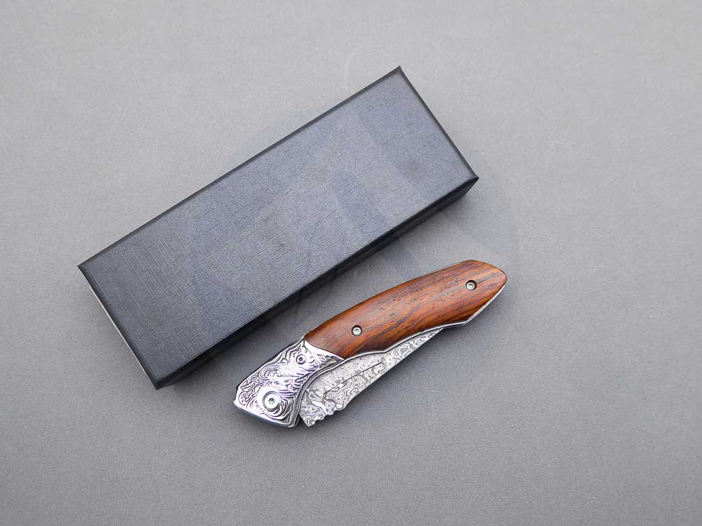 Descripción: Navaja damasco con mango de madera natural, atornillada, virola de acero decorado. Hoja de acero damasco 73 capas. Cierre de pistón. Incluye clip trasero para cinturón y caja imantada color negro.