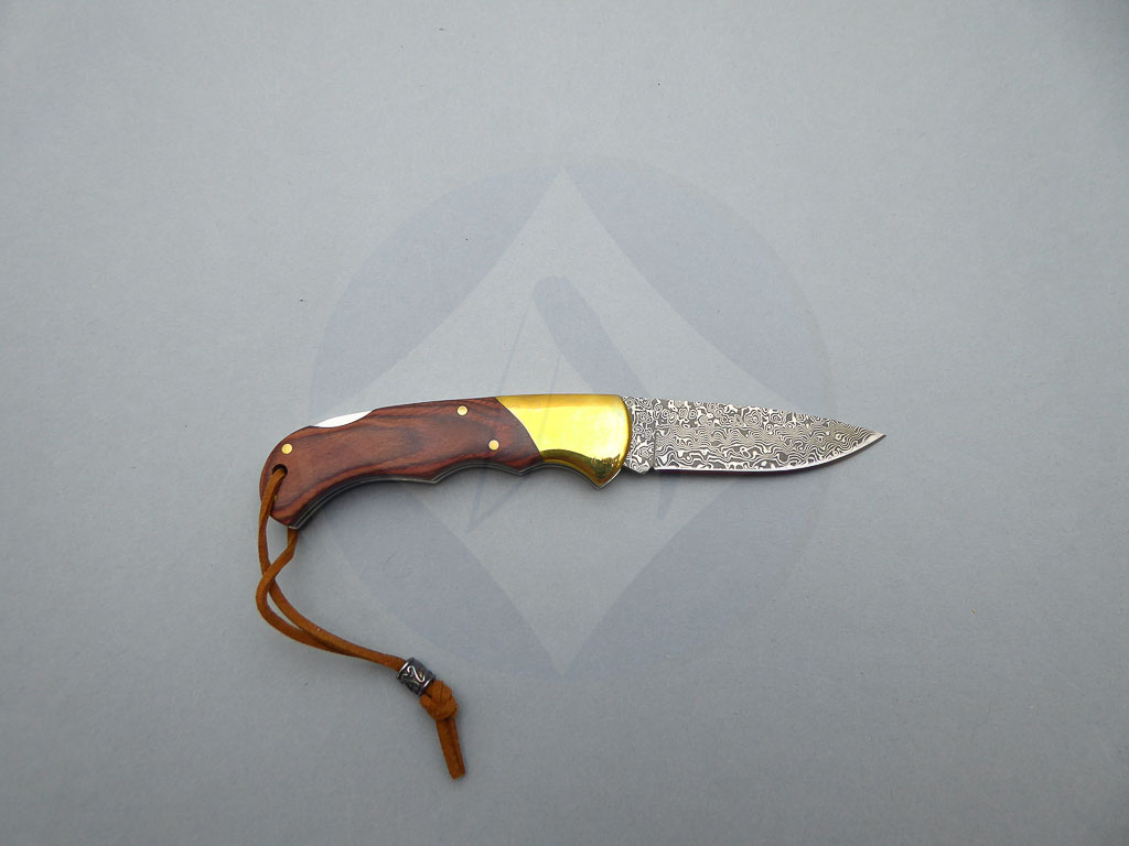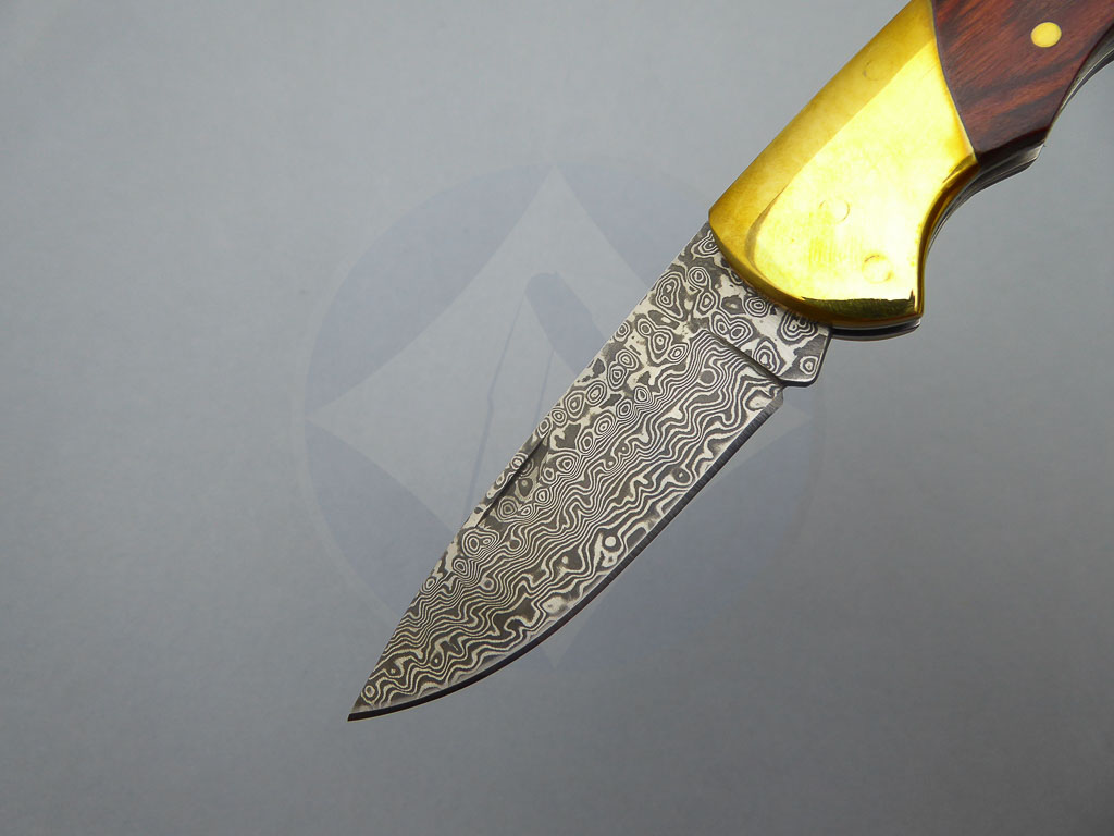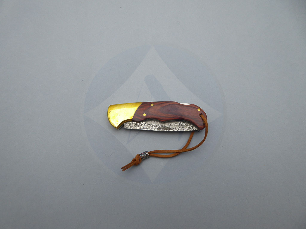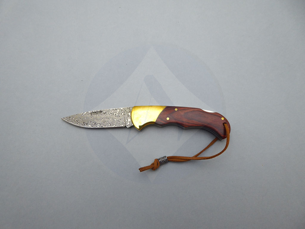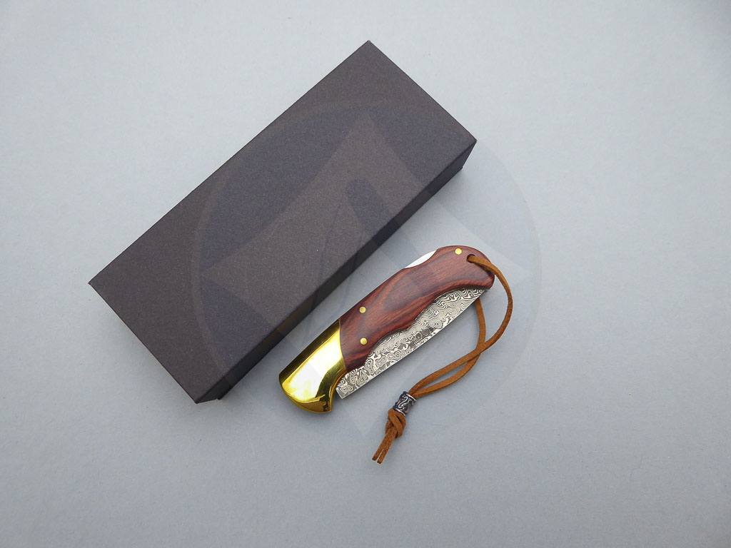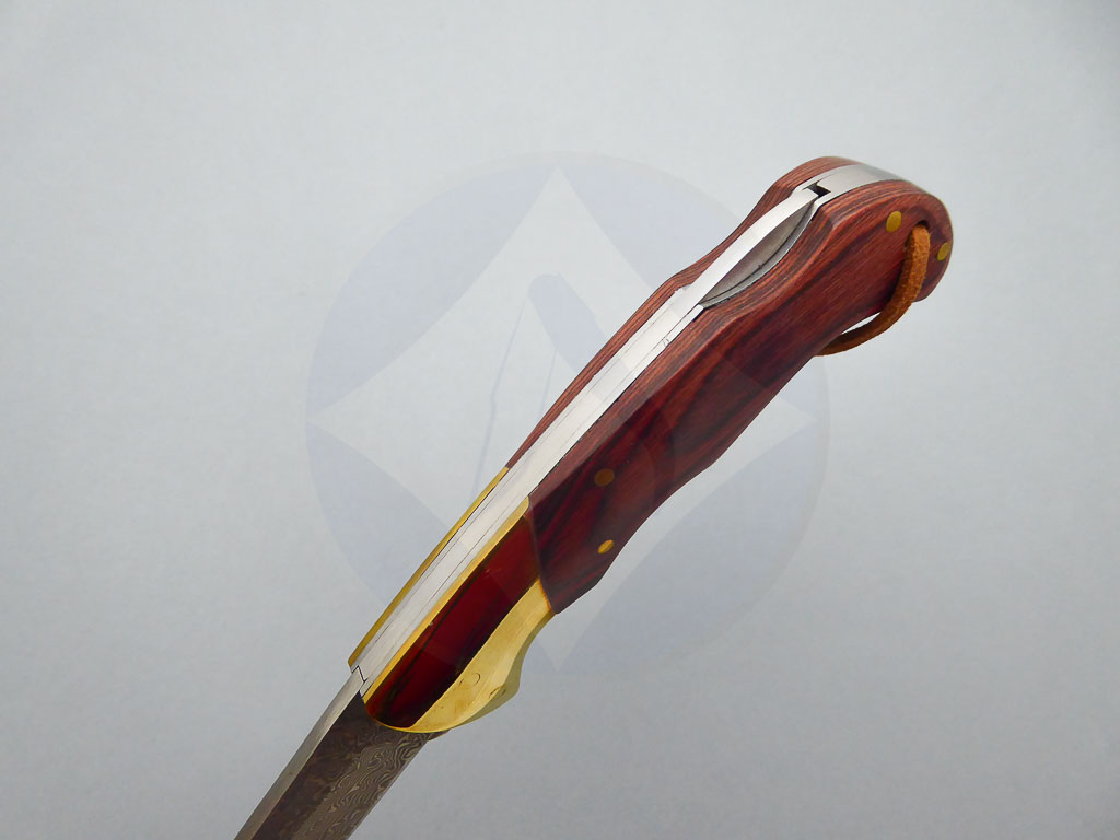 Descripción: Navaja damasco con mango de madera stamina roja y virola de alpaca, ojal con cordón de cuero en el pomo. Hoja de acero damasco de 73 capas, con uña para su fácil extracción. Bloqueo de seguridad Back lock. Incluye caja estuche imantada.