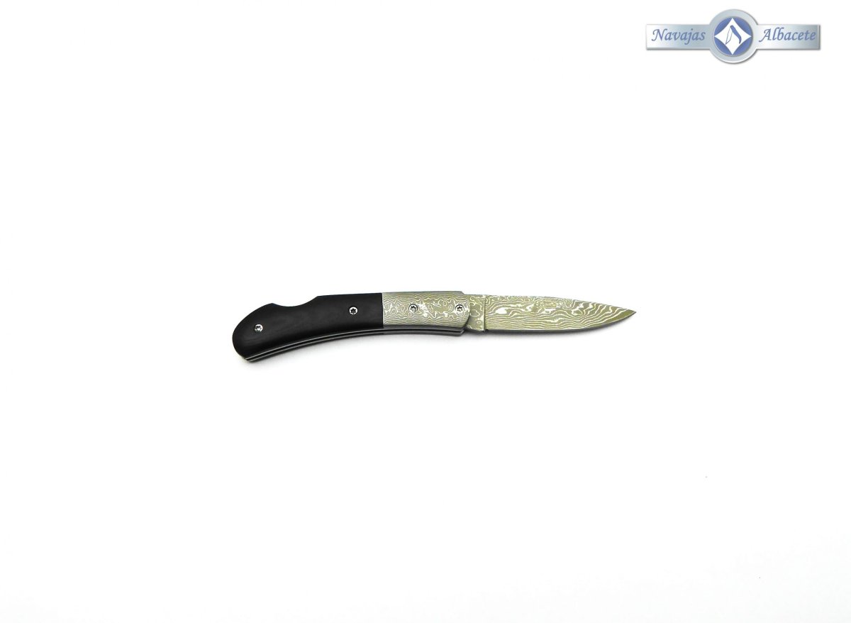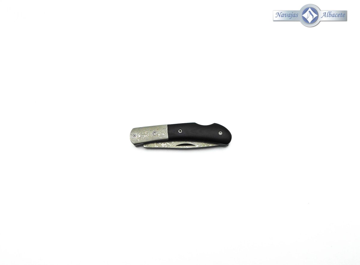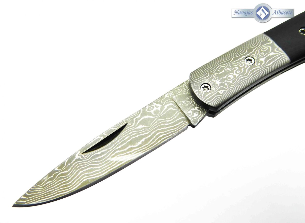 Descripción: Navaja damasco muy ligera con mango micarta negro y virola de acero damasco. Hoja en acero damasco de 71 capas, decorada a láser, con uña para su fácil extracción. Bloqueo de seguridad back lock.