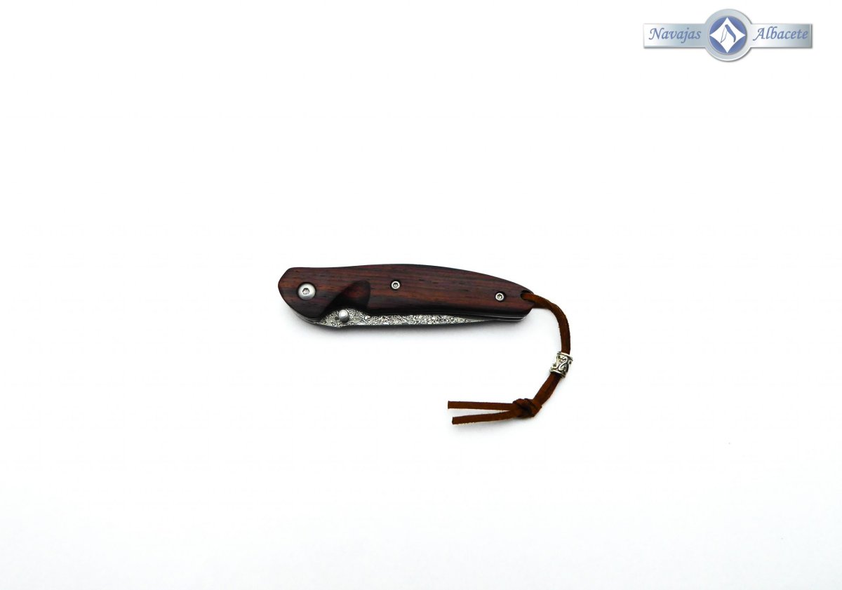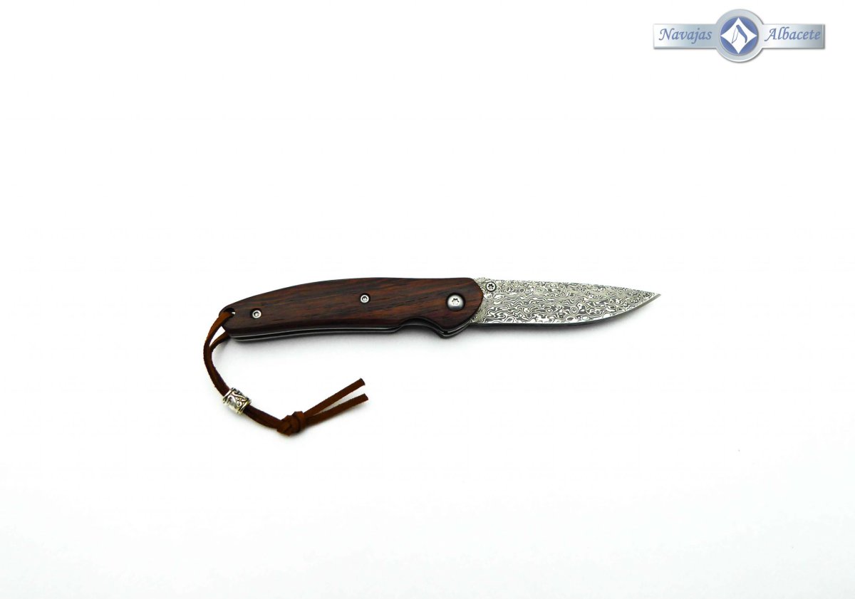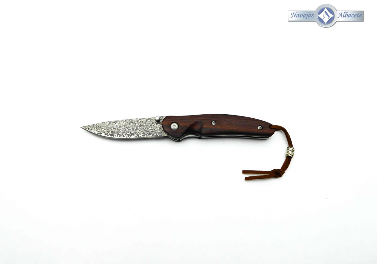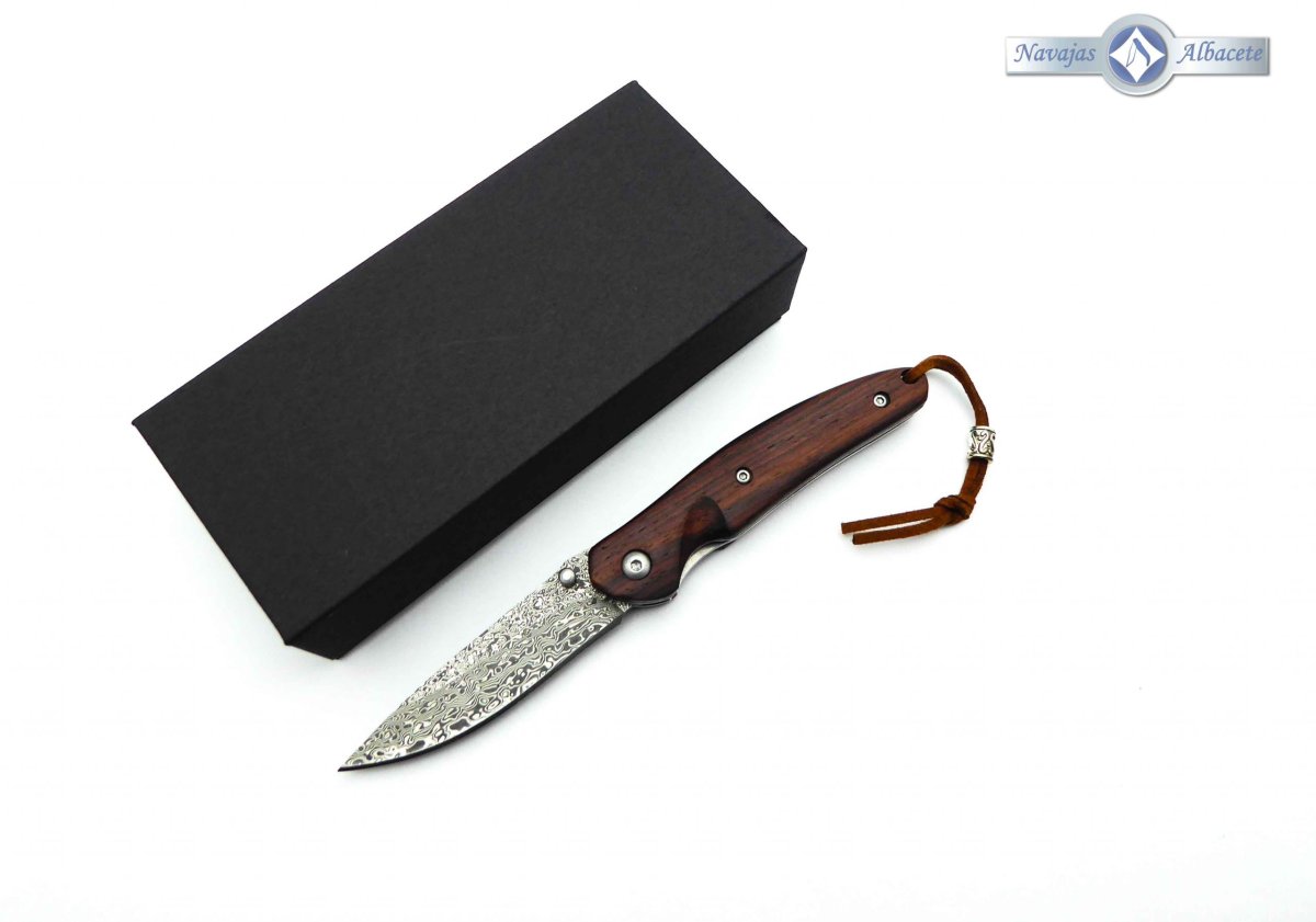 Descripción: Navaja «damasco» muy ligera con mango en madera natural, con cordón de cuero. Hoja en acero de damasco de 70 lamas, decorada con láser. Bloqueo de seguridad Liner lock. Incluye caja estuche color negro con cierre imantado.