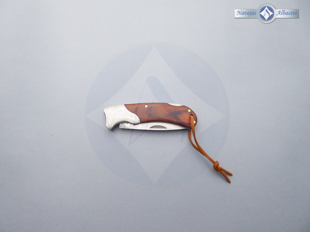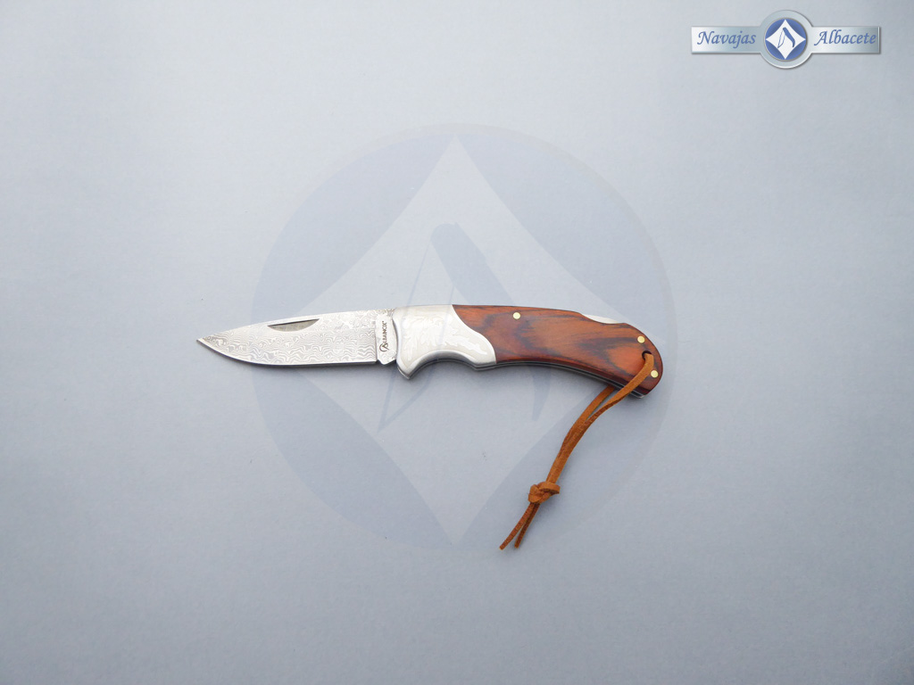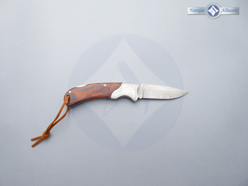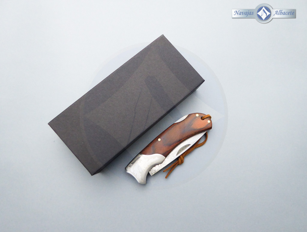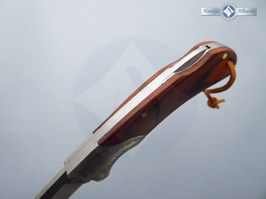 Descripción: Navaja damasco con mango de madera stamina y virola de acero decorada a láser. Orificio con cordón en el pomo. Hoja de acero damasco de 73 capas, con uña para su fácil extracción. Bloqueo de seguridad back lock. Incluye caja estuche con cierre imantado. Peso total con caja 139 gramos.