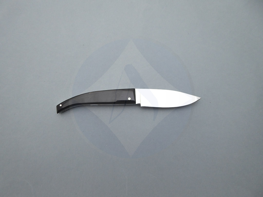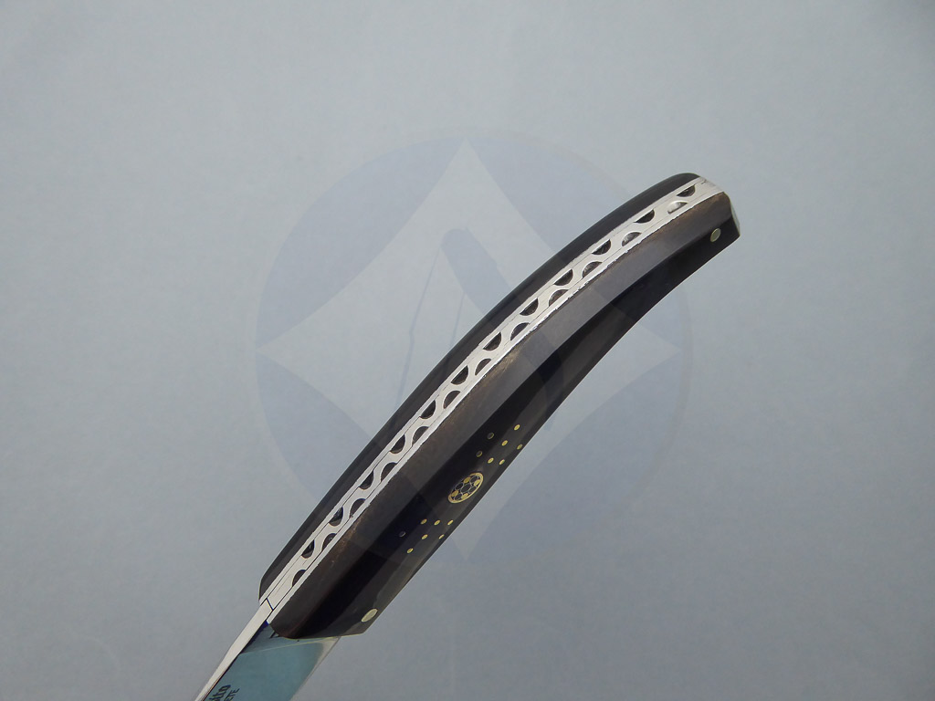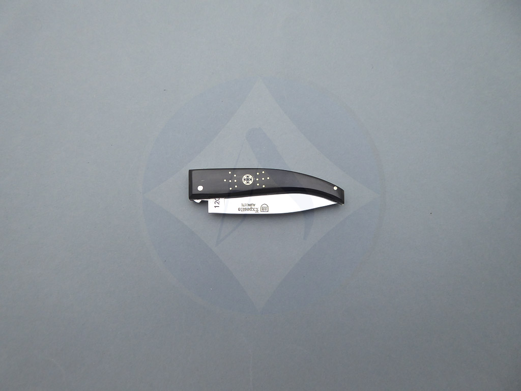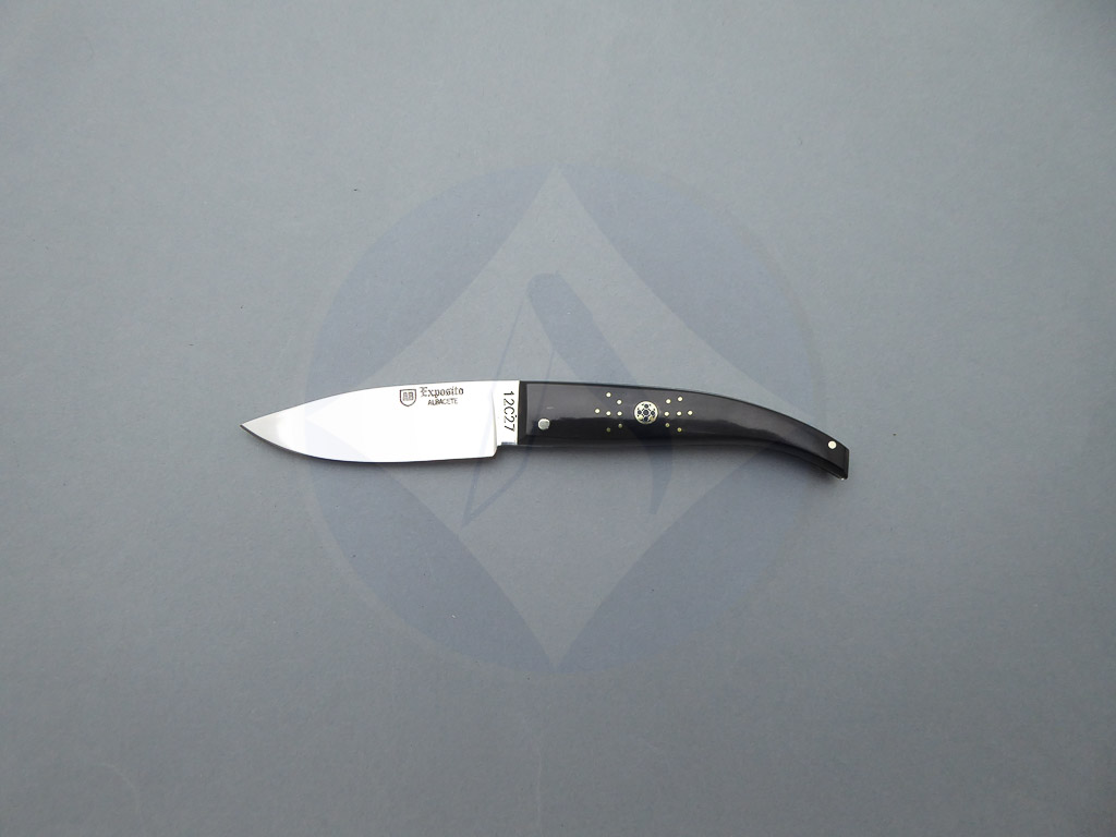 Descripción: Navaja de Albacete de elaboración artesanal, hecha a mano por el maestro José Expósito, con denominación de origen AB. Mango de asta de búfalo con adorno mosaico. Hoja de acero 12C27. Cierre de pistón. Muelle decorado. Incluye pergamino certificado del artesano.