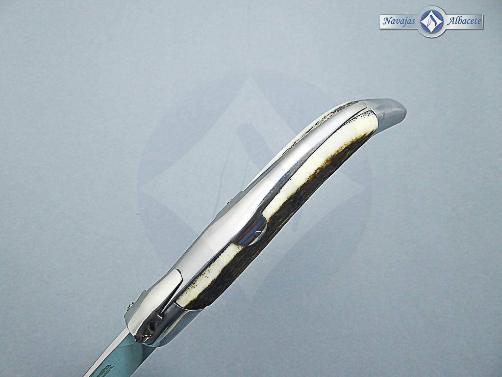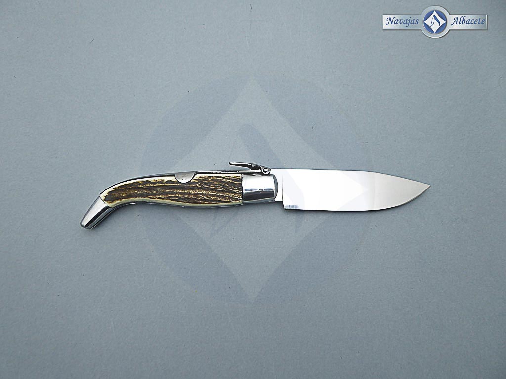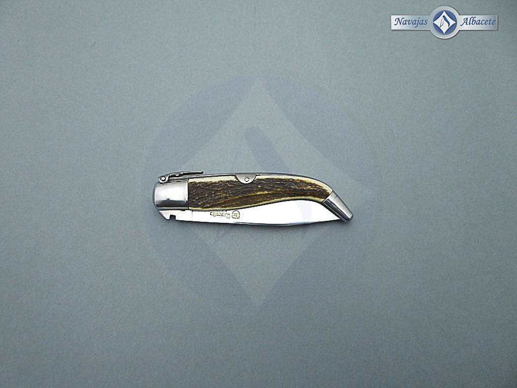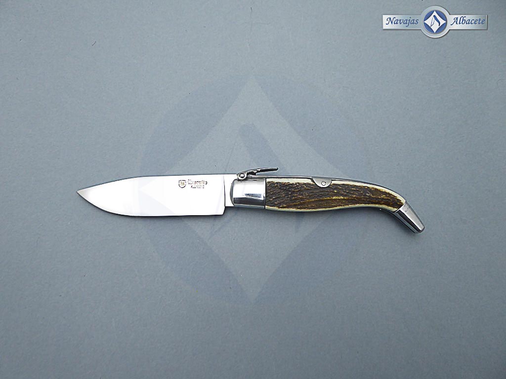 Descripción: Navaja Pastora clásica de elaboración artesanal hecha a mano por el maestro José Expósito, con denominación de origen AB. Mango de asta de ciervo, virola y rebajo en aluminio. Hoja de acero inoxidable 12C27. Sistema de cierre de palanquilla. Disponible en 2 tamaños de hoja, seleccione la opción que desee.