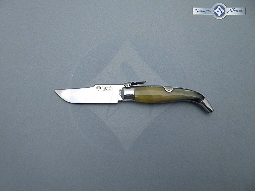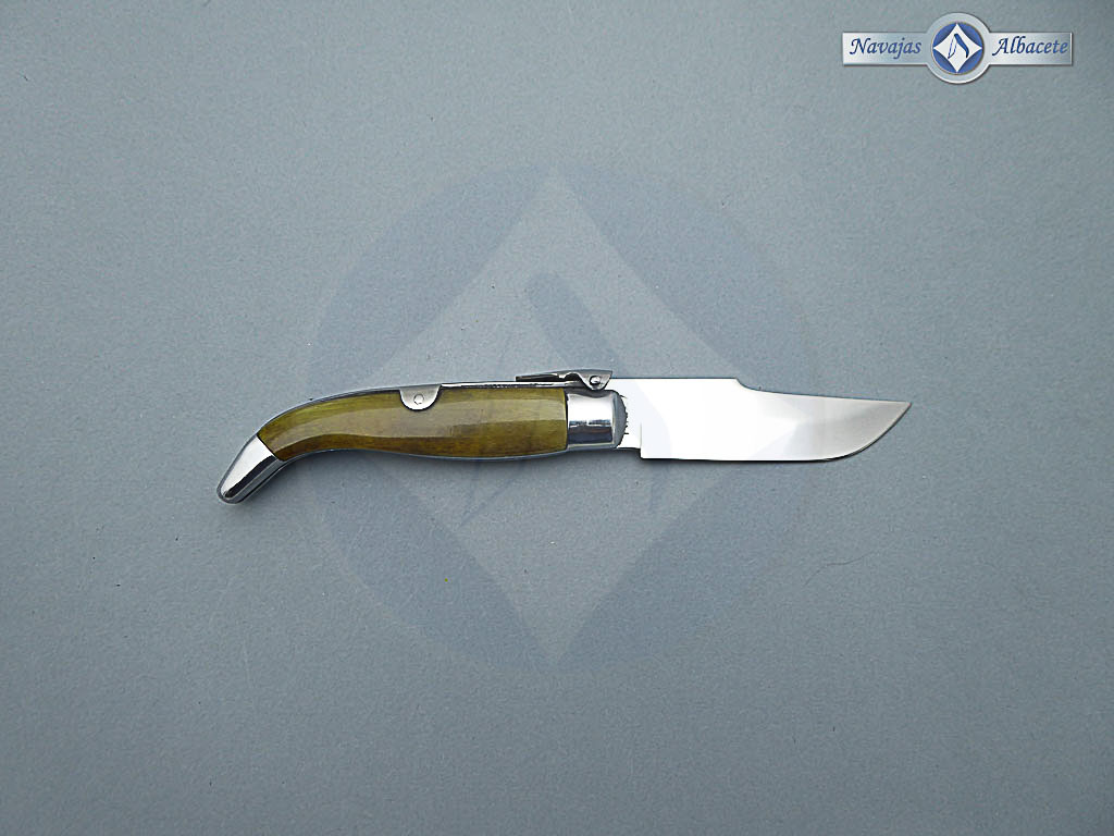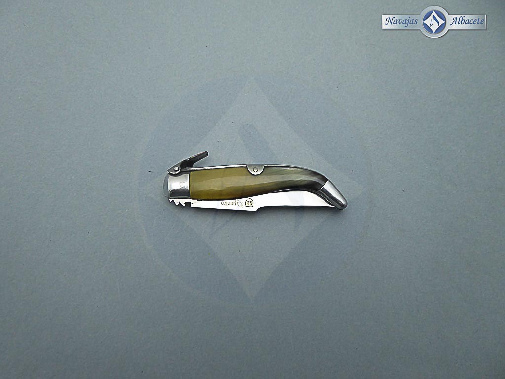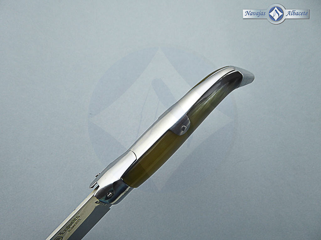 Descripción: Navaja de Albacete con carraca de elaboración artesanal hecha a mano por el maestro José Expósito, con denominación de origen AB. Mango de asta de toro, virola y rebajo en aluminio. Hoja de acero inoxidable 12C27. El muelle es de acero con palanquilla. Disponible en 2 tamaños de hoja, seleccione la opción que desee.