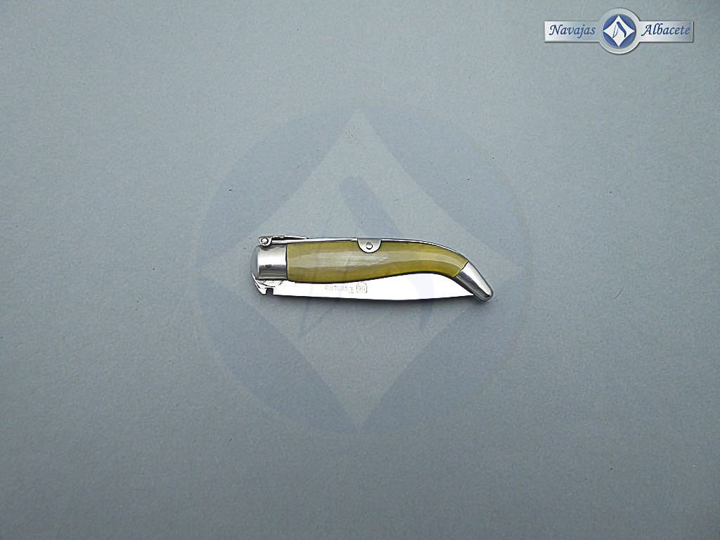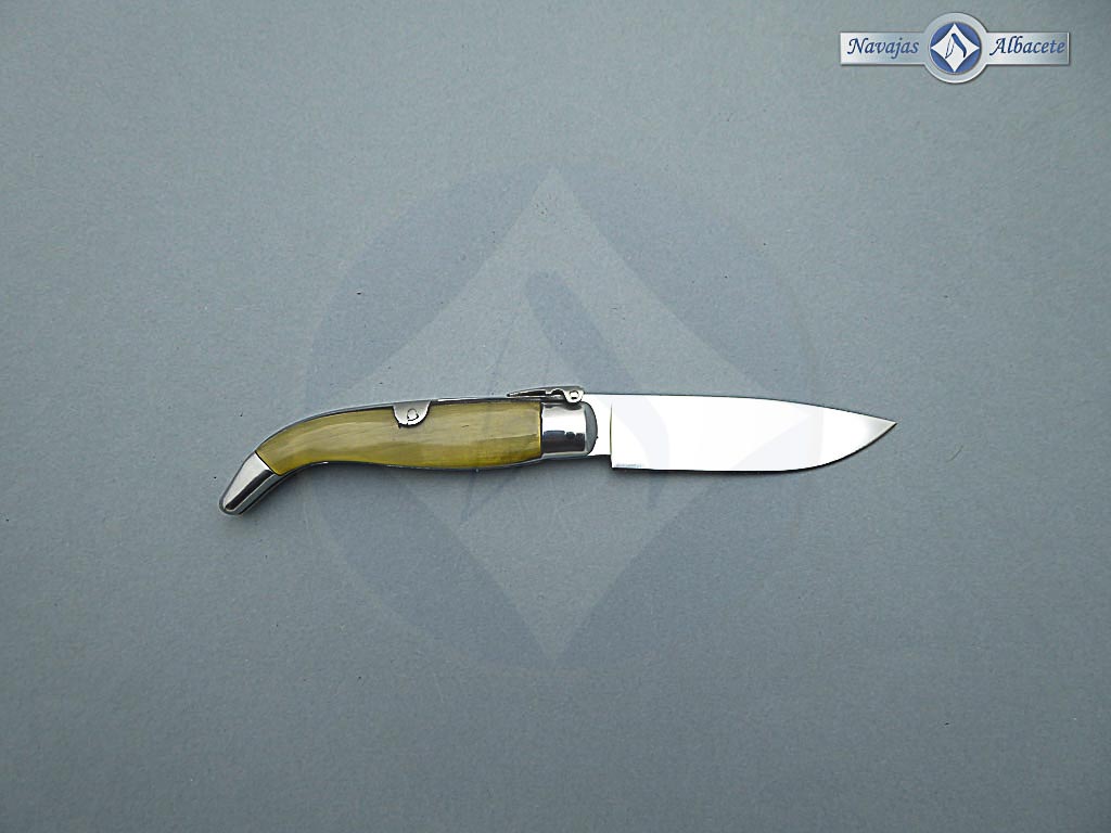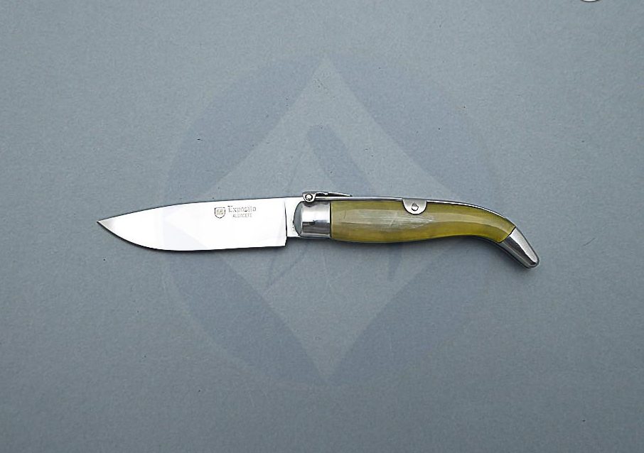 Descripción: Navaja de Albacete de elaboración artesanal hecha a mano por el maestro José Expósito, con denominación de origen AB . Mango de asta de toro, virola y rebajo en aluminio. Hoja de acero inoxidable 12C27. Sistema de cierre de palanquilla. Presentada en cajita de cartón con pergamino certificado del artesano.
