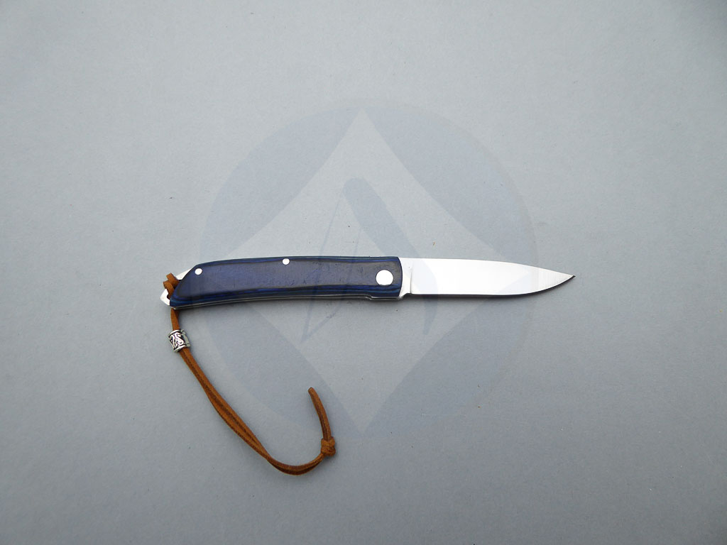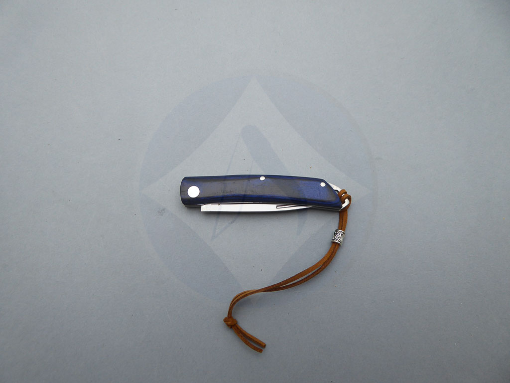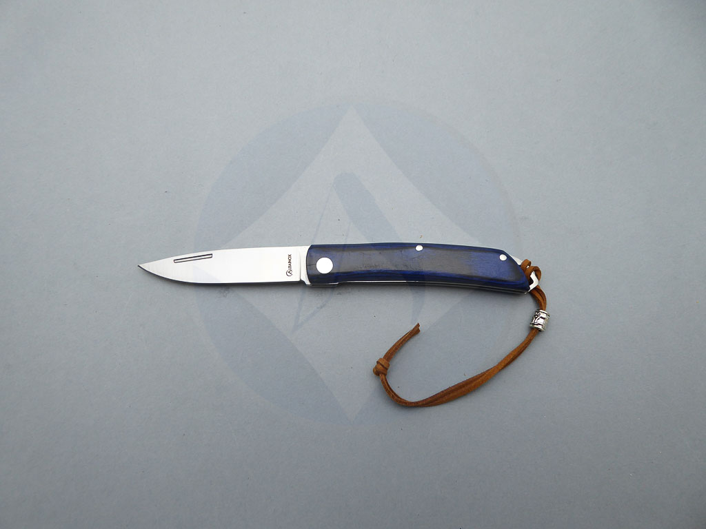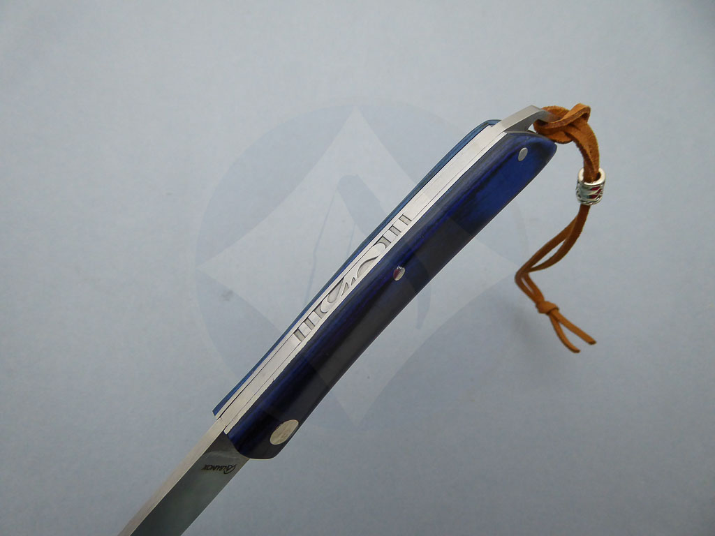 Descripción: Navaja de bolsillo con mango de madera stamina azul, con cordón en la parte trasera. Hoja de acero inoxidable molibdeno vanadio, con uña para su fácil extracción. Bloqueo de pistón. Diseñada en España.