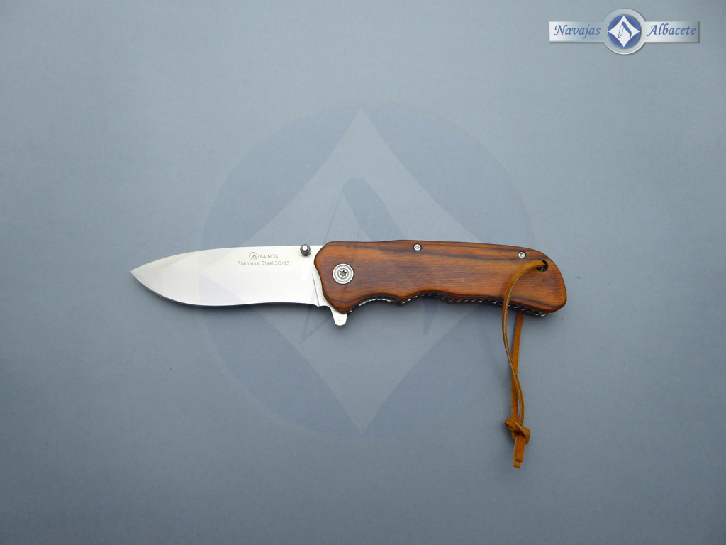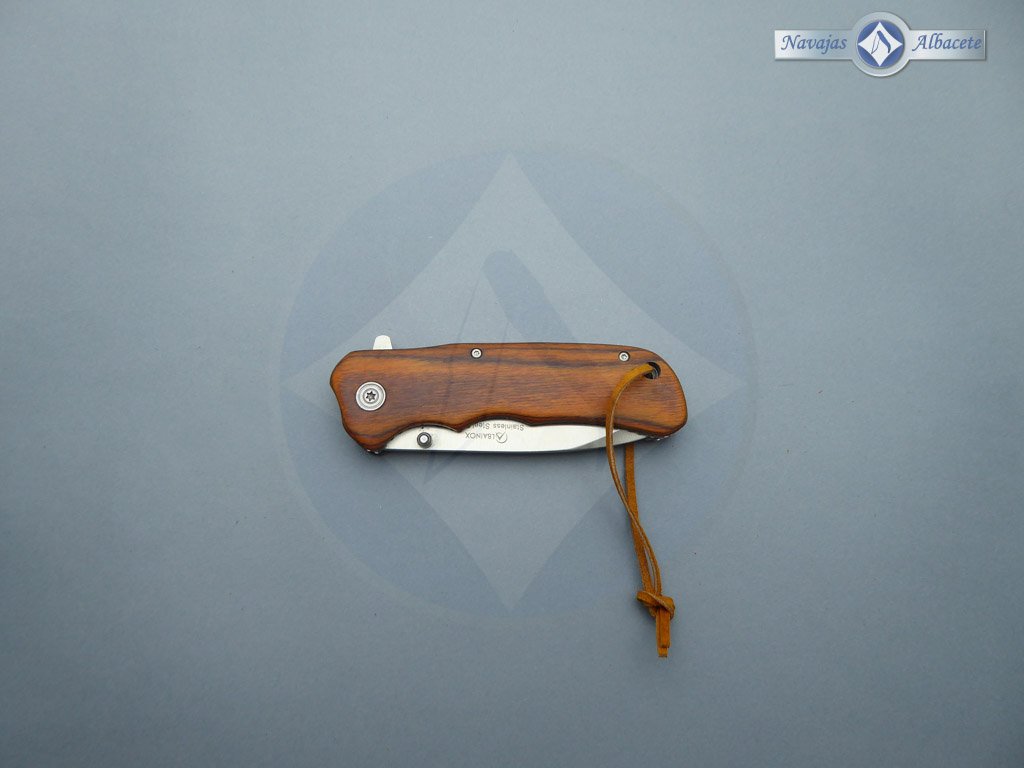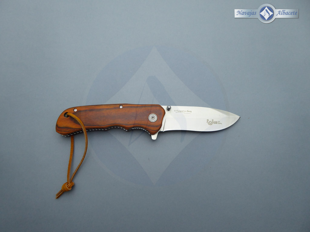 Descripción: Navaja de campo con mango de madera stamina roja. Hoja de acero inoxidable molibdeno vanadio, acabado satinado. Bloqueo Liner lock. Incluye cordón. Diseñada en España.