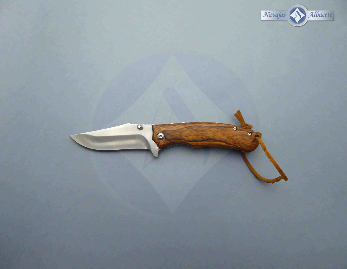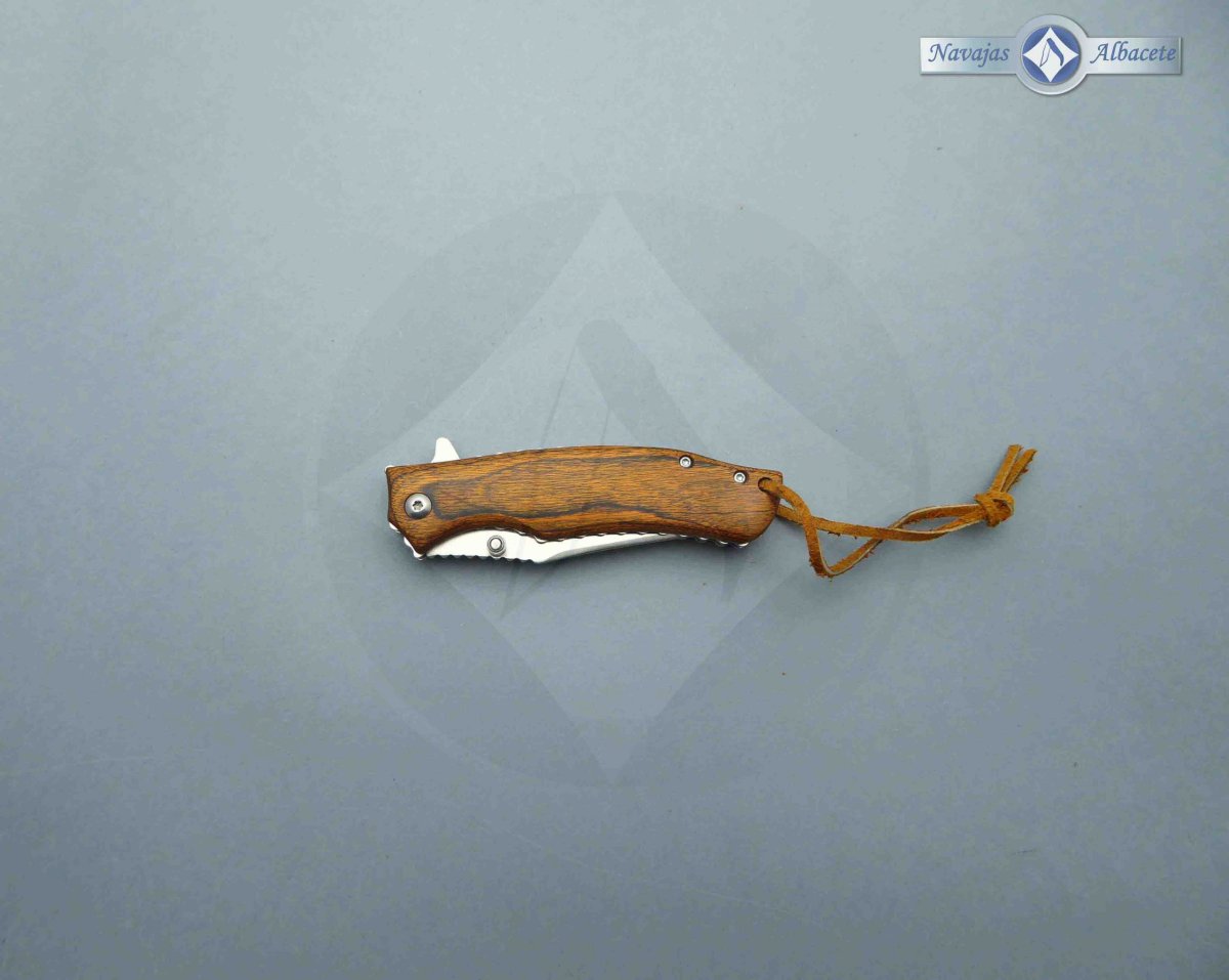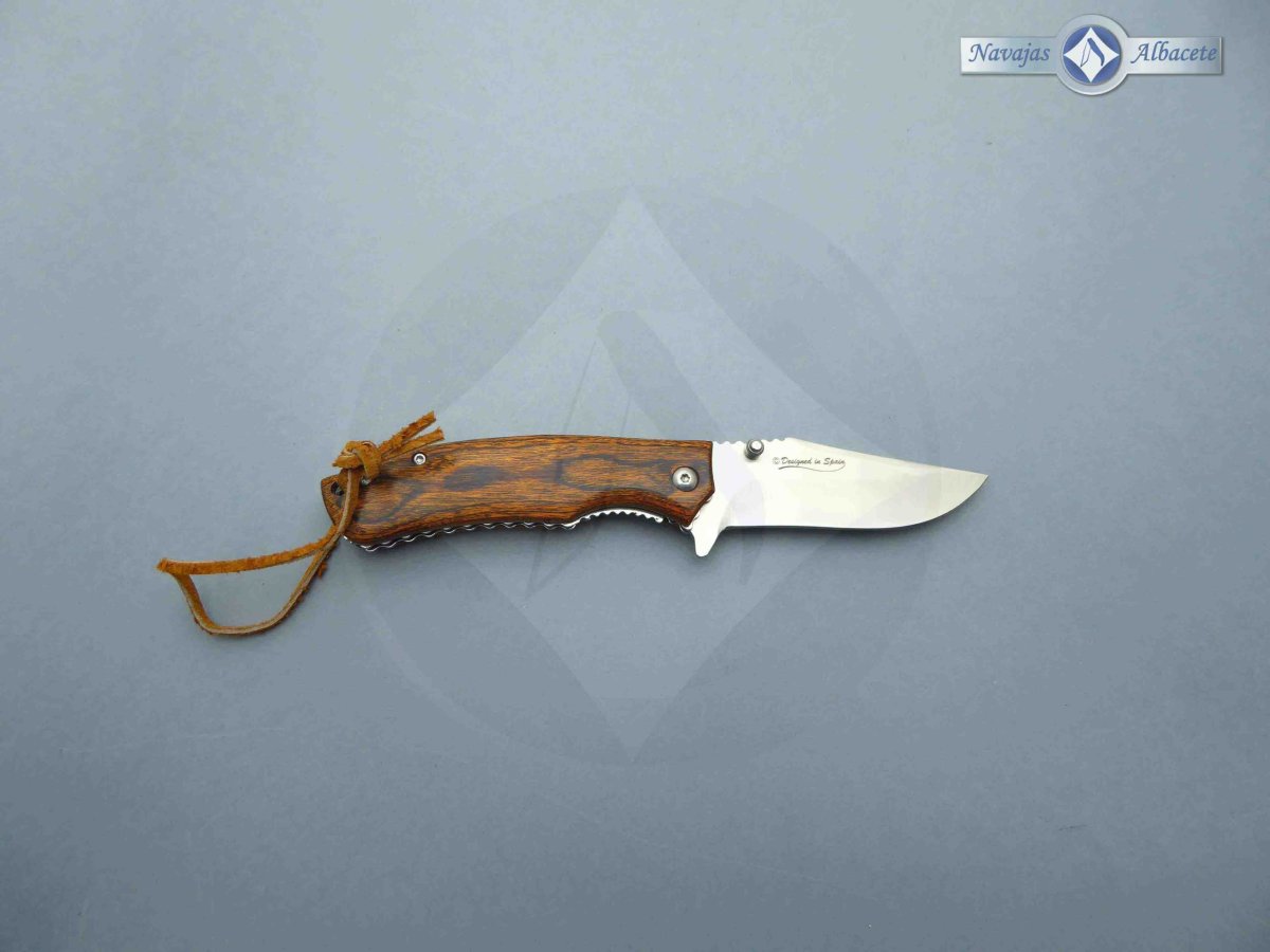 Descripción: Navaja de monte con mango de madera stamina, con cordón en el pomo. Hoja de acero inoxidable molibdeno vanadio. Sistema de bloqueo Liner lock. Diseñada en España.