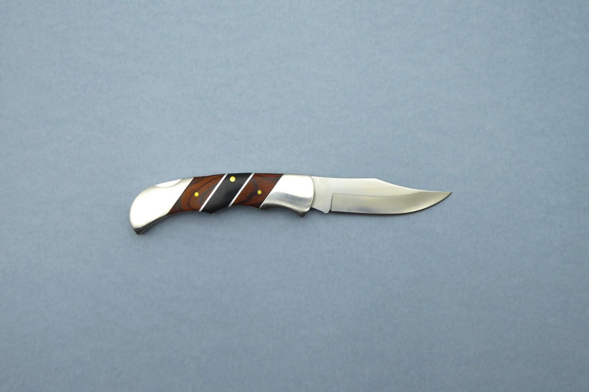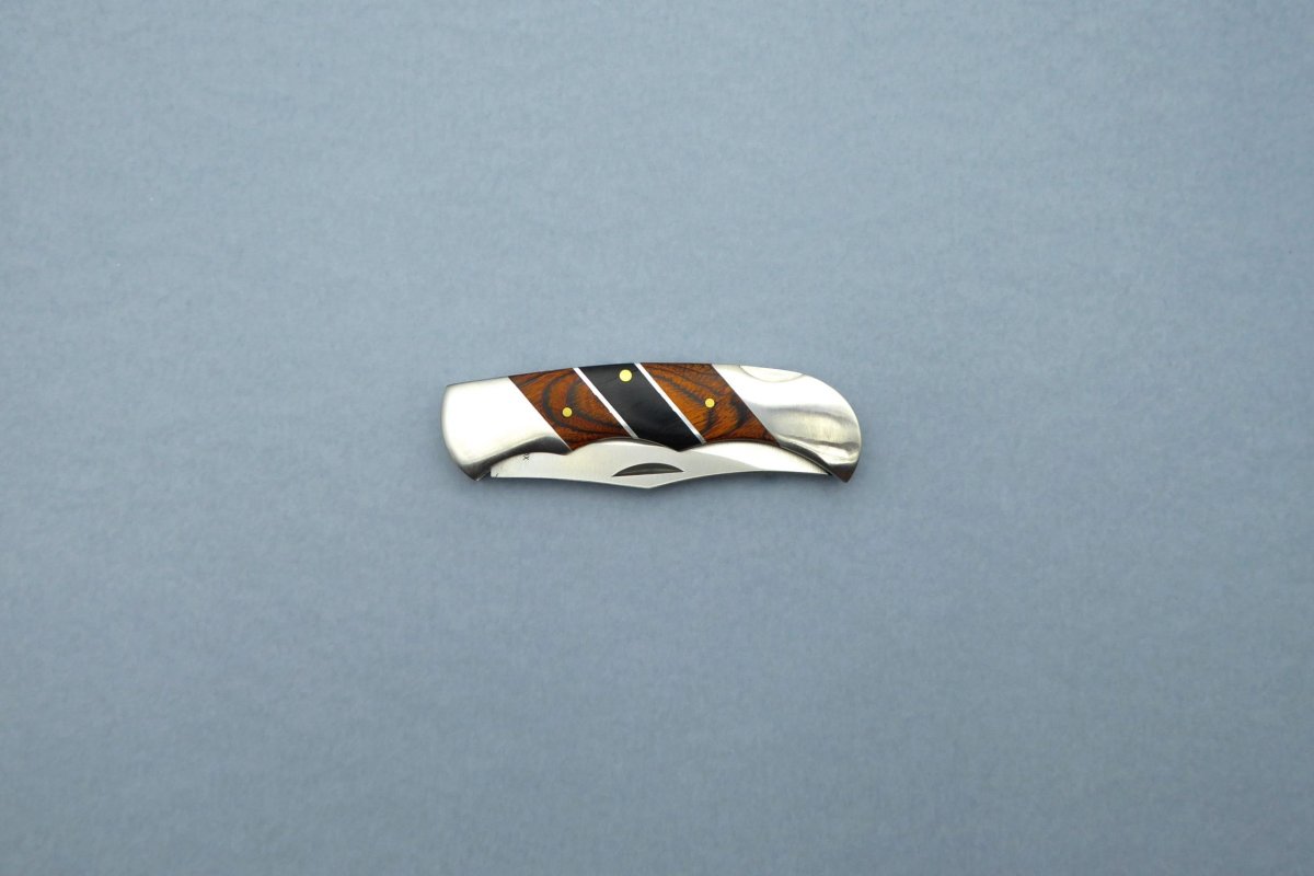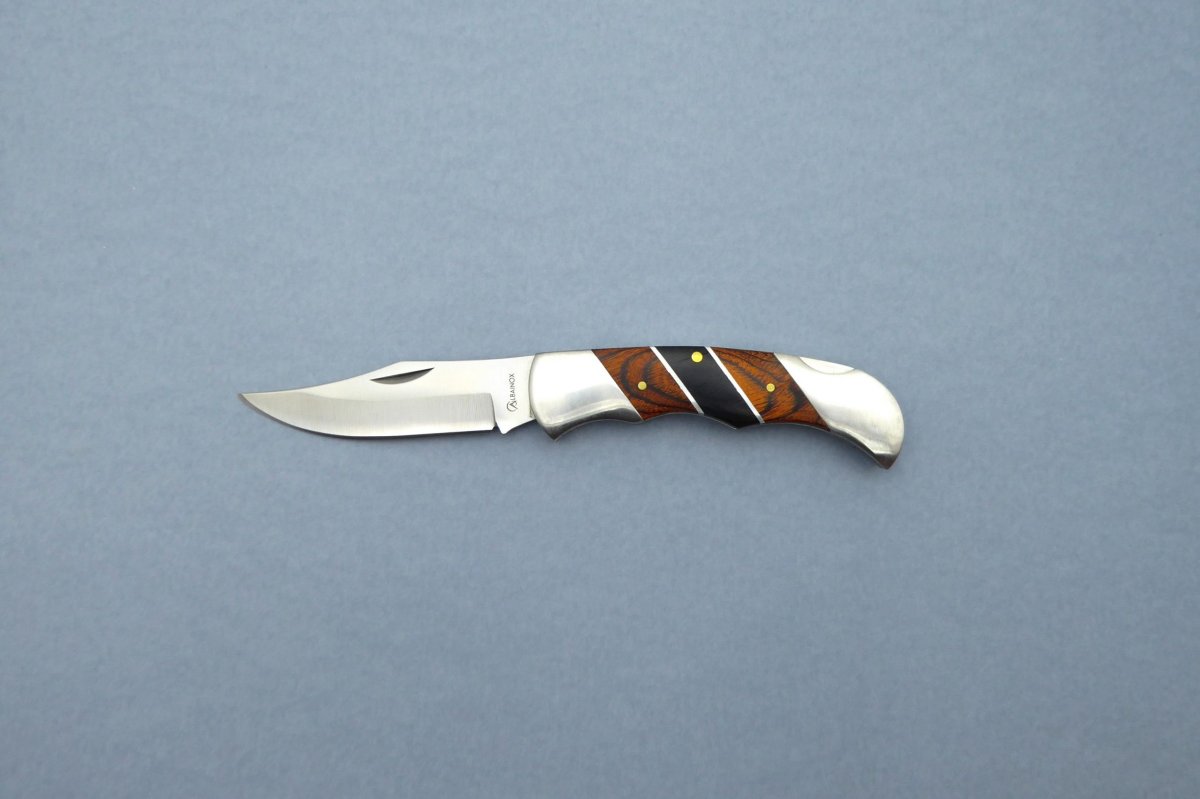 Descripción: Navaja clásica de monte con mango en madera stamina rojo/negro/rojo, con virola y rebajo en acero. Hoja de acero inoxidable molibdeno vanadio acabado satinado, con uña para su fácil extracción. Bloqueo de seguridad Back lock.