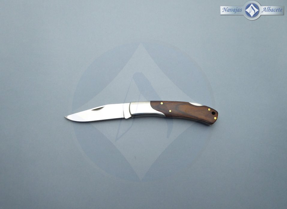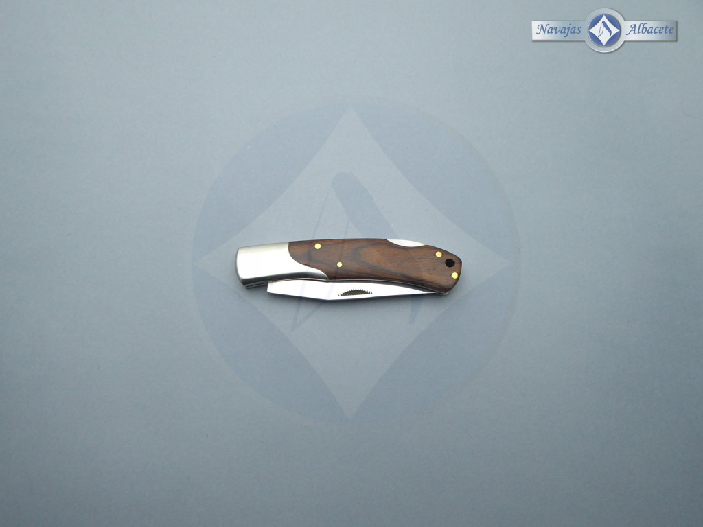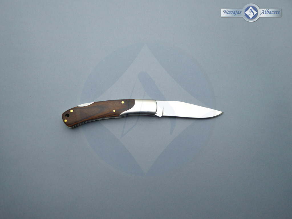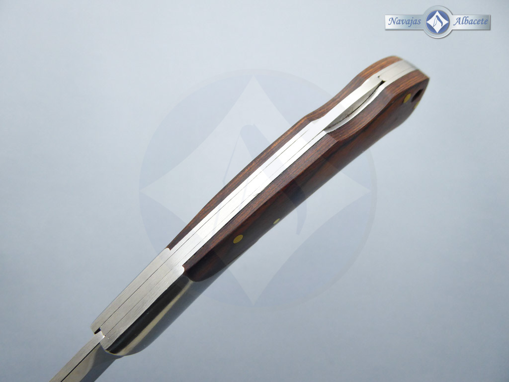 Descripción: Navaja de monte con mango de madera stamina roja y virola de acero, ojal en el pomo. Hoja de acero inoxidable molibdeno vanadio con acabado espejo, con uña para su fácil extracción. Bloqueo de seguridad Back lock. Diseñada en España.