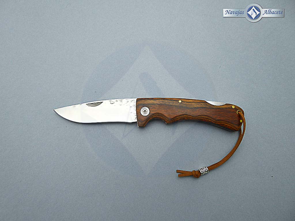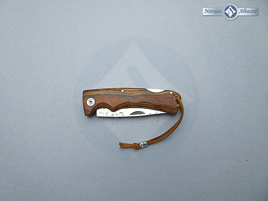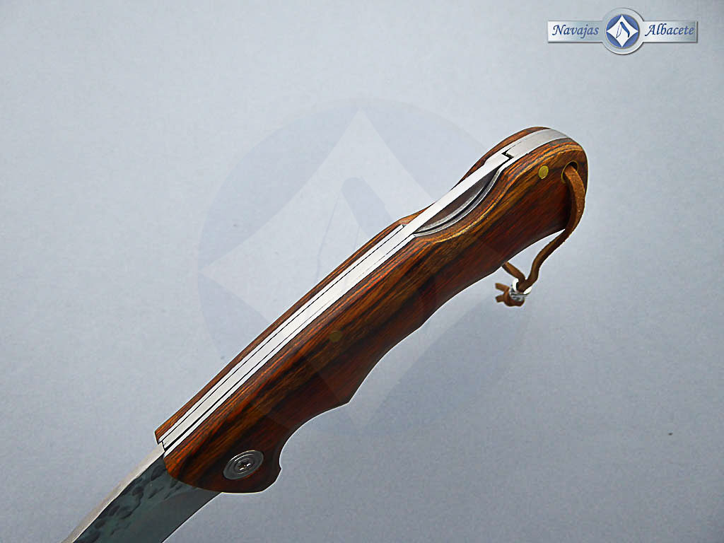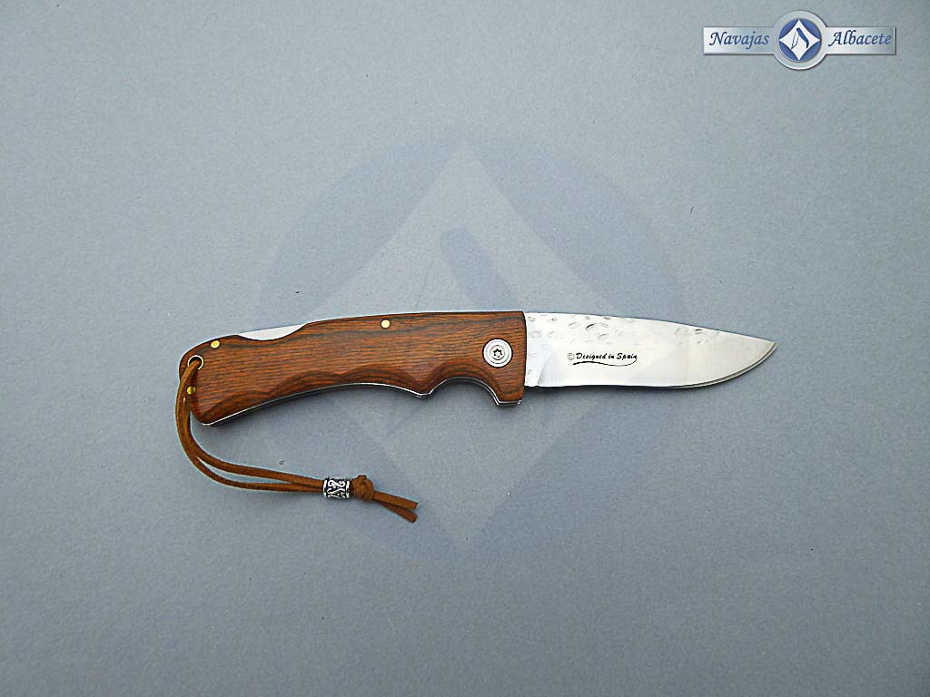 Descripción: Navaja de monte con mango de madera stamina roja, con cordón en el pomo. Hoja de acero inoxidable molibdeno vanadio decorada, con uña para su fácil extracción. Bloqueo de seguridad Back lock. Diseñada en España.