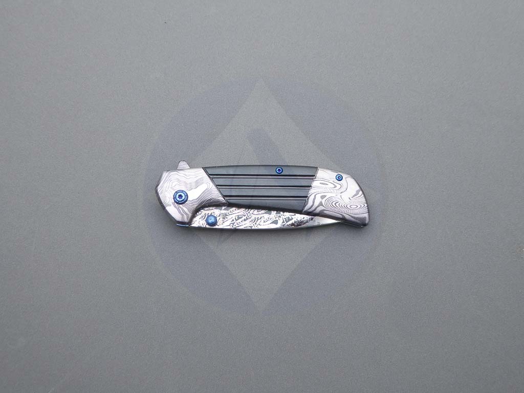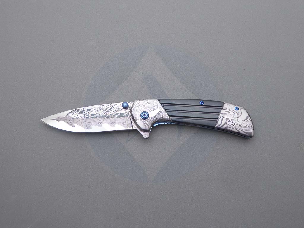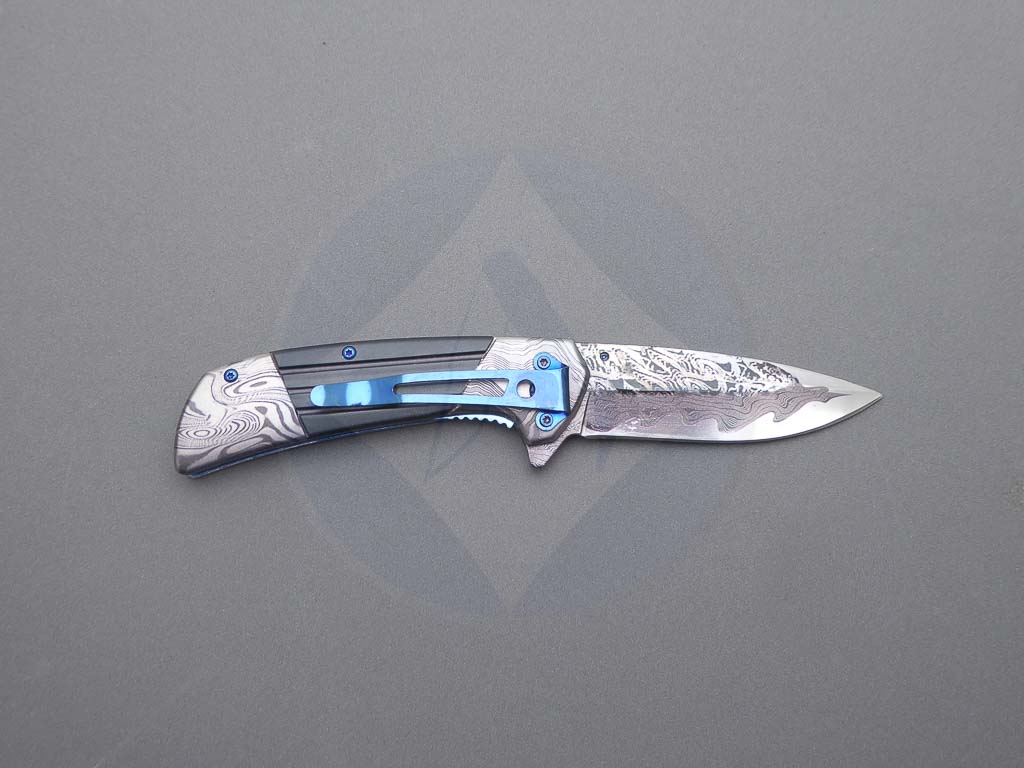Descripción: Navaja con mango de acero decorado y hoja de acero inoxidable con diseño 3D. Bloqueo Liner lock. Con clip trasero color azul.