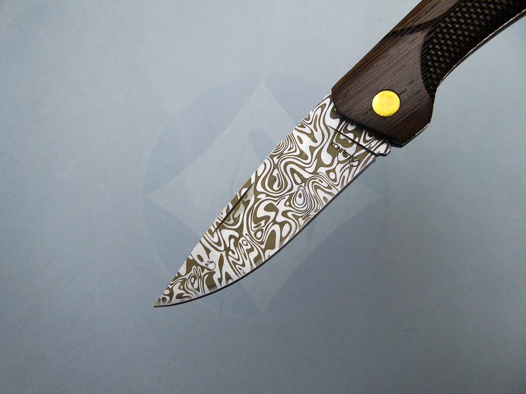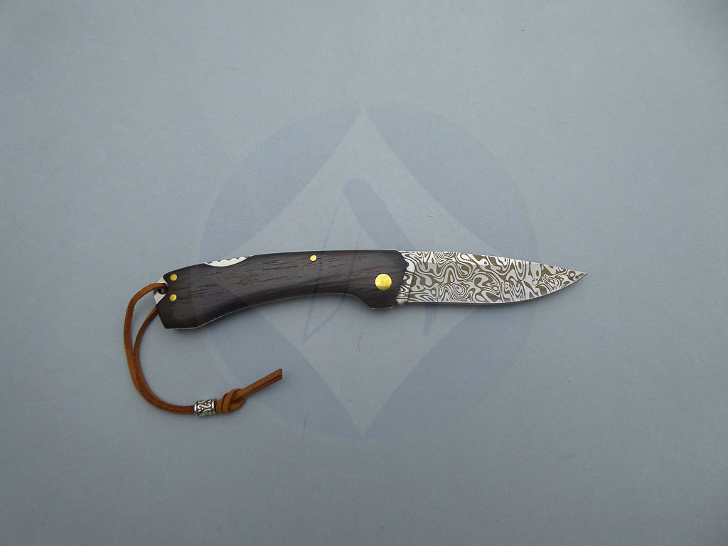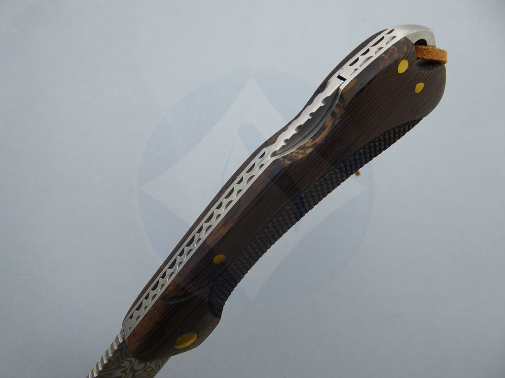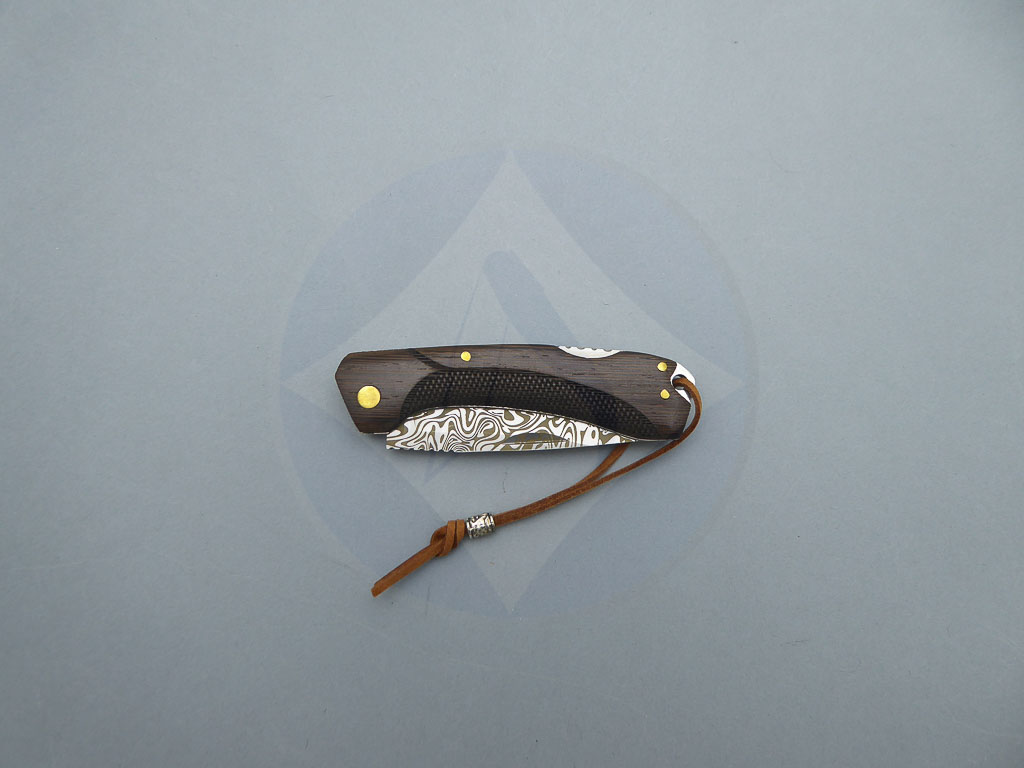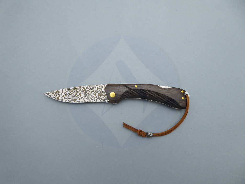 Descripción: Navaja con mango de madera wengué. CNC en la cacha. Hoja de acero inoxidable molibdeno vanadio decorada a láser. Bloqueo de seguridad Back lock. Muelle decorado. Ojal de acero en el pomo con cordón con detalle metálico. Diseñada en España.