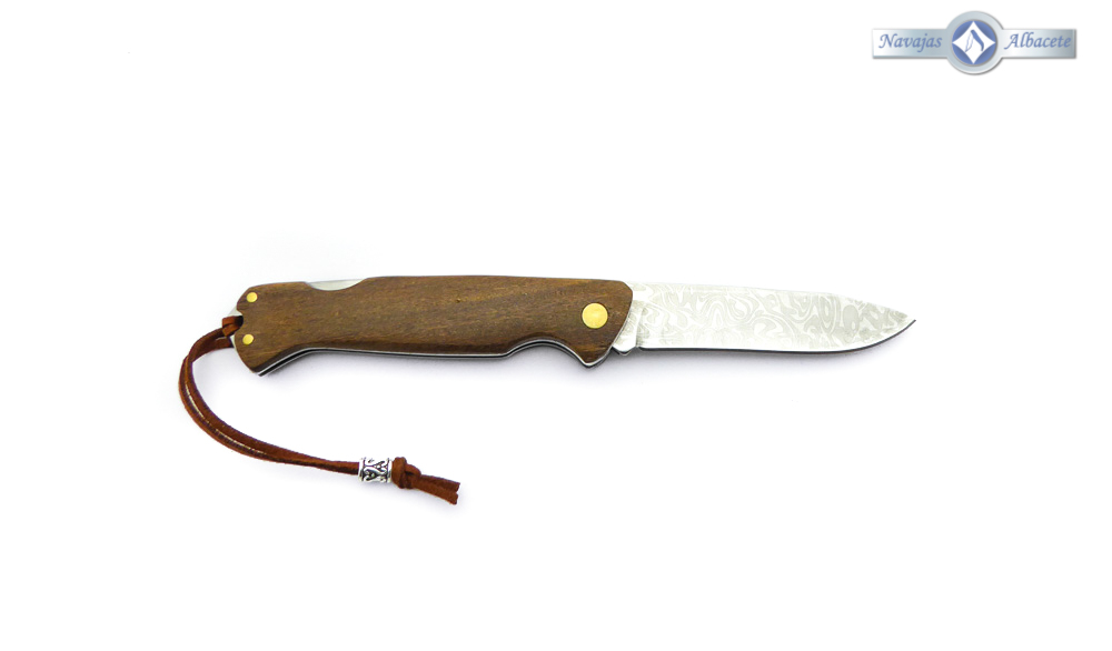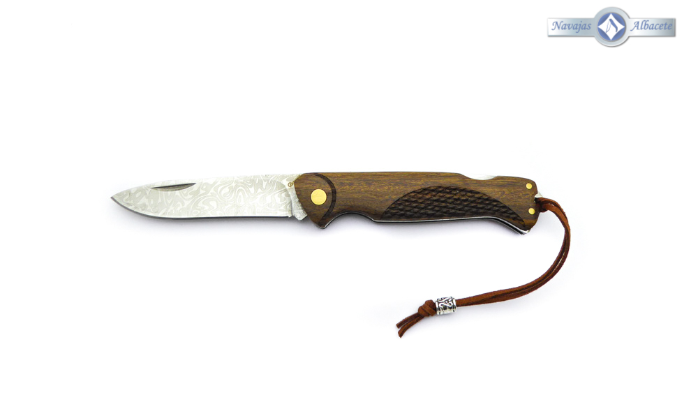 Descripción: Navaja clásica con puño de madera decorada. Hoja de acero inoxidable decorada a láser, con uña para su fácil extracción. Bloqueo de seguridad Back lock. Incluye cordón de piel.