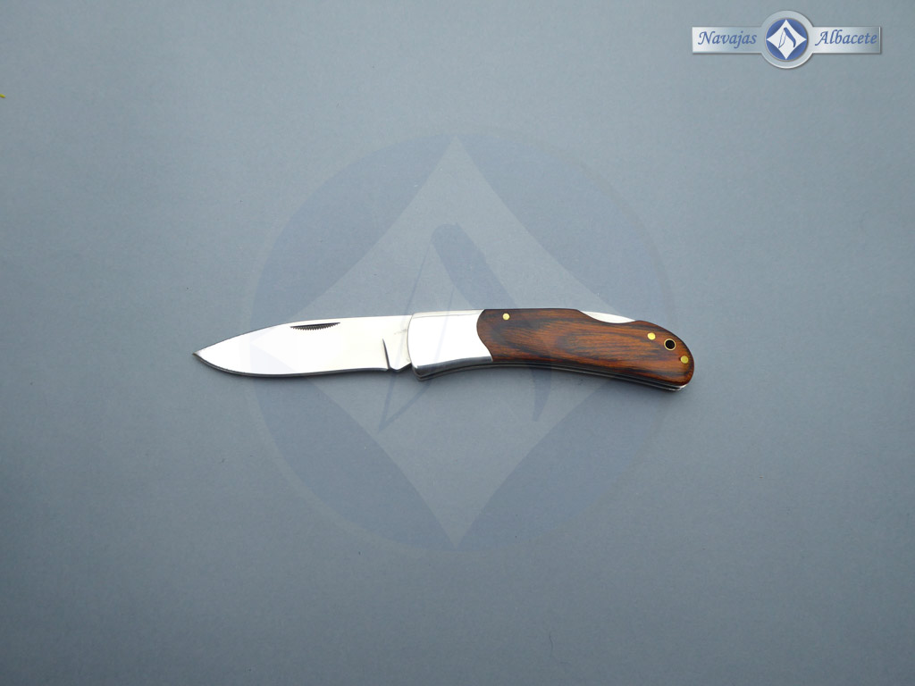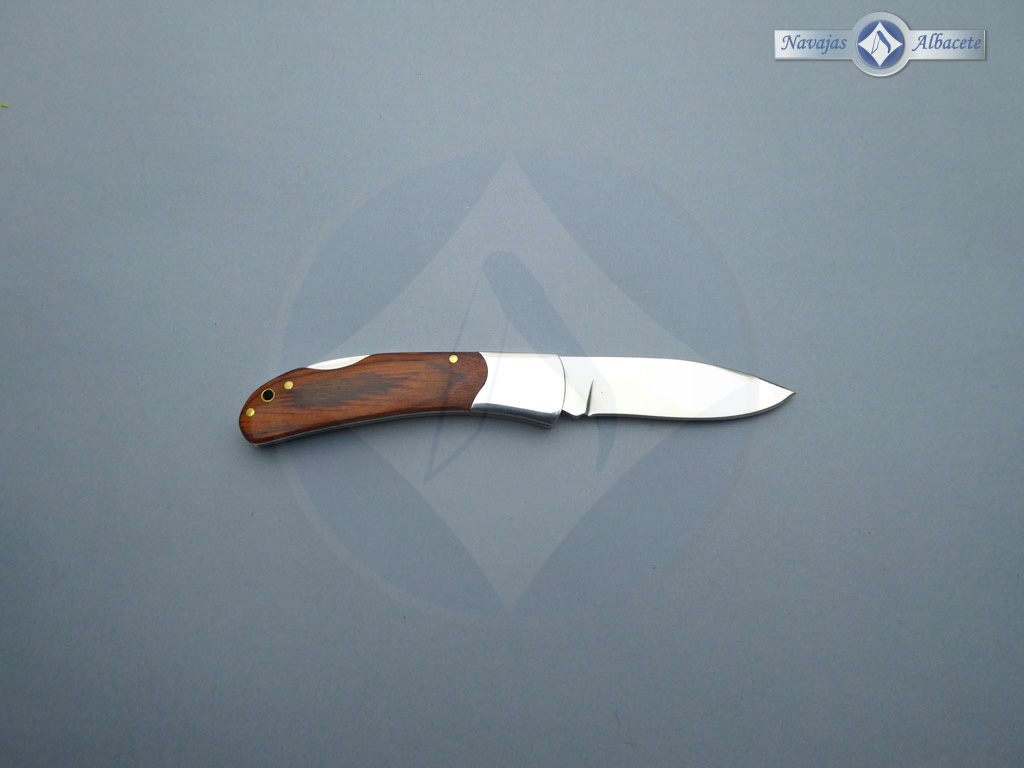 Descripción: Navaja de monte con mango de madera stamina y virola de acero, ojal en el pomo. Hoja de acero inoxidable molibdeno vanadio con acabado espejo, con uña para su fácil extracción. Bloqueo de seguridad Back lock. Diseñada en España.