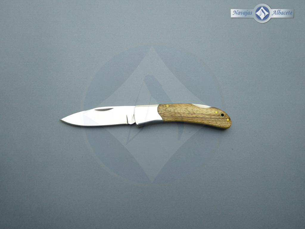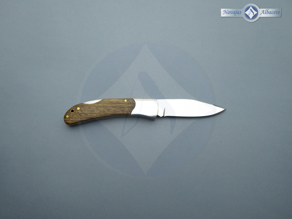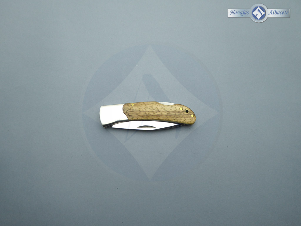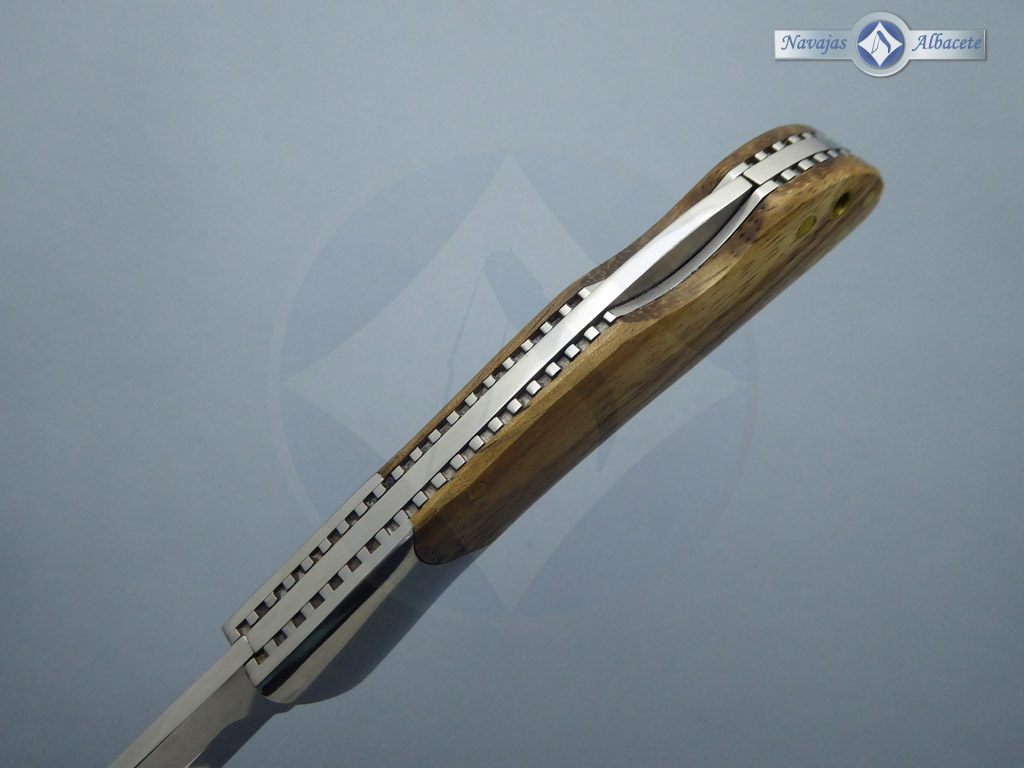Descripción: Navaja de monte con mango de madera zebra y virola de acero, ojal en el pomo. Hoja de acero inoxidable molibdeno vanadio con acabado espejo, con uña para su fácil extracción. Bloqueo de seguridad Back lock. Diseñada en España.