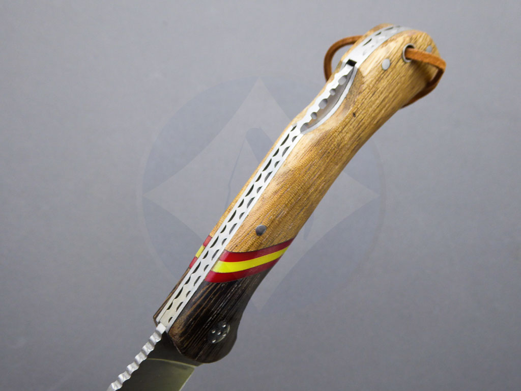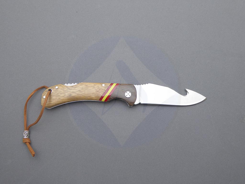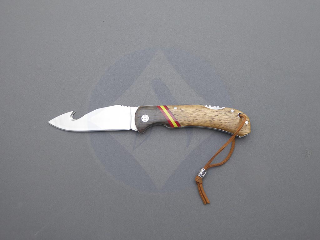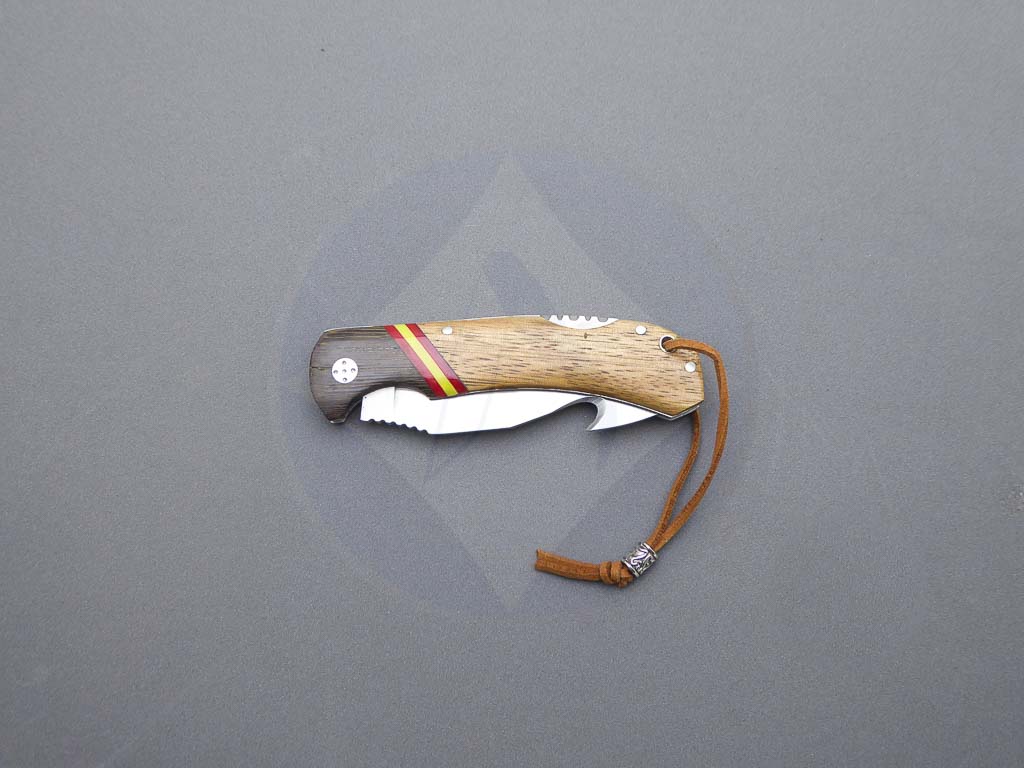 Descripción: Navaja deportiva con mango de madera mixta con bandera de España. Hoja de acero inoxidable molibdeno vanadio con skinner. Sistema de bloqueo back lock. Incluye cordón polipiel con adorno.