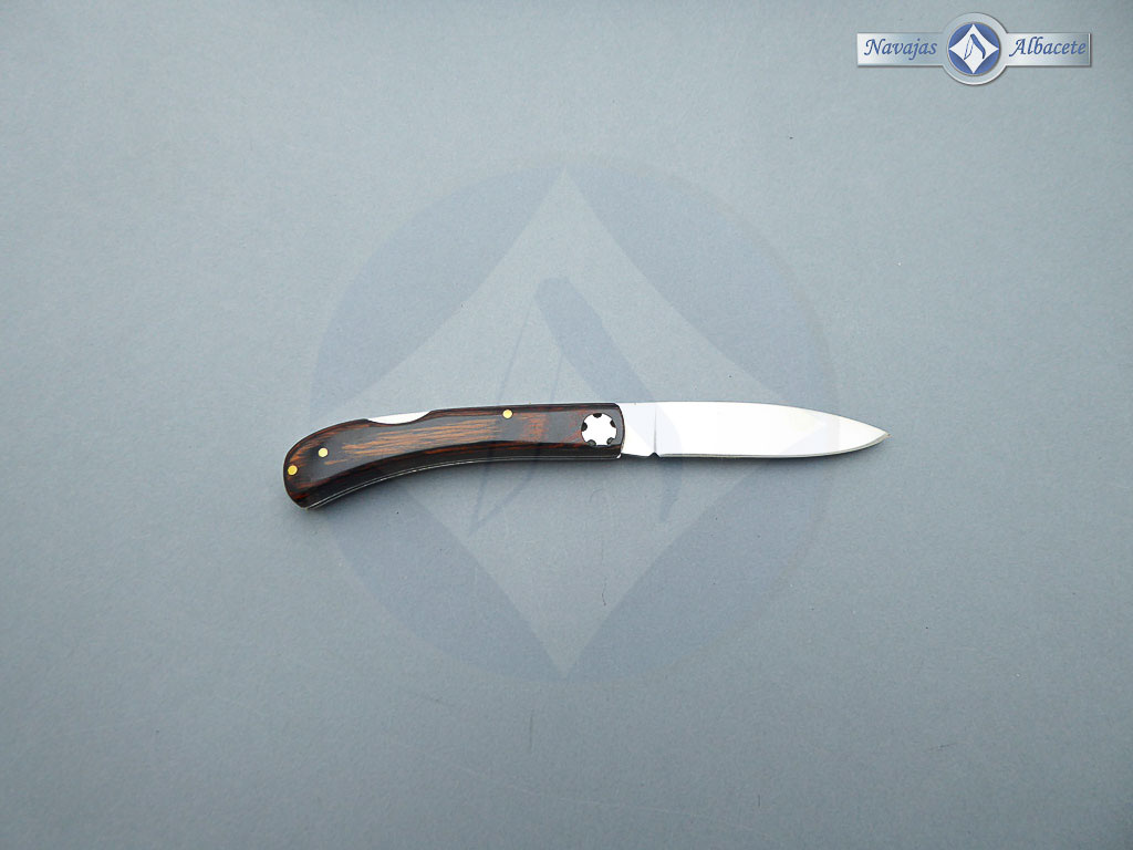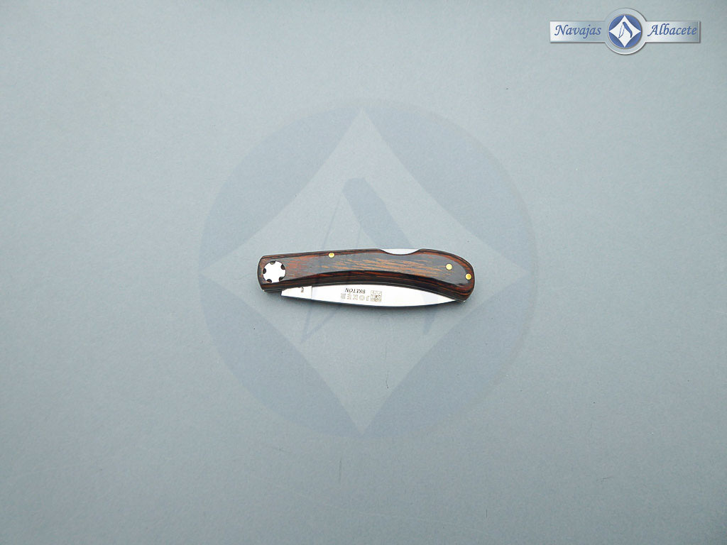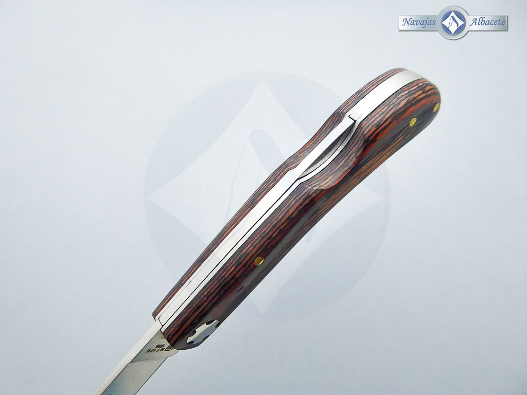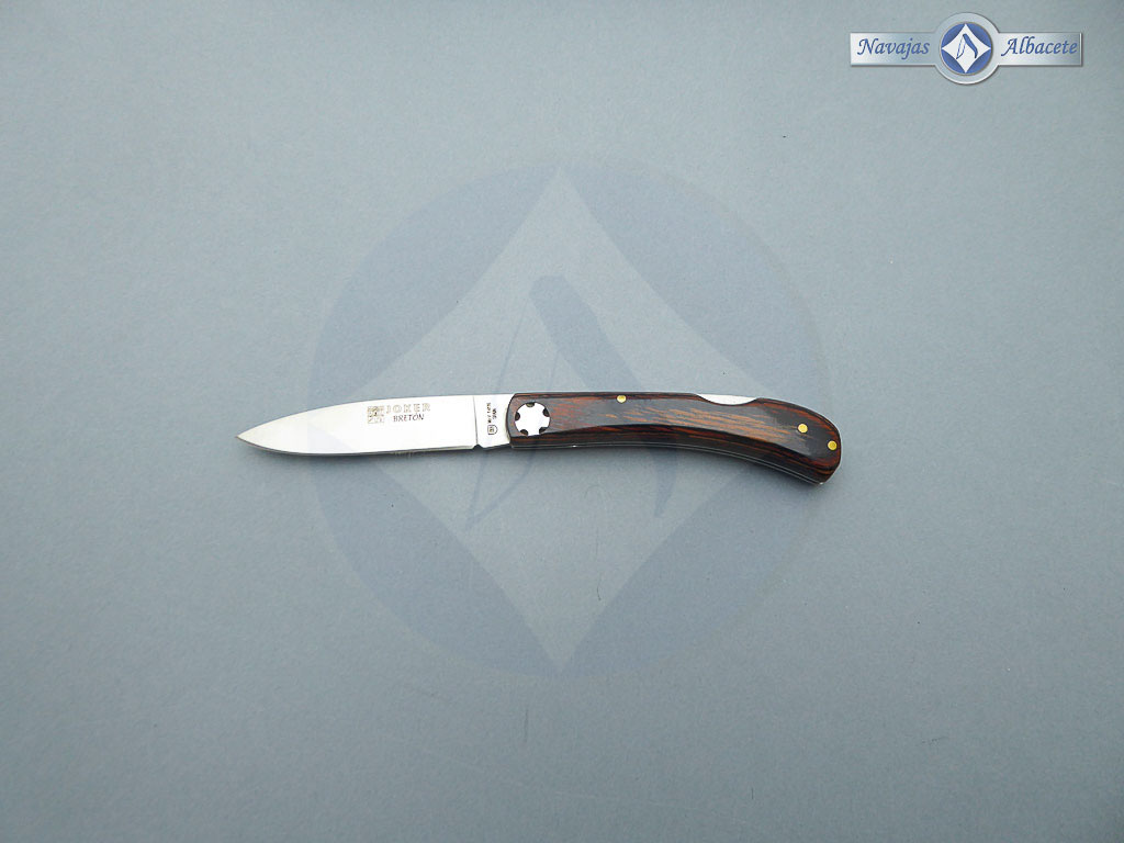 Descripción: Navaja deportiva «Bretón» tamaño bolsillo, con mango de madera stamina. Hoja de acero inoxidable molibdeno vanadio de gran resistencia y dureza. Hecha a mano en Albacete. Bloqueo de seguridad Back Lock.