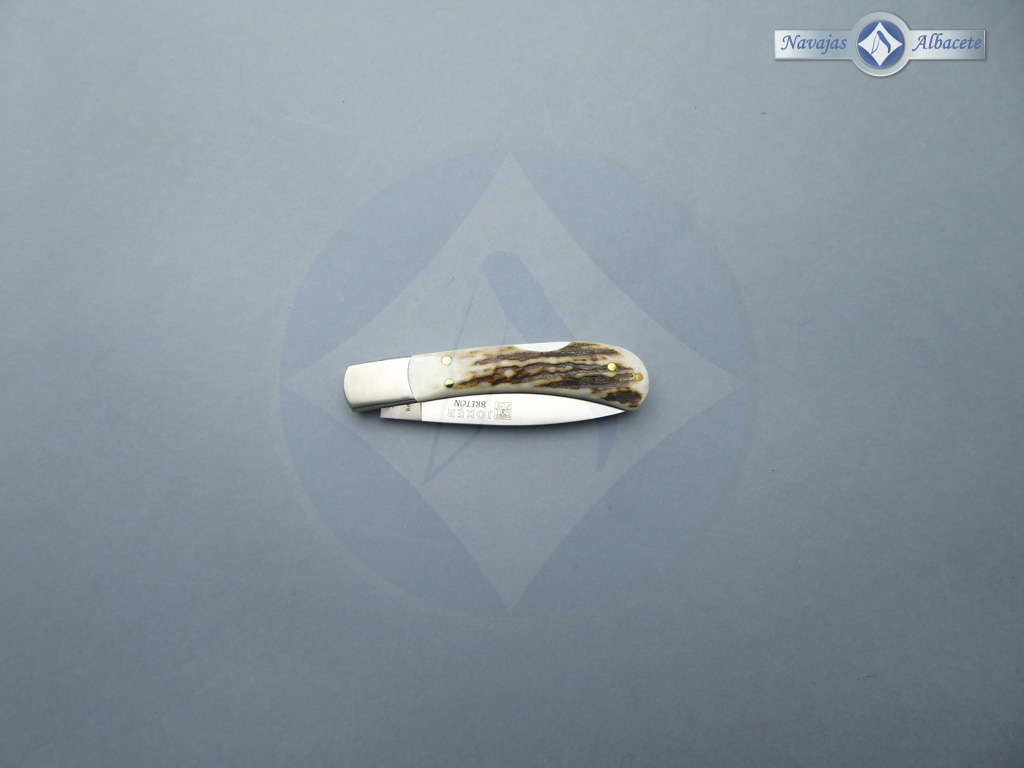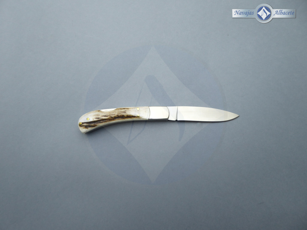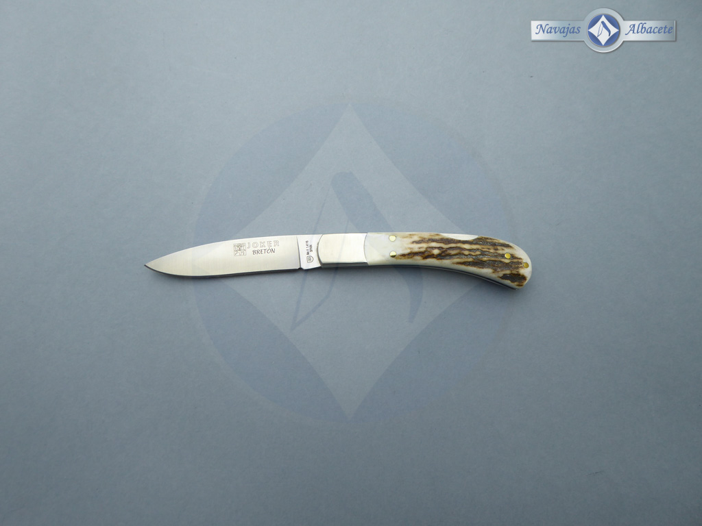 Descripción: Navaja deportiva «Bretón» de gran robustez. hecha a mano en Albacete. Puño en asta de ciervo, virola de acero. Hoja de acero inoxidable Mova 1.4116. Bloqueo de seguridad Back Lock.