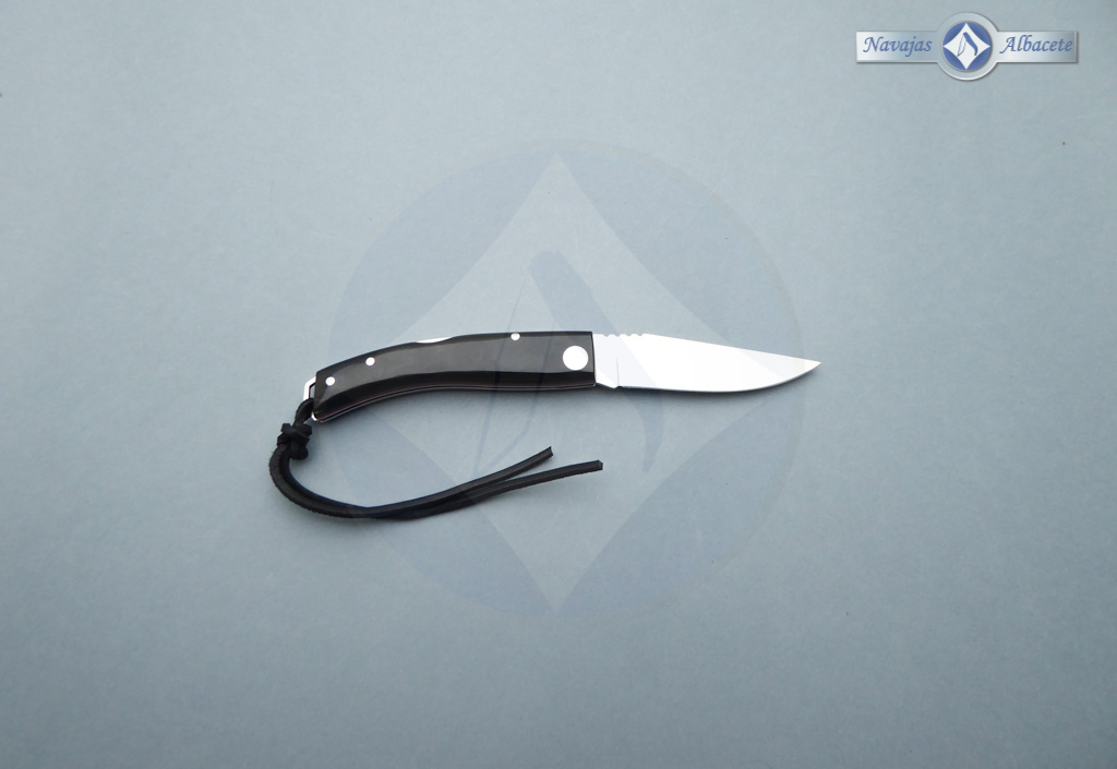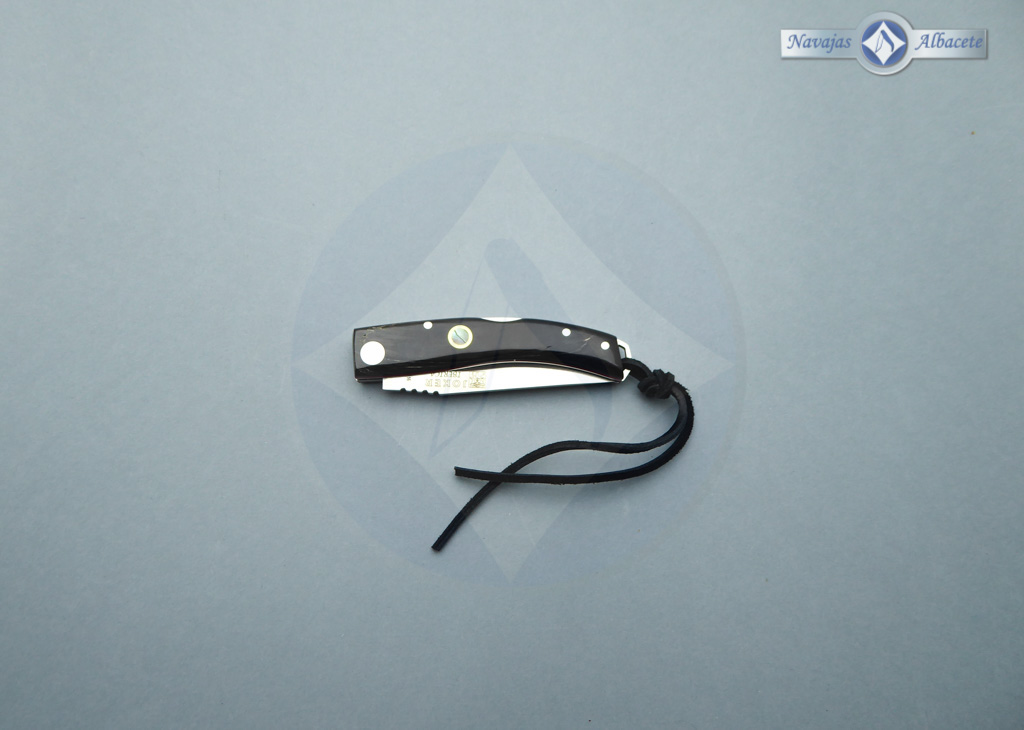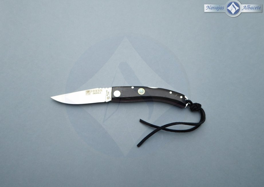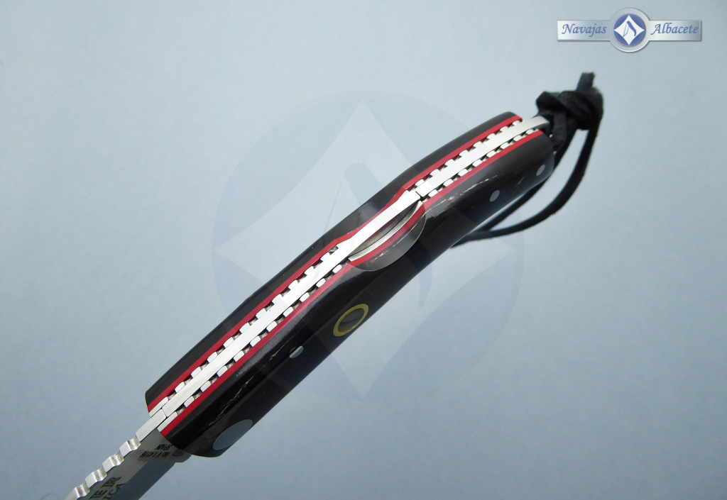 Descripción: Navaja albaceteña deportiva «Ibérica» con puño en auténtica asta de búfalo decorado con un mosaico incrustado de madreperla, con separador micarta color rojo. Ojal de acero en el pomo con cordón de cuero negro. Lomo dentado. Hoja de acero inoxidable molibdeno vanadio satinada, de gran resistencia y durabilidad. Bloqueo de seguridad back lock. Hecha a mano en Albacete. Incluye caja-estuche color negro.