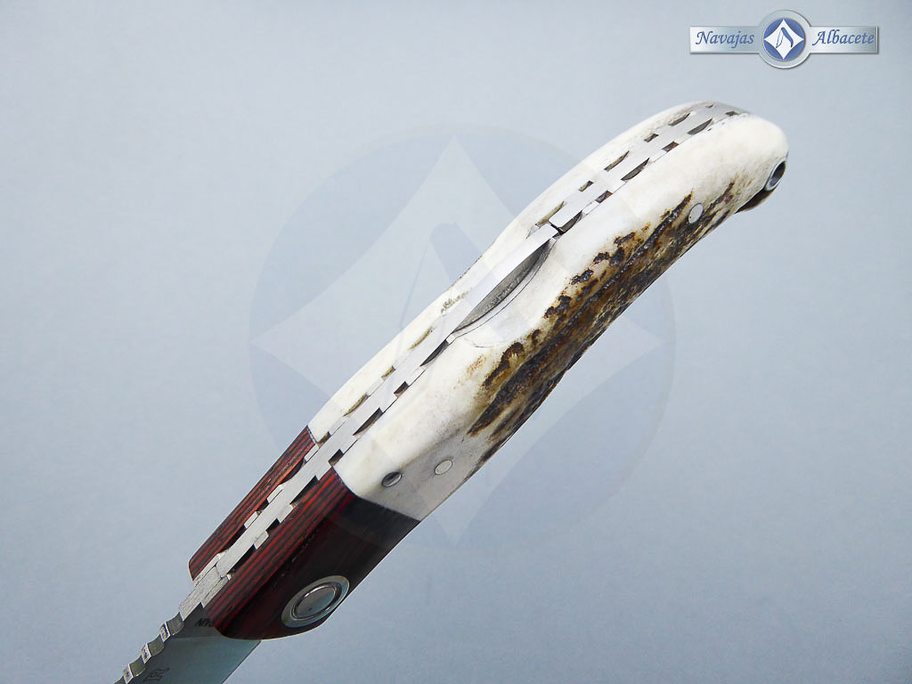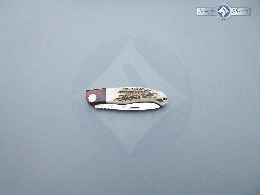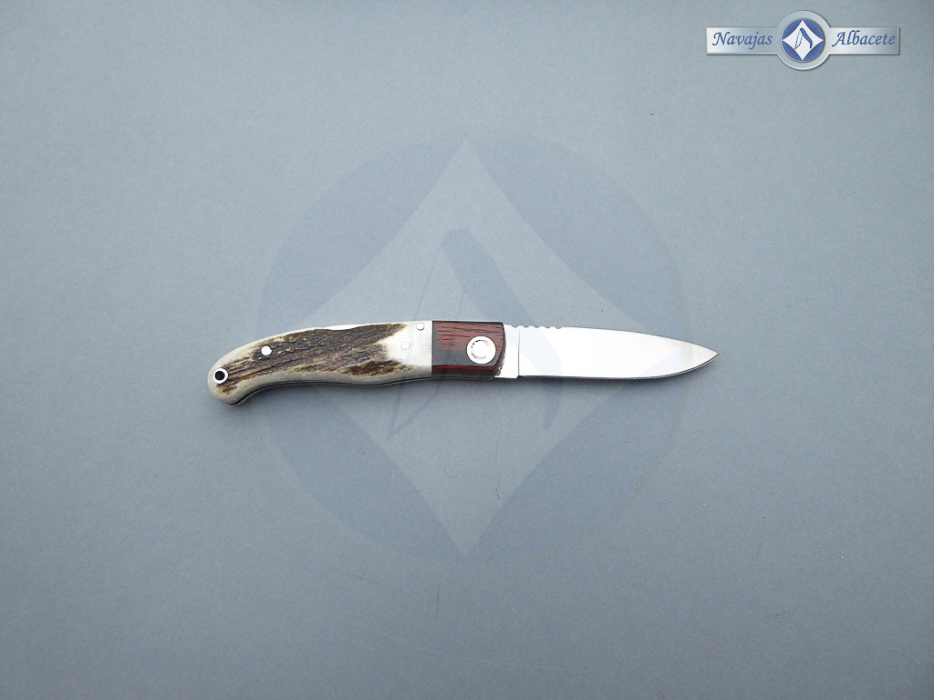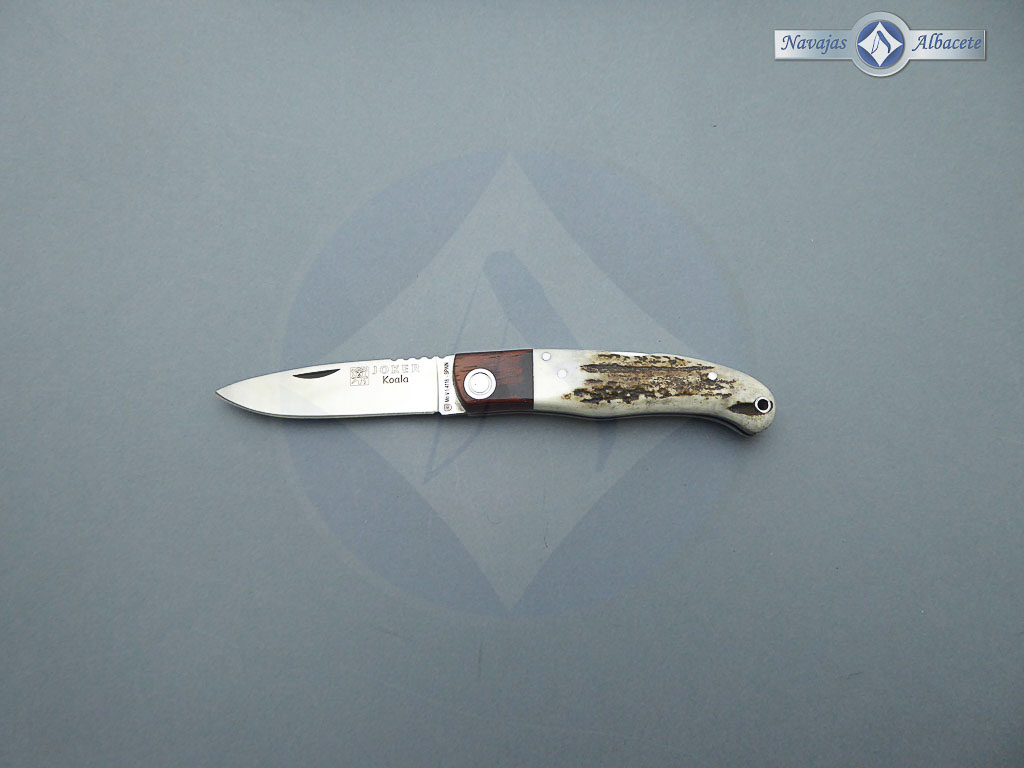 Descripción: Navaja deportiva «Koala» con puño en asta de ciervo y virola de madera de granadillo. Hecha a mano en Albacete. Hoja de acero inoxidable molibdeno vanadio de gran resistencia y dureza. Bloqueo de seguridad Back Lock. Agujero de acero en el pomo.