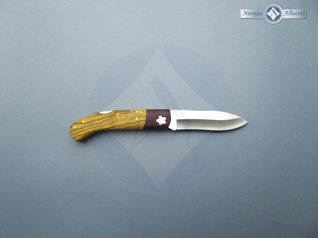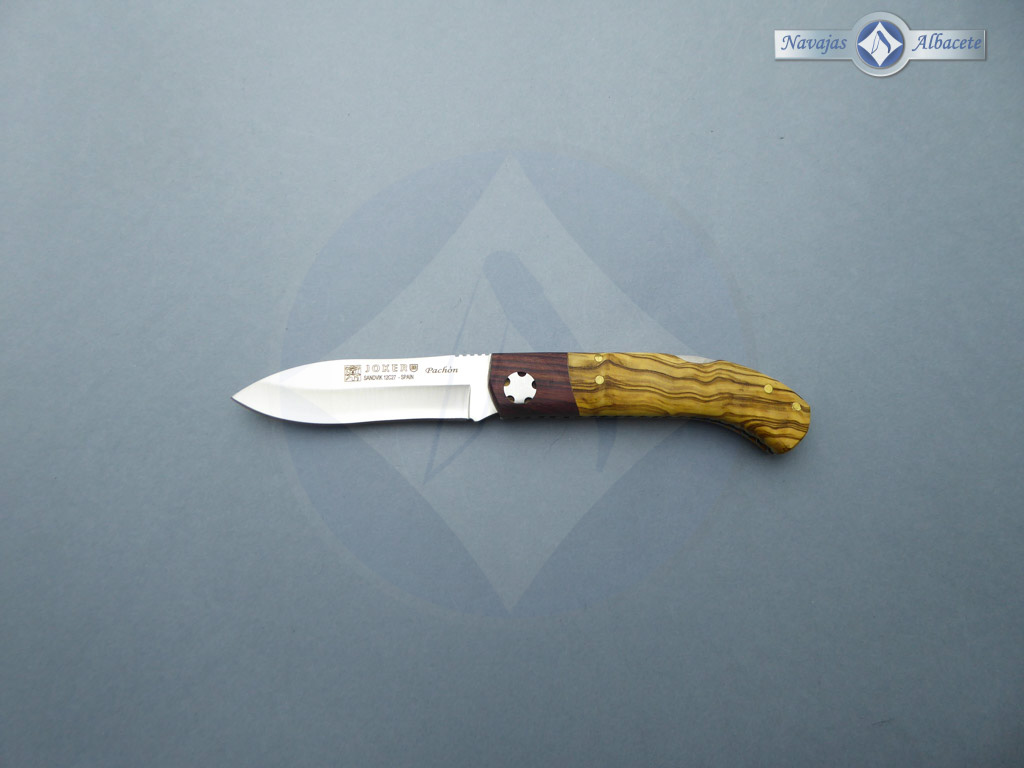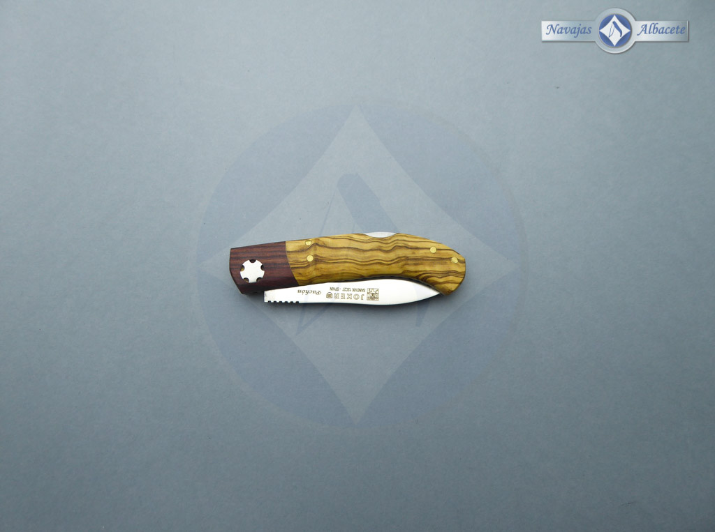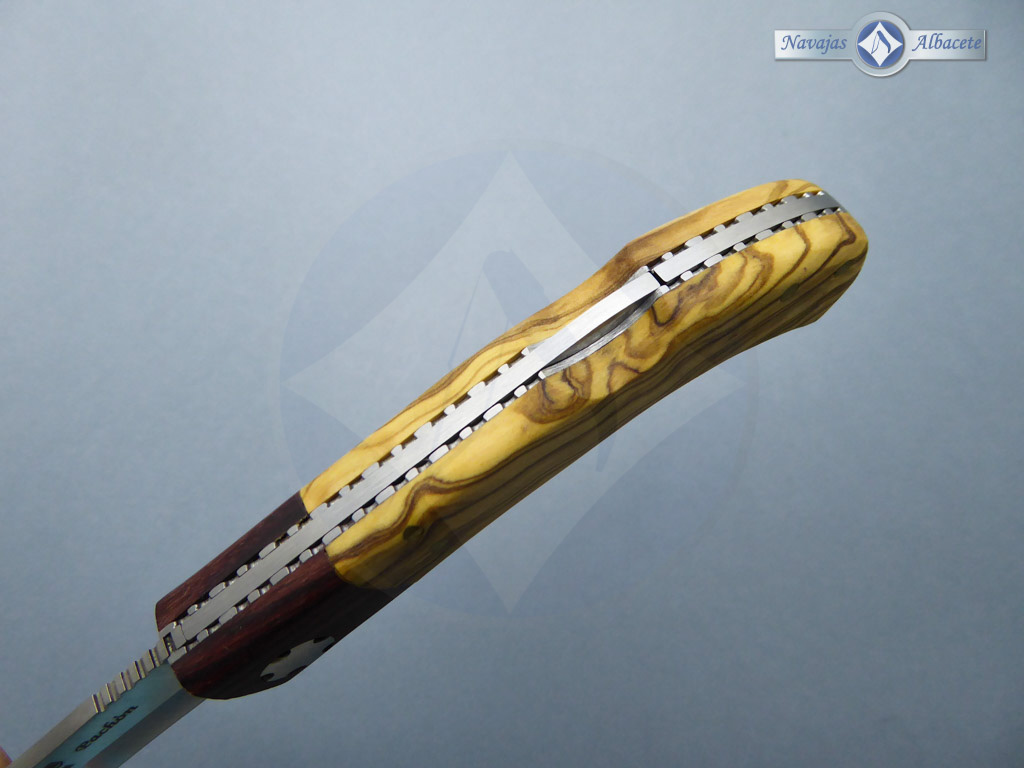 Descripción: Navaja deportiva «Pachón» con mango en madera de olivo y virola de palisandro. Lomo dentado. Hoja de acero Sandvik de gran resistencia. Hecha a mano en Albacete. Bloqueo de seguridad Back Lock.