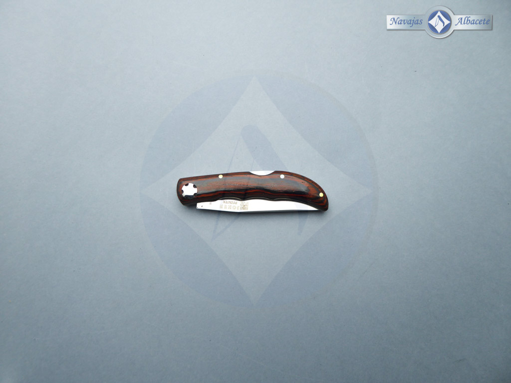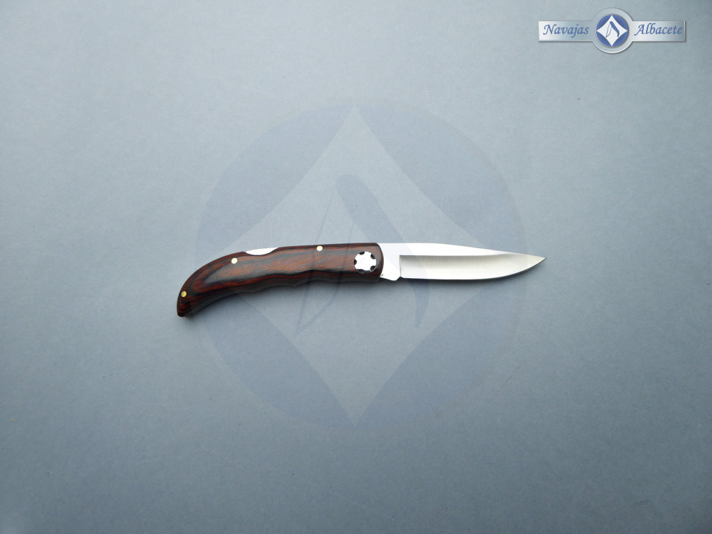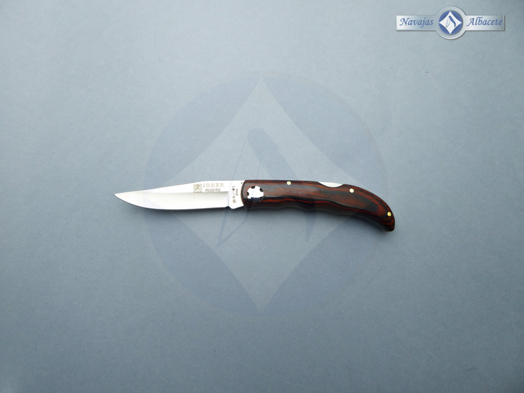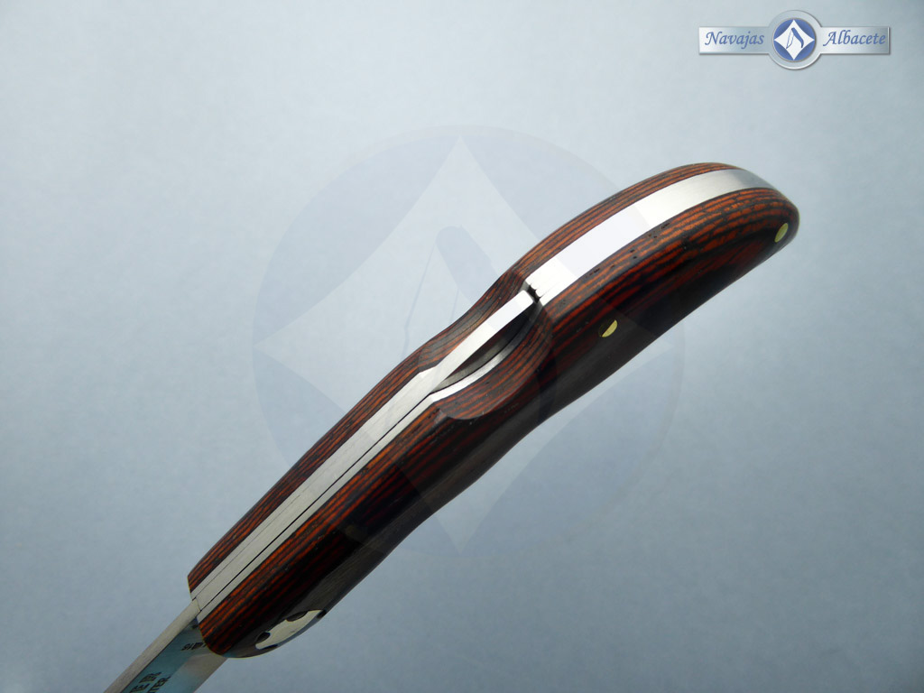 Descripción: Navaja artesana «Pointer» con mango en madera stamina color rojo. Hoja de acero inoxidable molibdeno vanadio. Hecha a mano en Albacete. Sistema de bloqueo Back Lock.