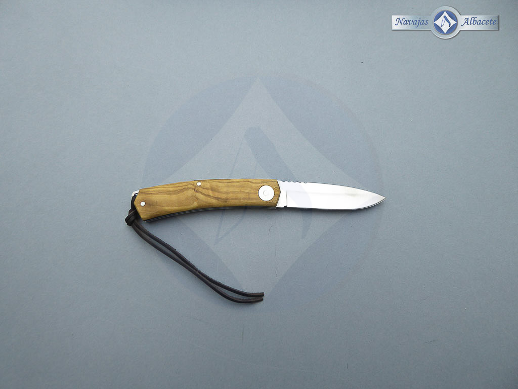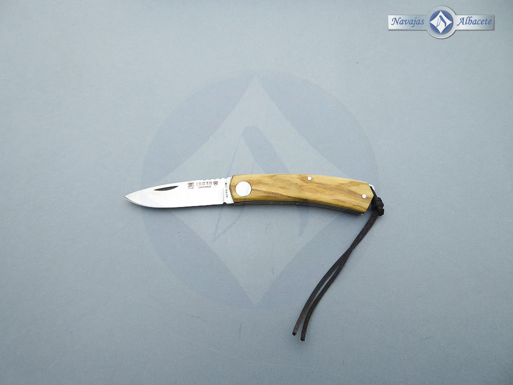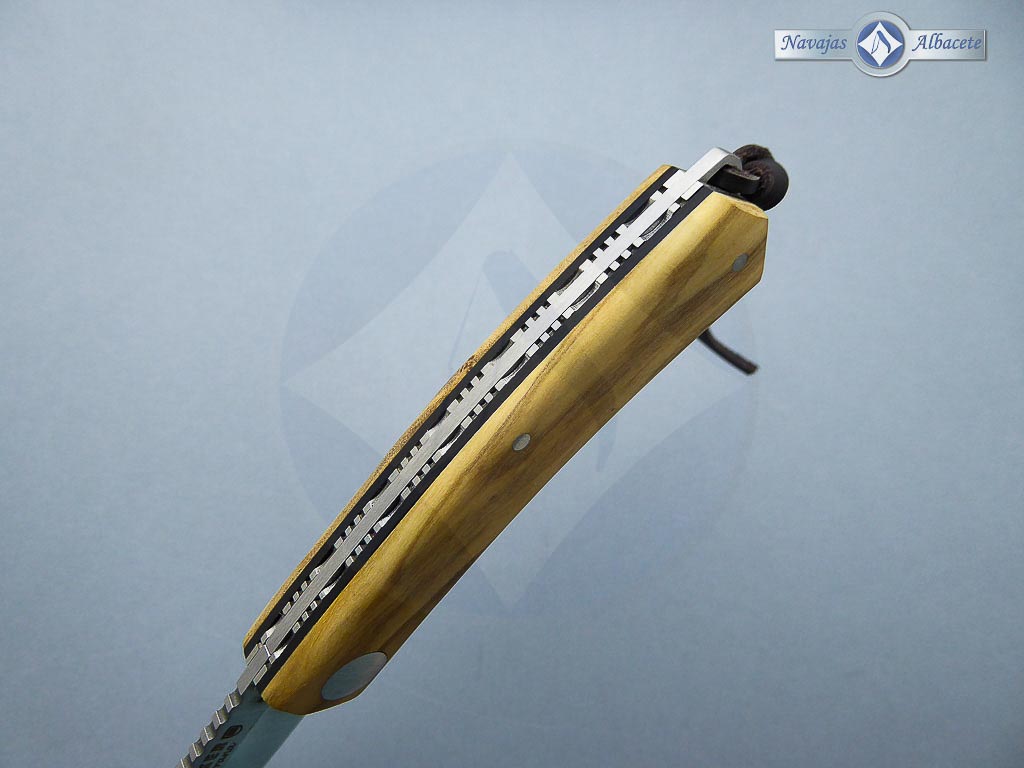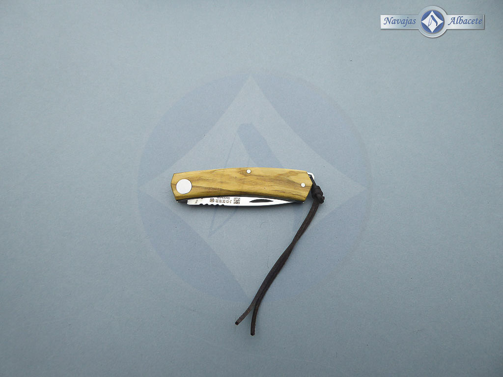 Descripción: Navaja deportiva «Serrana» con mango de madera de olivo, con separador negro. Hecha a mano en Albacete. Hoja de acero inoxidable molibdeno vanadio con uña para su fácil extracción. Cordón de cuero en el pomo.