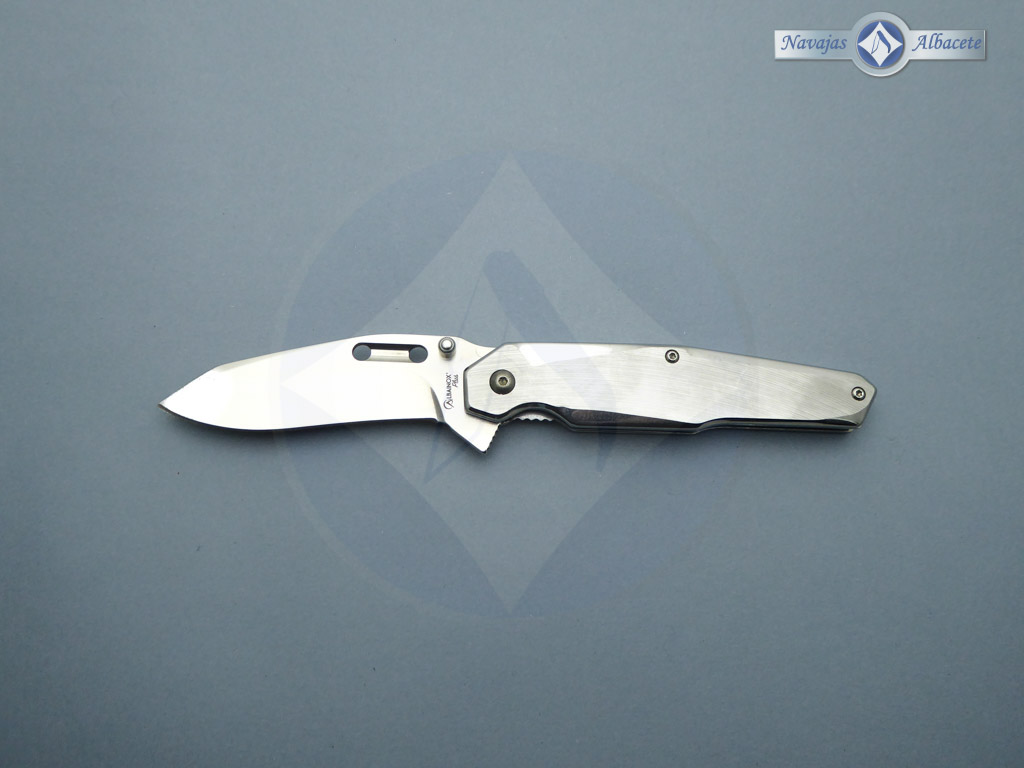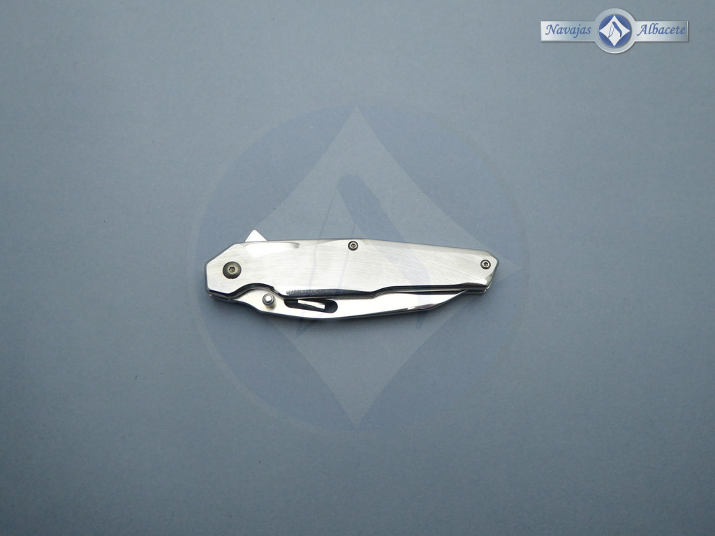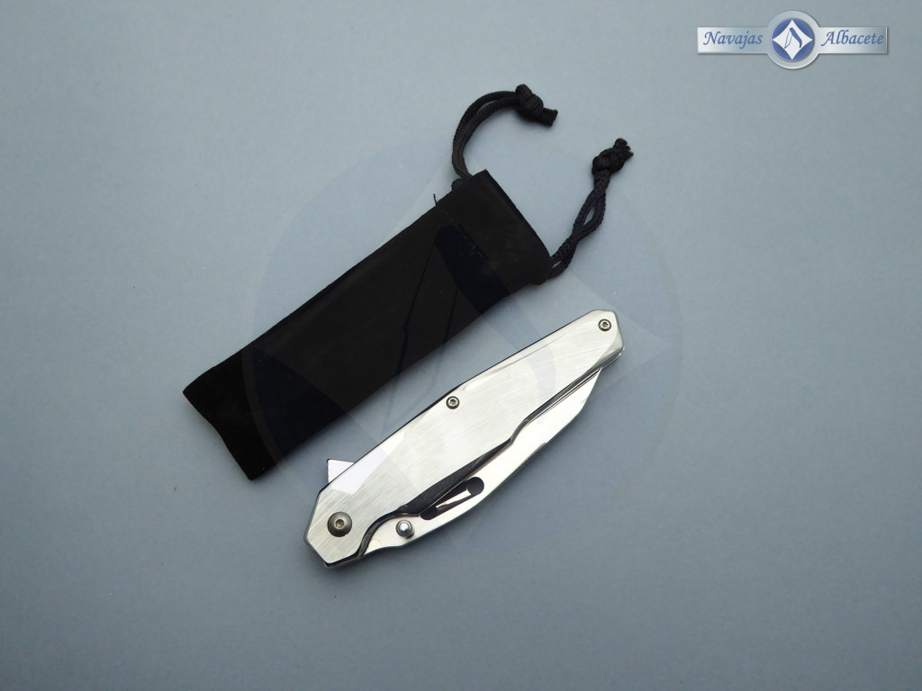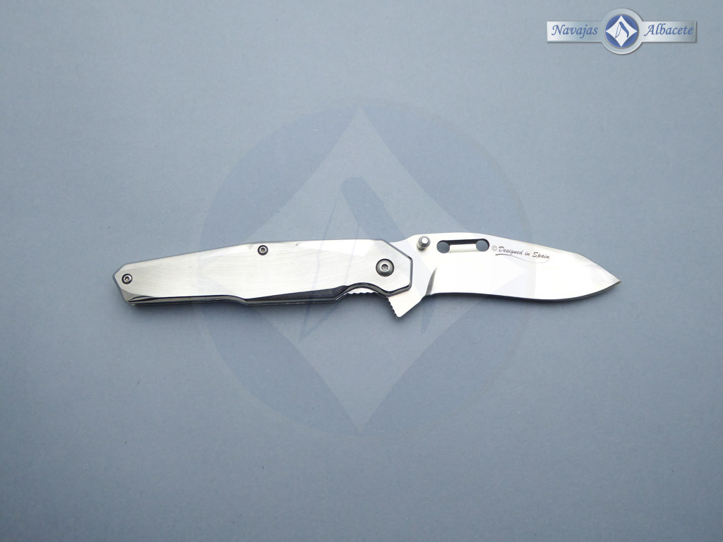 Descripción: Navaja táctica «Diamante» con mango de acero. Hoja de acero inoxidable molibdeno vanadio acabado espejo. Bloqueo de seguridad Liner lock. Diseñada en España. Incluye funda de terciopelo color negro.