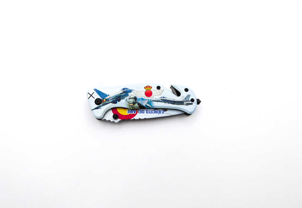 Descripción: Navaja táctica «Ejército del Aire» con mango en aluminio con impresión efecto 3D. Hoja en acero molibdeno vanadio con impresión fotográfica efecto 3D. Punta rompecristales, clip porta cinturón, bloqueo de seguridad liner lock y cúter corta cinturón de una cuchilla. Diseñada en España.