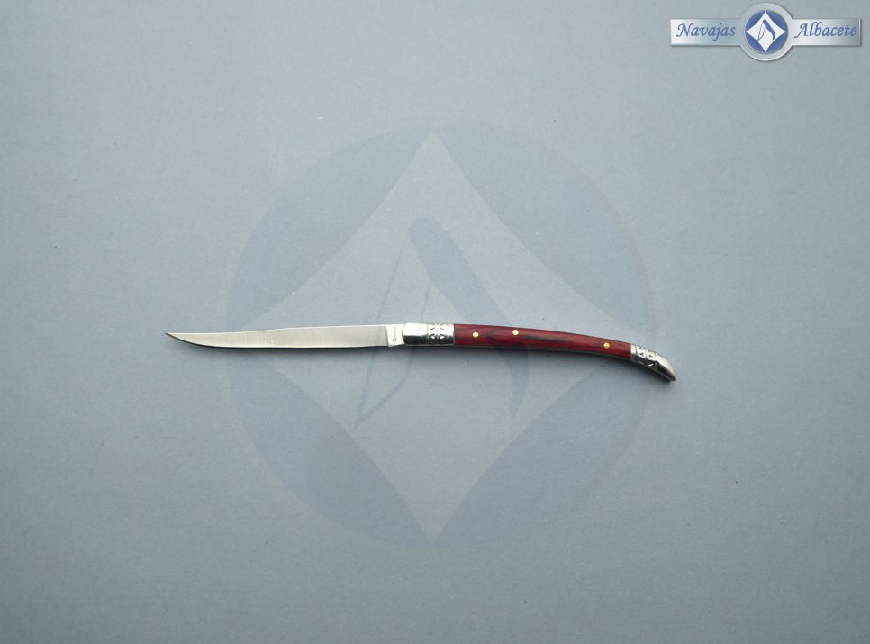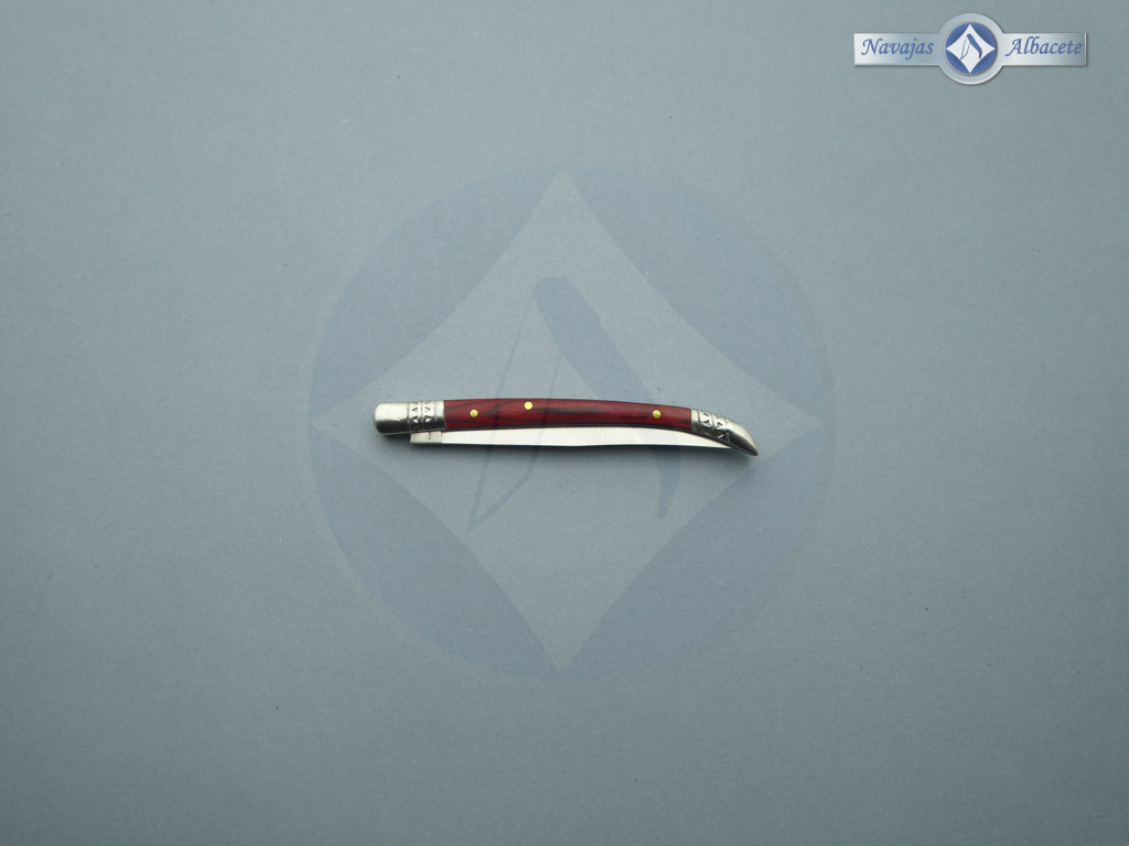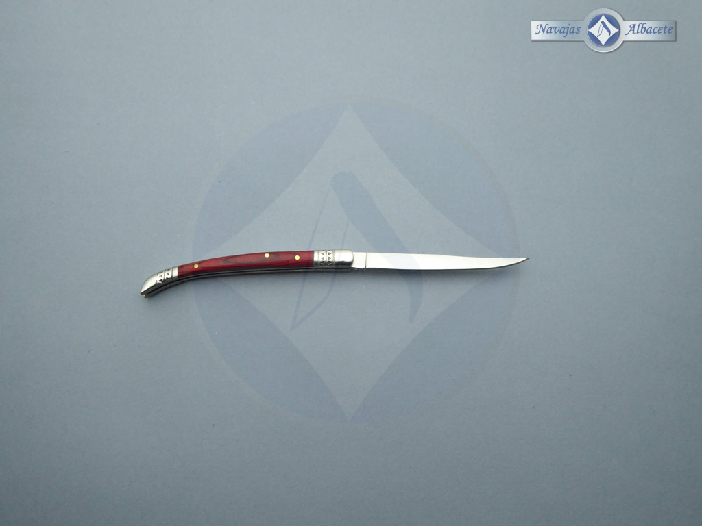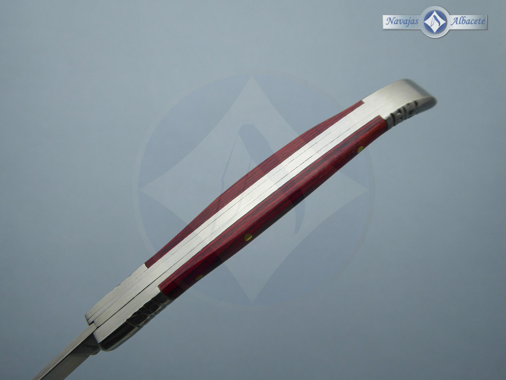 Descripción: Navaja estilete con mango de madera stamina roja, virola y rebajo en acero. Hoja de acero inoxidable molibdeno vanadio. Cierre de pistón. Disponible en distintos tamaños de hoja, seleccione la opción que desee.