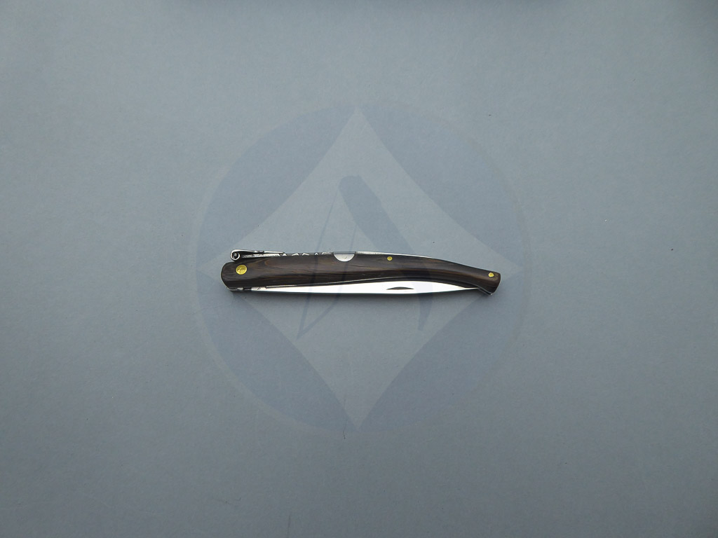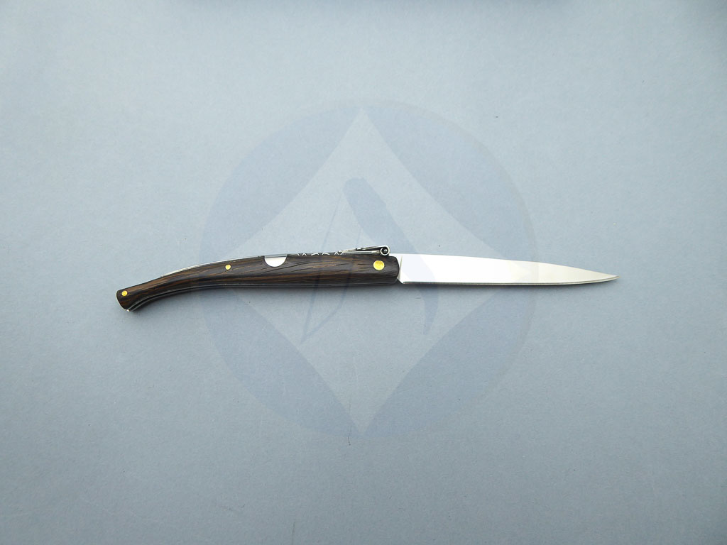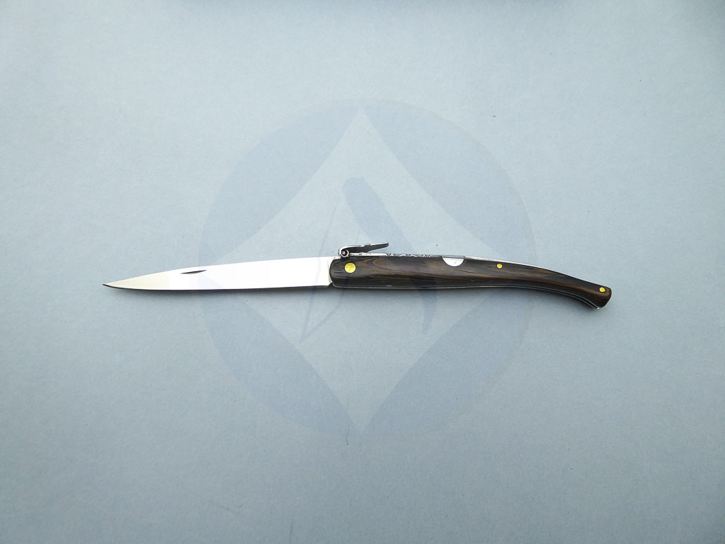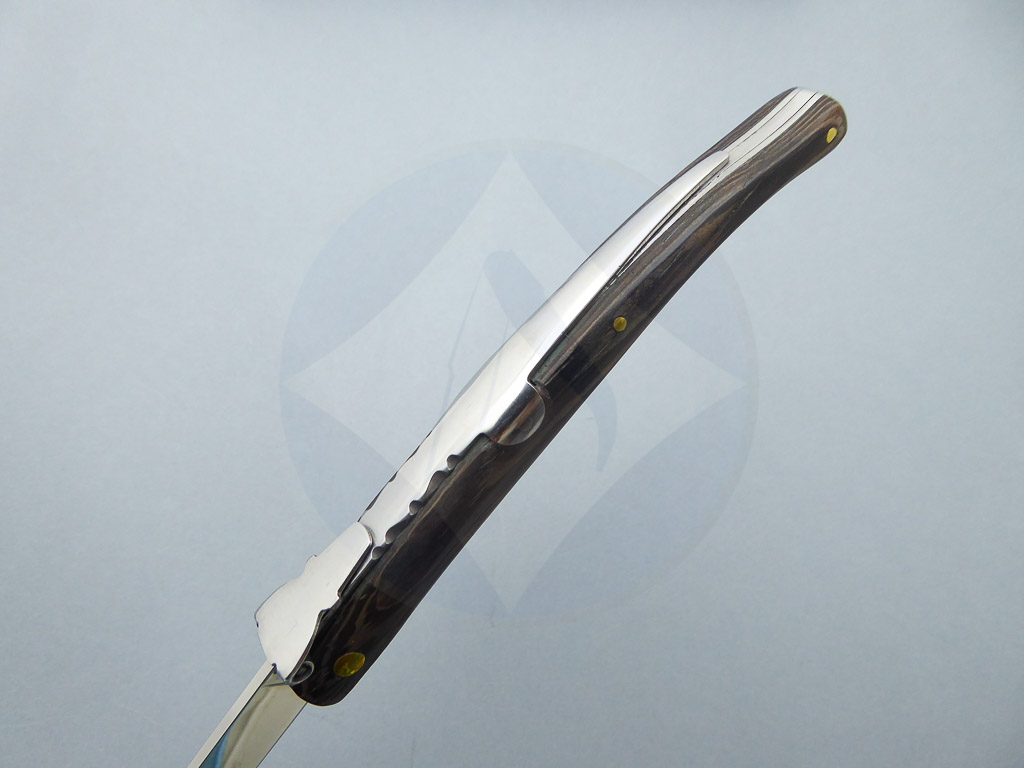 Descripción: Navaja estilete con mango de madera wengue. Hoja de acero inoxidable molibdeno vanadio. Sistema de cierre de palanquilla. Diseñada en España. Disponible en 2 tamaños de hoja, seleccione la opción que desee.