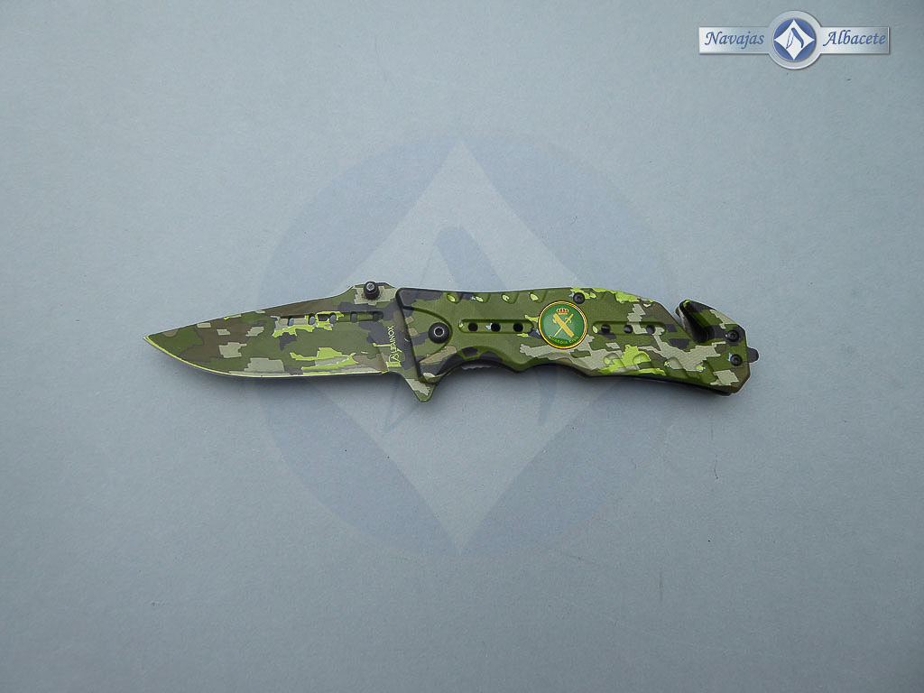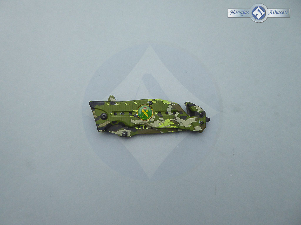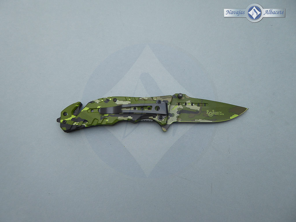 Descripción: Navaja táctica con mango de fibra engomada color camuflaje. Hoja en acero molibdeno vanadio calada. Punta rompecristales, clip porta cinturón, bloqueo de seguridad linear lock y cúter corta cinturón de una cuchilla.