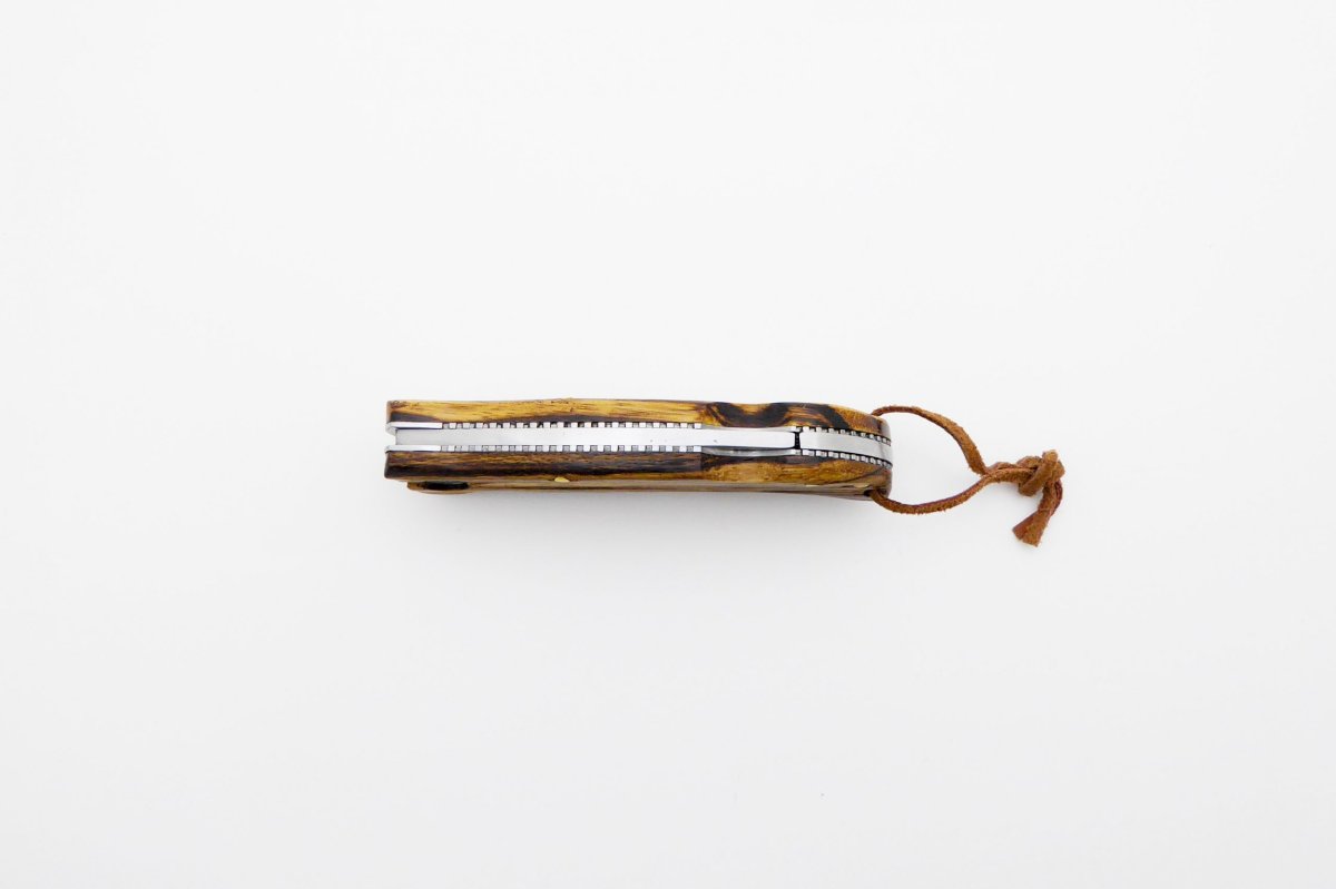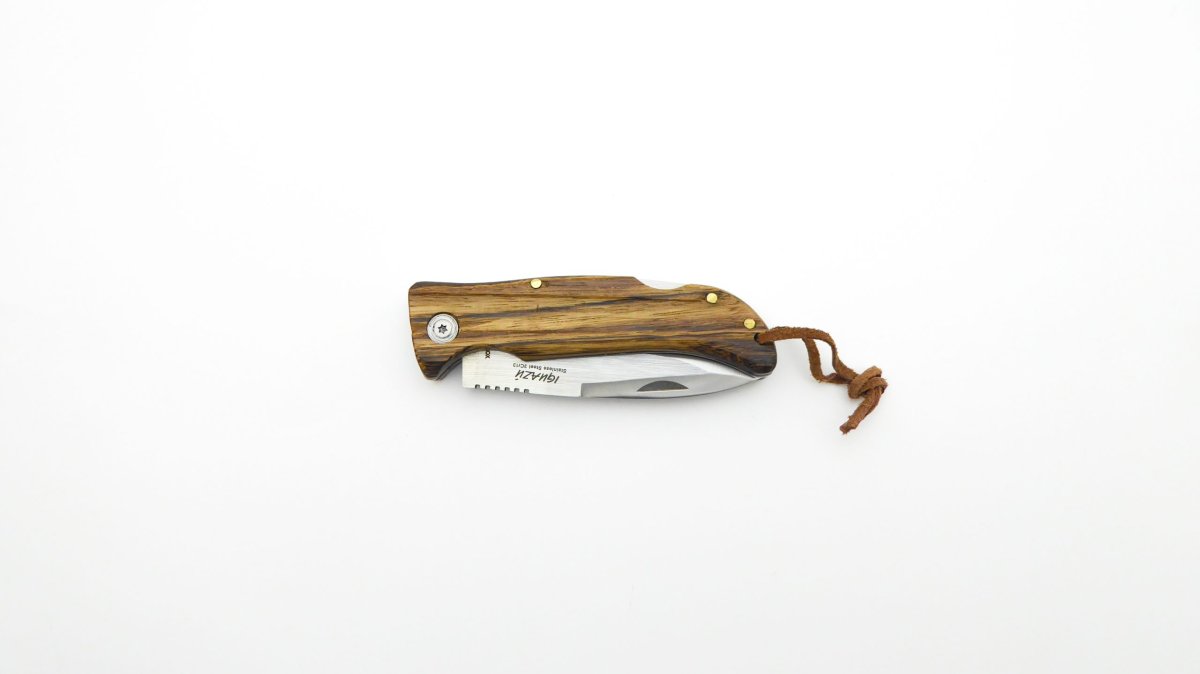 Descripción: «Iguazú» Navaja de monte con mango en madera Zebra. Hoja de acero inoxidable molibdeno vanadio acabado sanitado. Con uña para su fácil extracción. Sistema de bloqueo Back Lock. Incluye cordón de cuero. Diseñada en España.